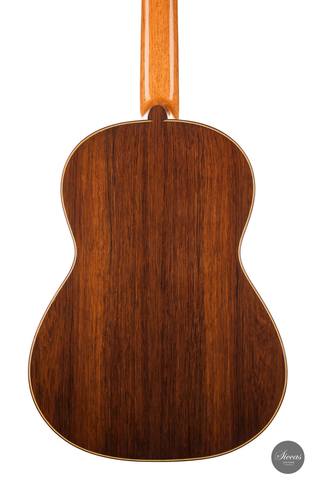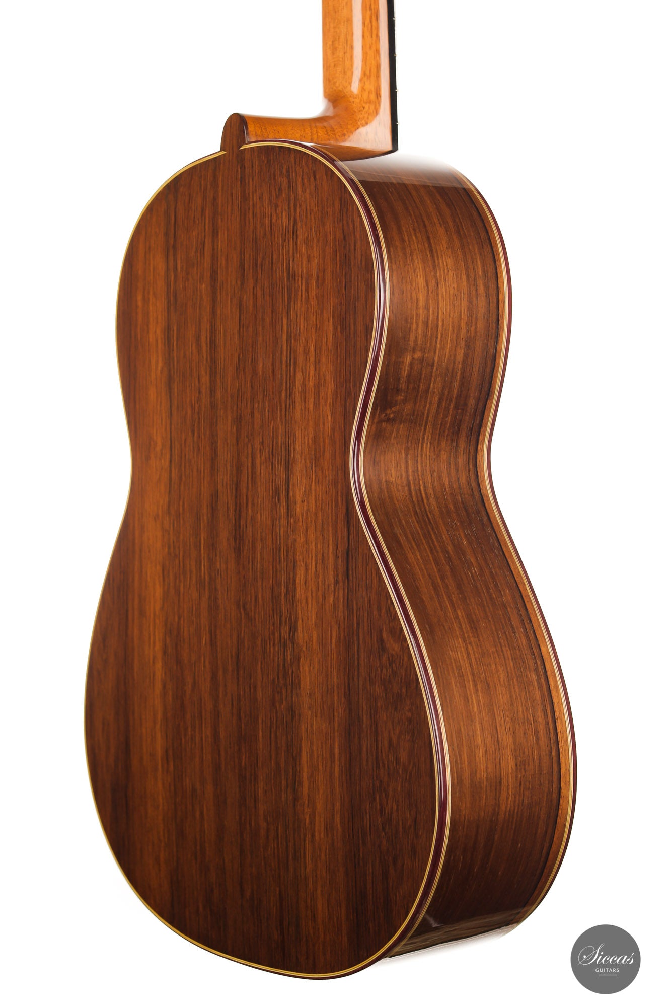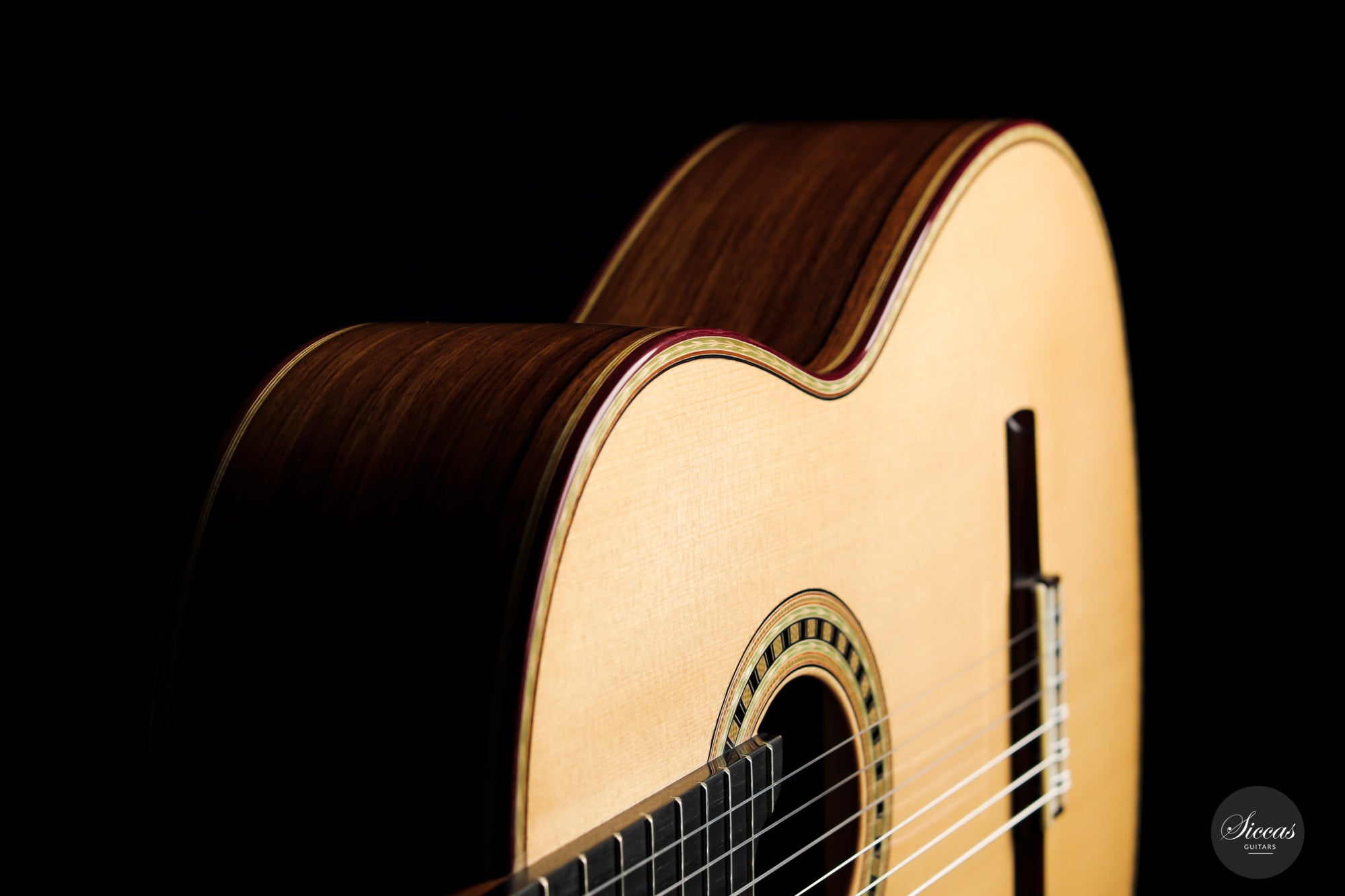 This concert model is built with premium tone woods, spruce on beautiful Madagascar rosewood. In this case, the guitar is constructed with double sides, the inner layer being cypress, which gives the guitar a gentle floral and almost beguiling scent. Due to the double sides, this Spanish guitar has a great projection and a pleasant punch. One can perform a wide range of repertoire on this wonderful instrument, as it not only has a powerful tone and excellent separation, but also responds very flexibly and dynamically. In addition, there is exquisite craftsmanship and great attention to detail.