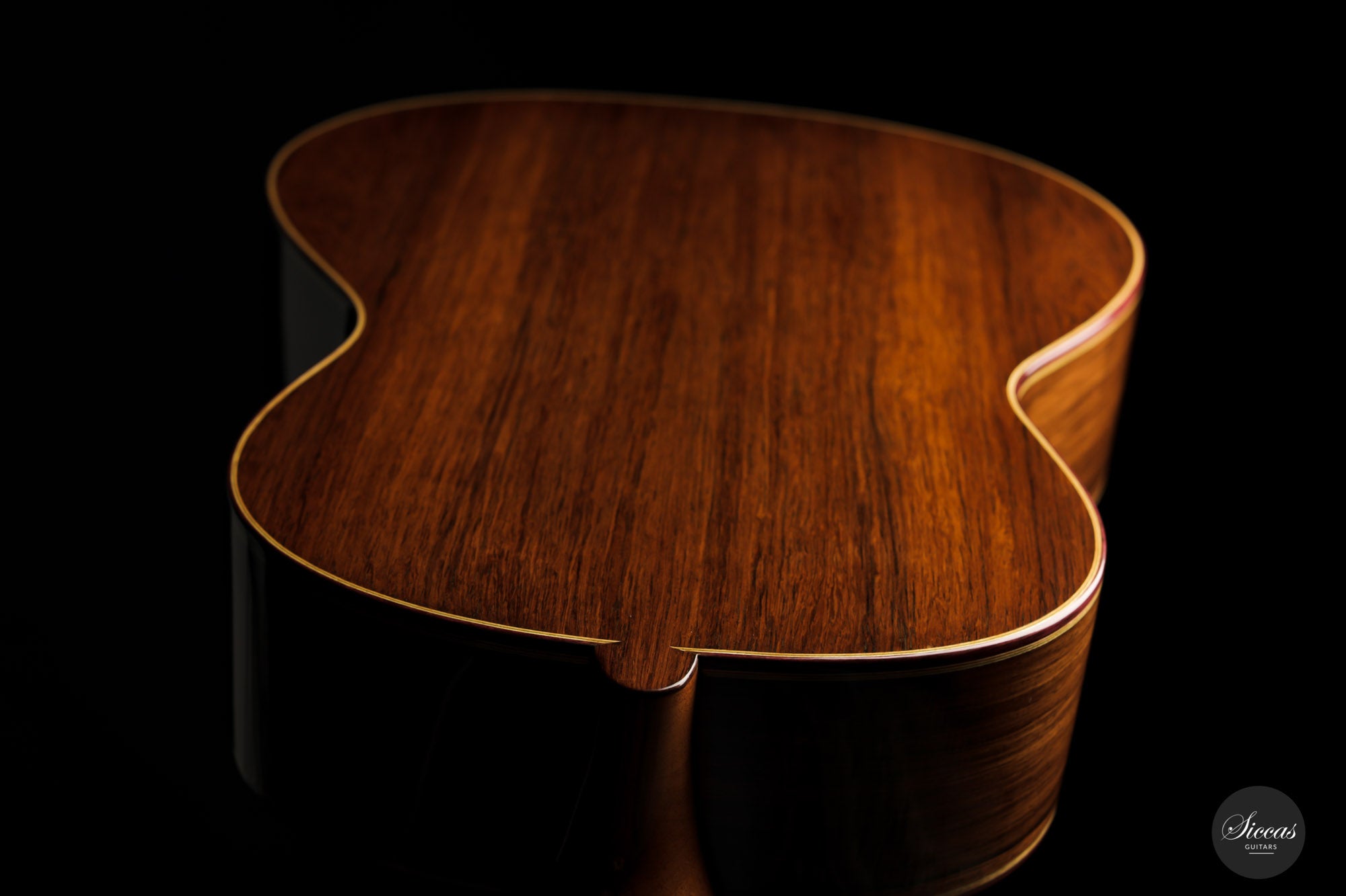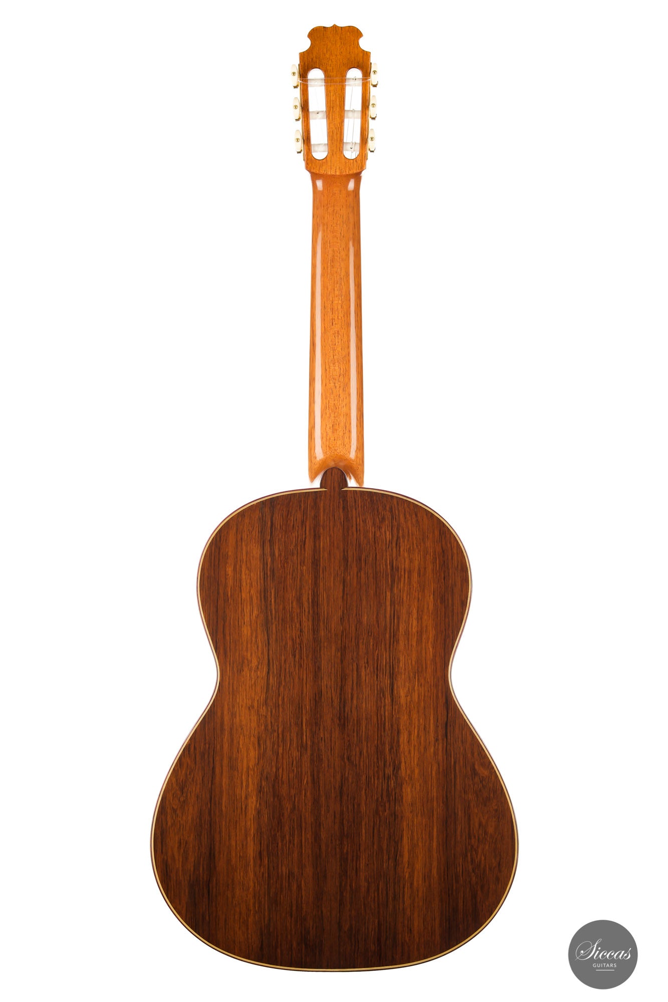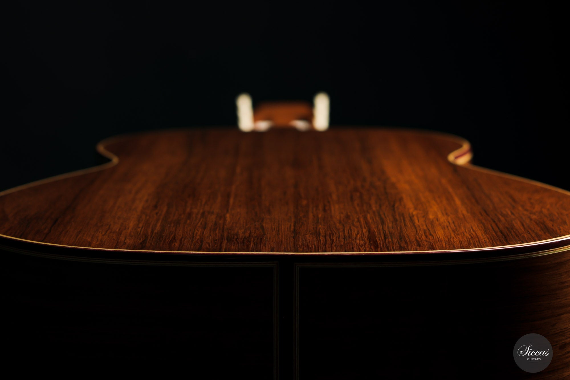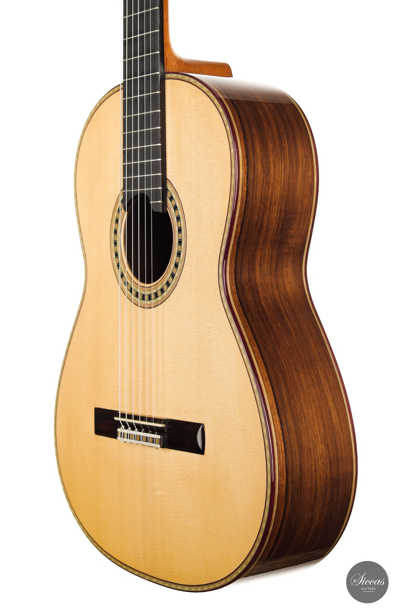This concert model is built with premium tone woods, spruce on beautiful Madagascar rosewood. In this case, the guitar is constructed with double sides, the inner layer being cypress, which gives the guitar a gentle floral and almost beguiling scent. Due to the double sides, this Spanish guitar has a great projection and a pleasant punch. One can perform a wide range of repertoire on this wonderful instrument, as it not only has a powerful tone and excellent separation, but also responds very flexibly and dynamically. In addition, there is exquisite craftsmanship and great attention to detail.