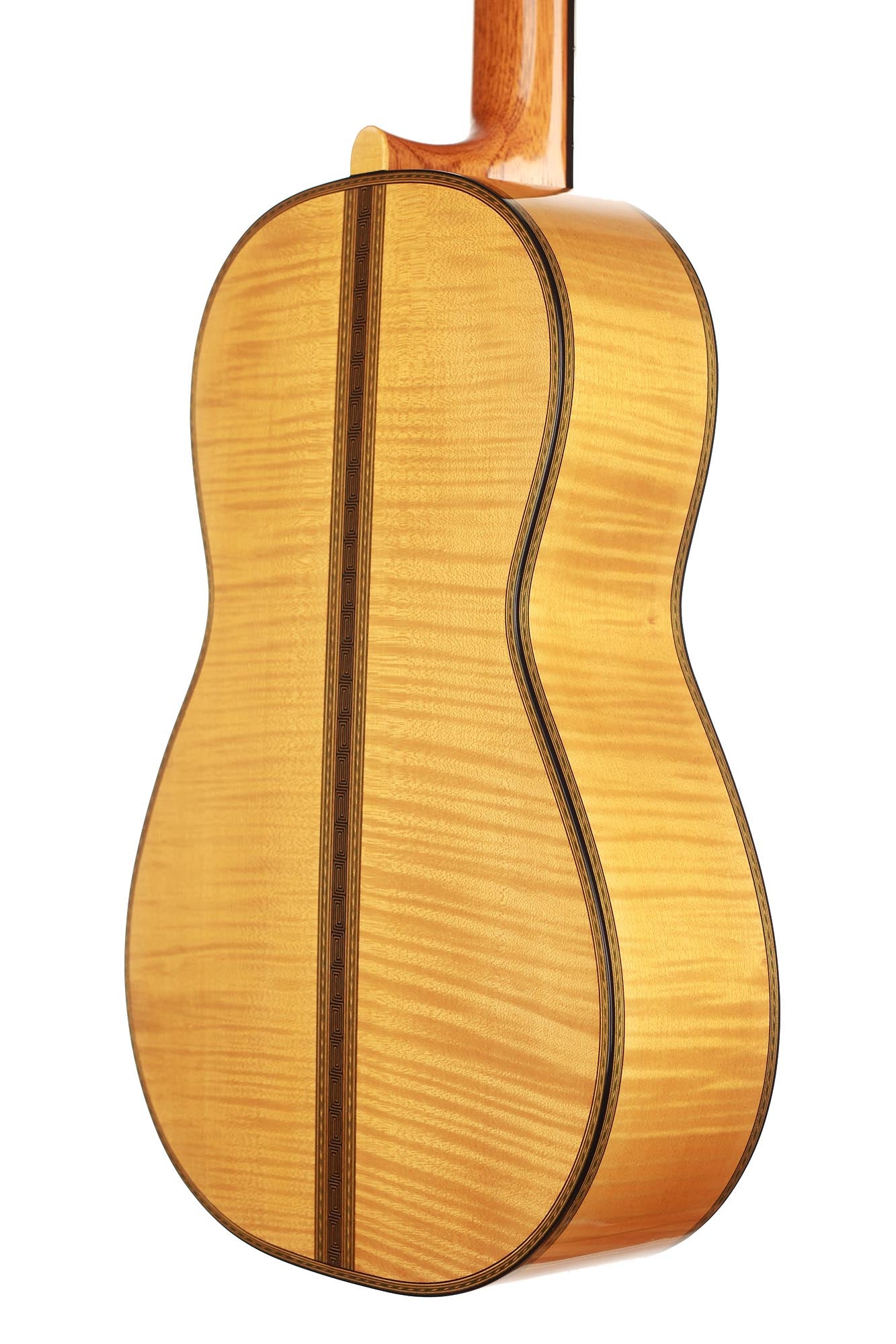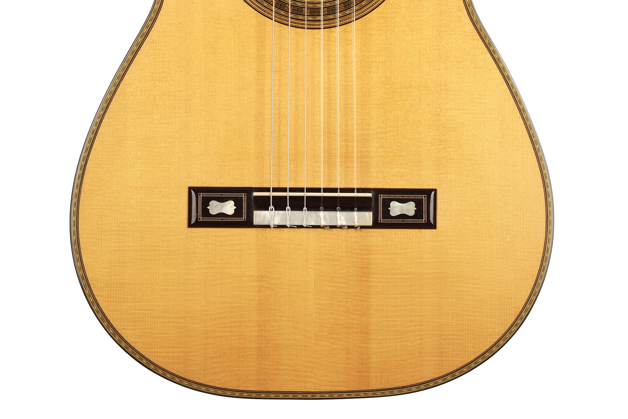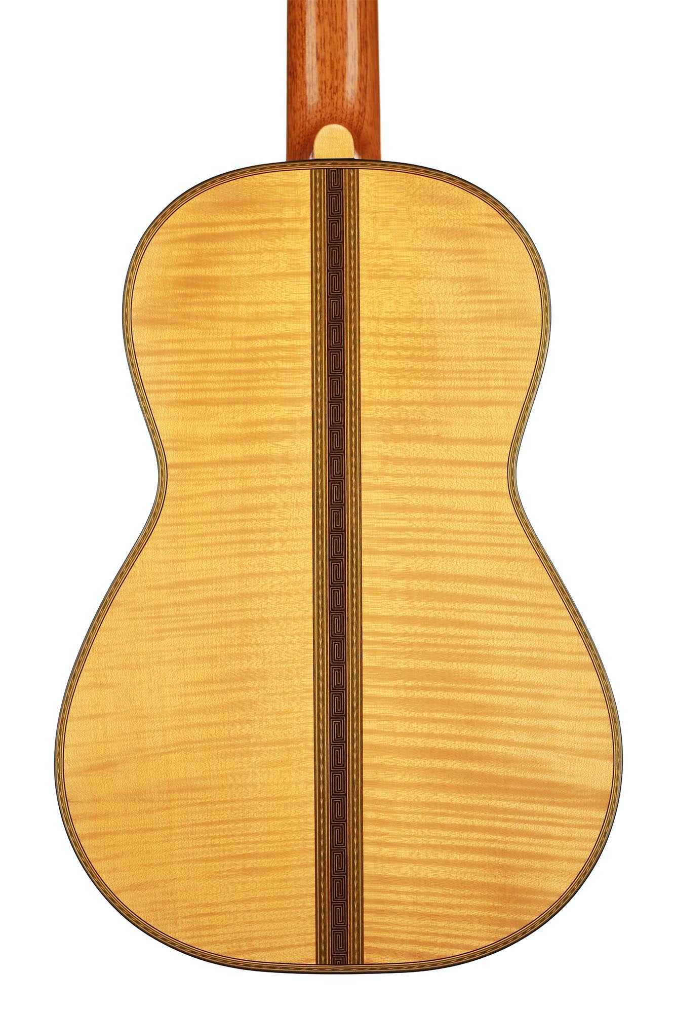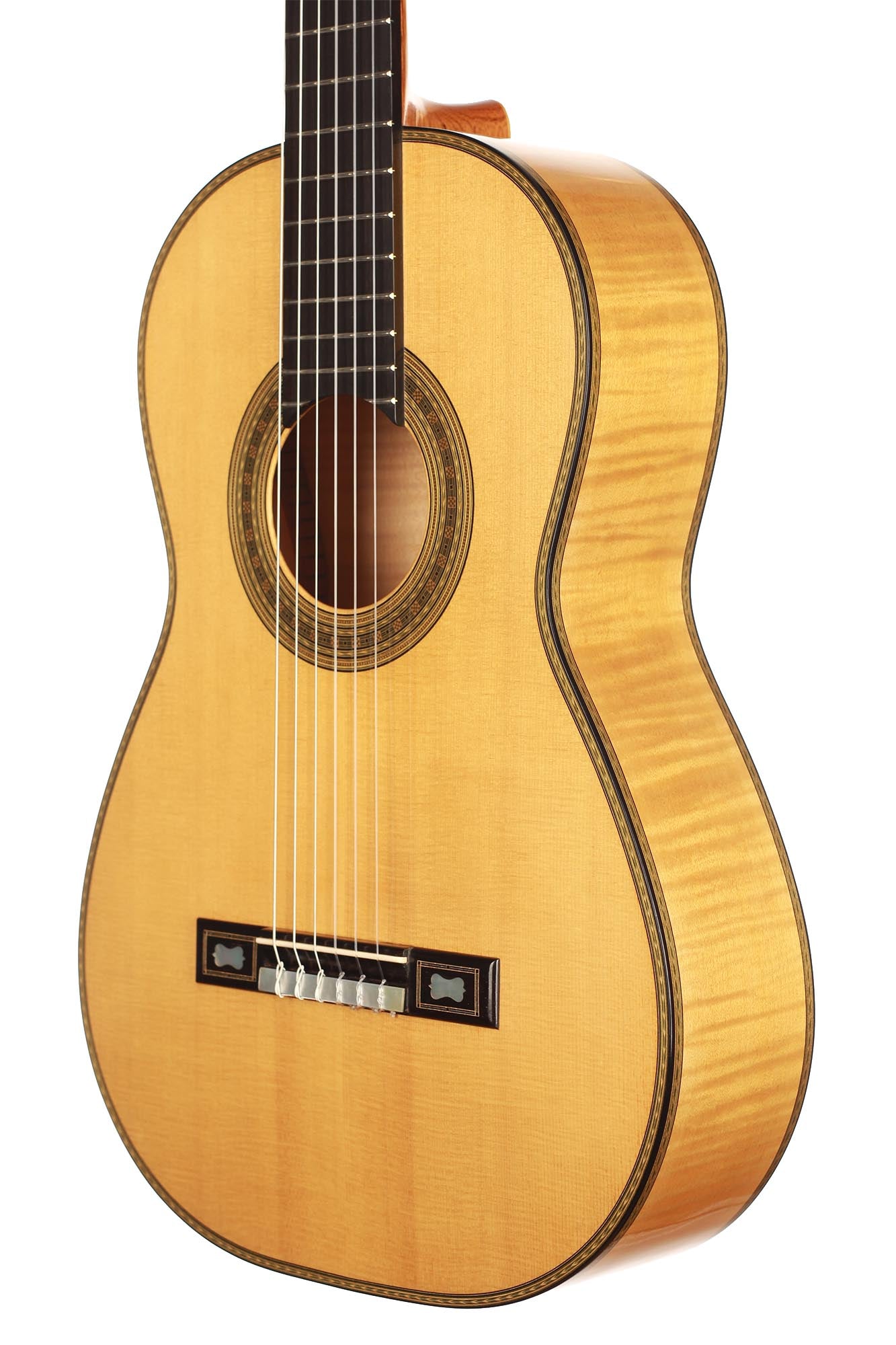 Despite its smaller body shape, this Torres model has great dynamic possibilities and can confidently stand up to guitars with a larger body. She has a beautiful deep voice with velvety texture, rich in overtones and yet very clear overall character. In addition, the playability is perfect so that it can be played with the least effort. This masterpiece is a beautiful tribute to Antonio de Torres built by one of the best North American guitar builders of our time.