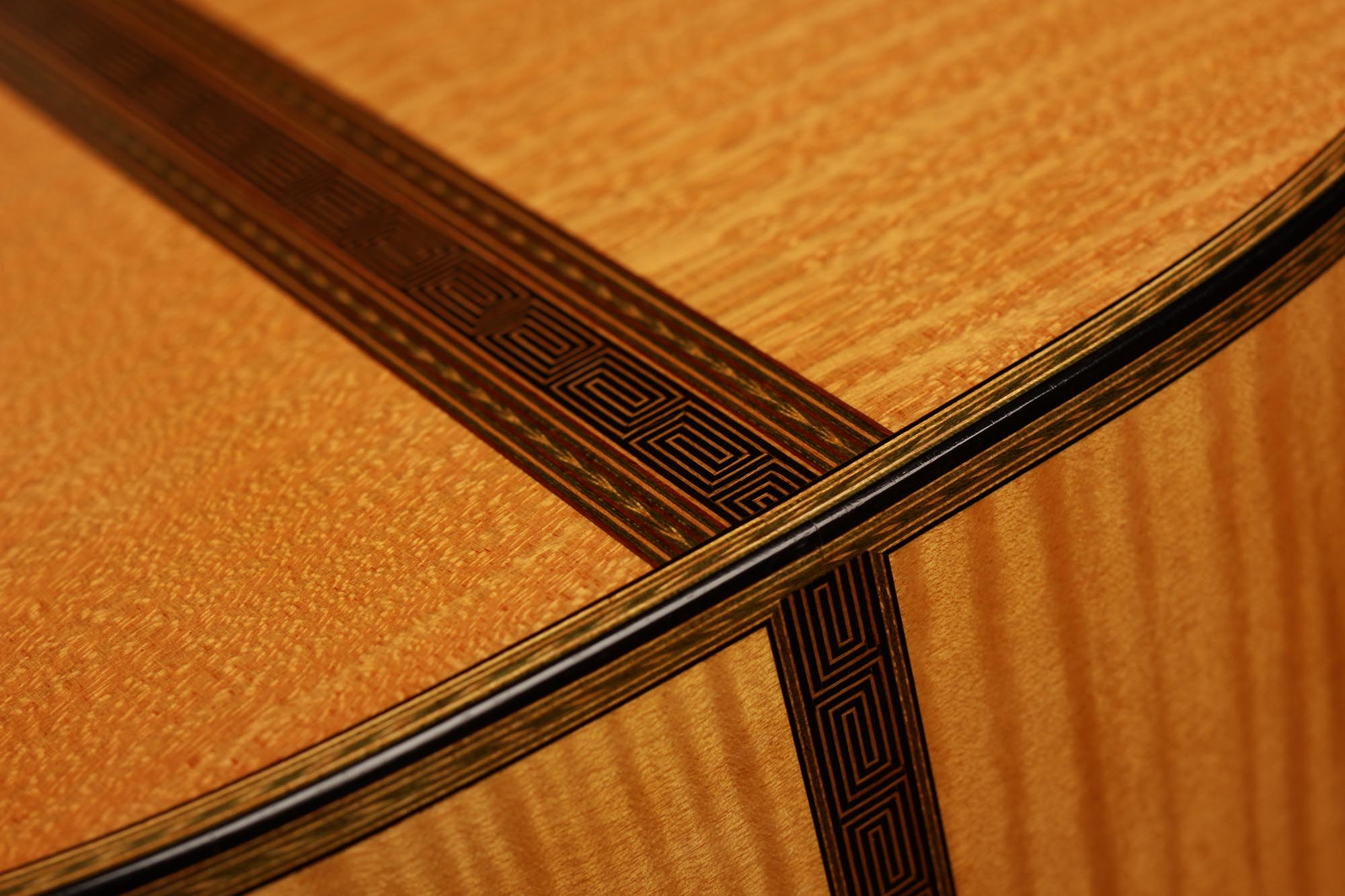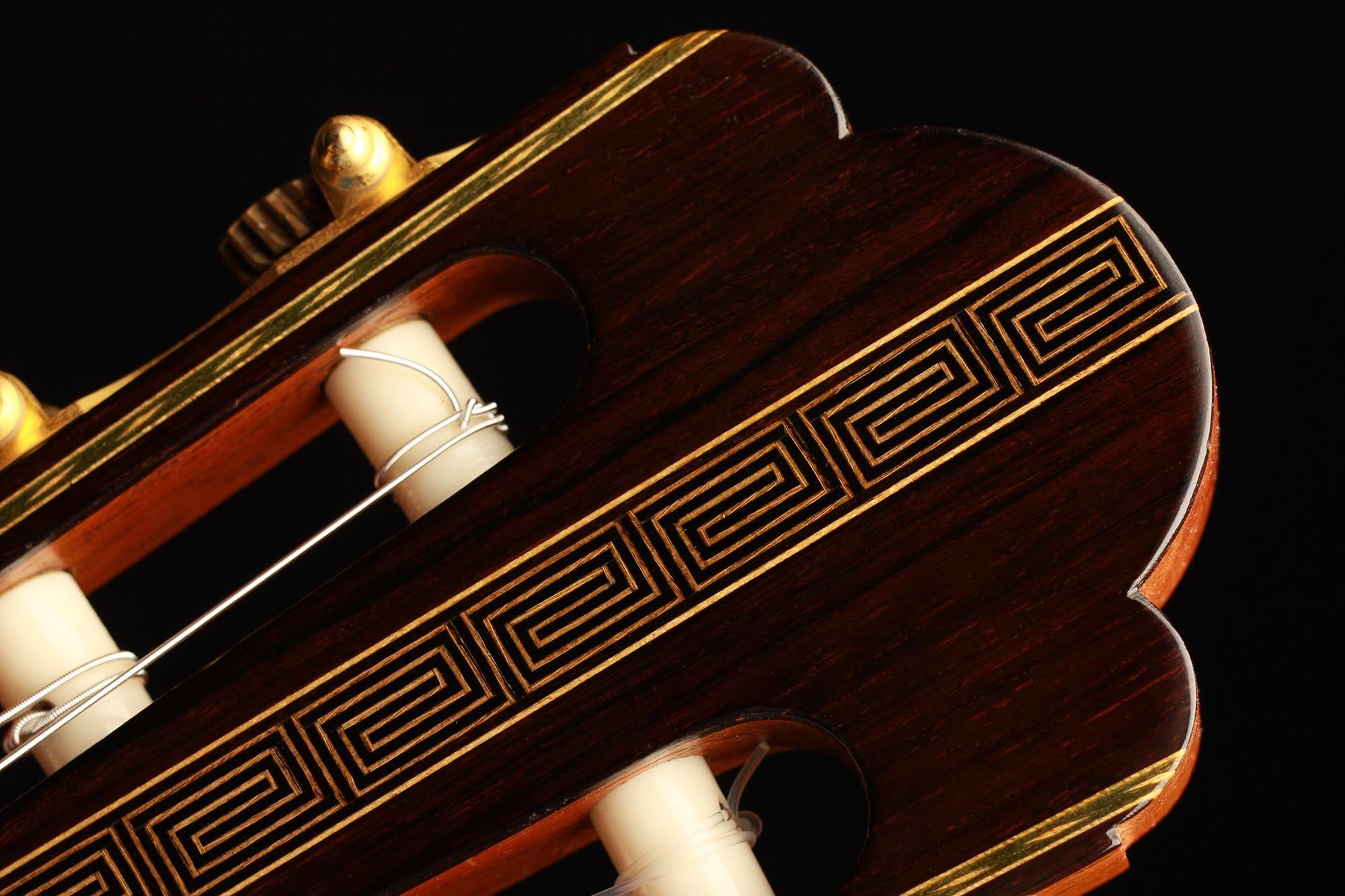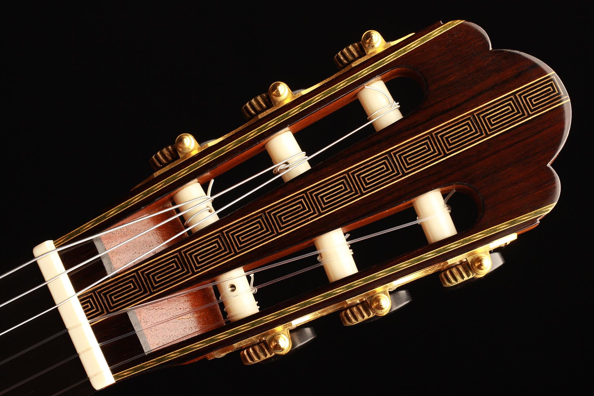 This beautiful guitar is a replica of Francisco Tarregas first Antonio de Torres guitar. The original 1864 instrument, designated FE17 in the catalogue of J. L. Romanillos, is richly decorated and features most of the decorative motifs used by A. de Torres during his career, such as the meander (a Greek orthoganels ornament), fine green and white herringbones, the chessboard pattern and the lozenge. This 2007 Daryl Perry instrument, bearing the number 139, is in almost perfect condition with no cracks or repairs and almost no traces of playing on the shellac. The guitar comes with the original Calton case.