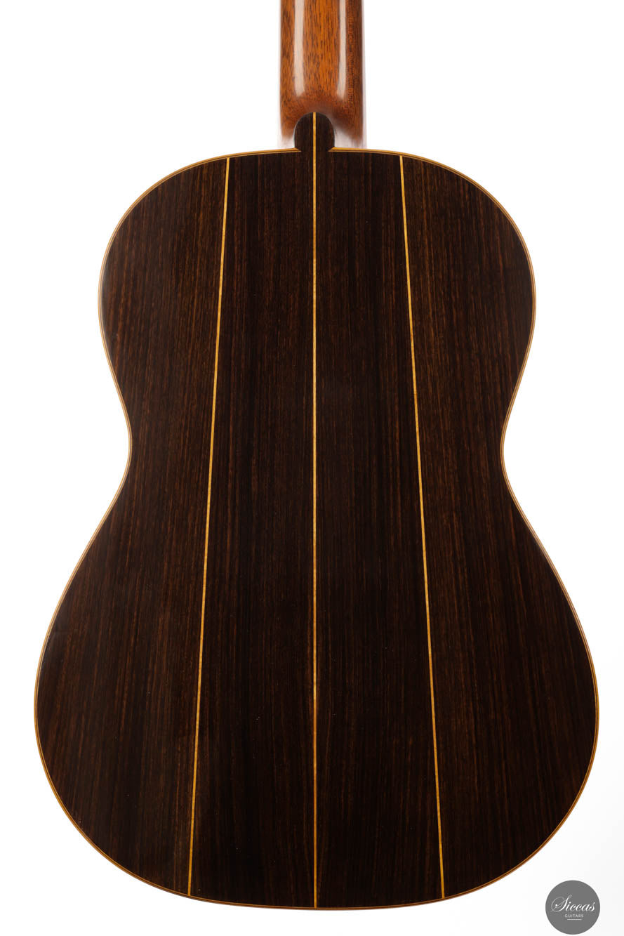 Die 2017er Daryl Perry Gitarre Nr. 221 ist eine bemerkenswerte Verbindung aus traditionellem Design und zeitgenössischer Gitarrenbaukunst, die die außergewöhnlichen Fähigkeiten von Daryl Perry zeigt, einem Namen, der für Spitzeninstrumentenbau geschätzt wird. Diese Gitarre fesselt sofort mit ihrer gereiften Fichtendecke, harmonisch gepaart mit klassischem indischem Palisander für Rücken und Seiten, was ein optisch ansprechendes und zeitloses Design präsentiert. Ihr Aussehen ist jedoch nur der Anfang ihrer Anziehungskraft. Obwohl sie ein vorgeliebtes Instrument ist, bleibt sie in ausgezeichnetem Zustand, wobei jegliche oberflächlichen Markierungen lediglich zu ihrem ästhetischen Charme und ihrer Geschichte beitragen. Diese leichten Anzeichen früherer Liebe und Nutzung schmälern ihre Schönheit nicht, sondern fügen dem Instrument eine Schicht Charakter hinzu und erzählen eine Geschichte ihrer geschätzten Vergangenheit.