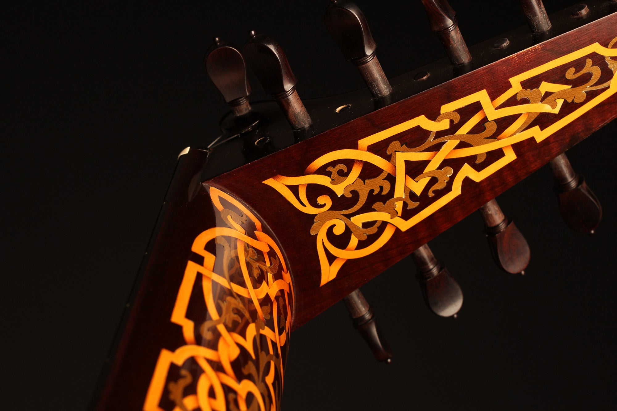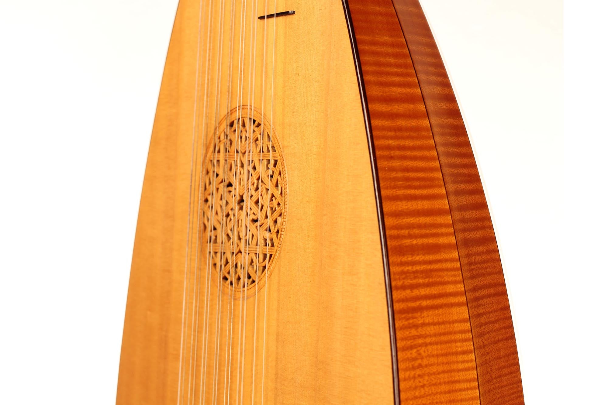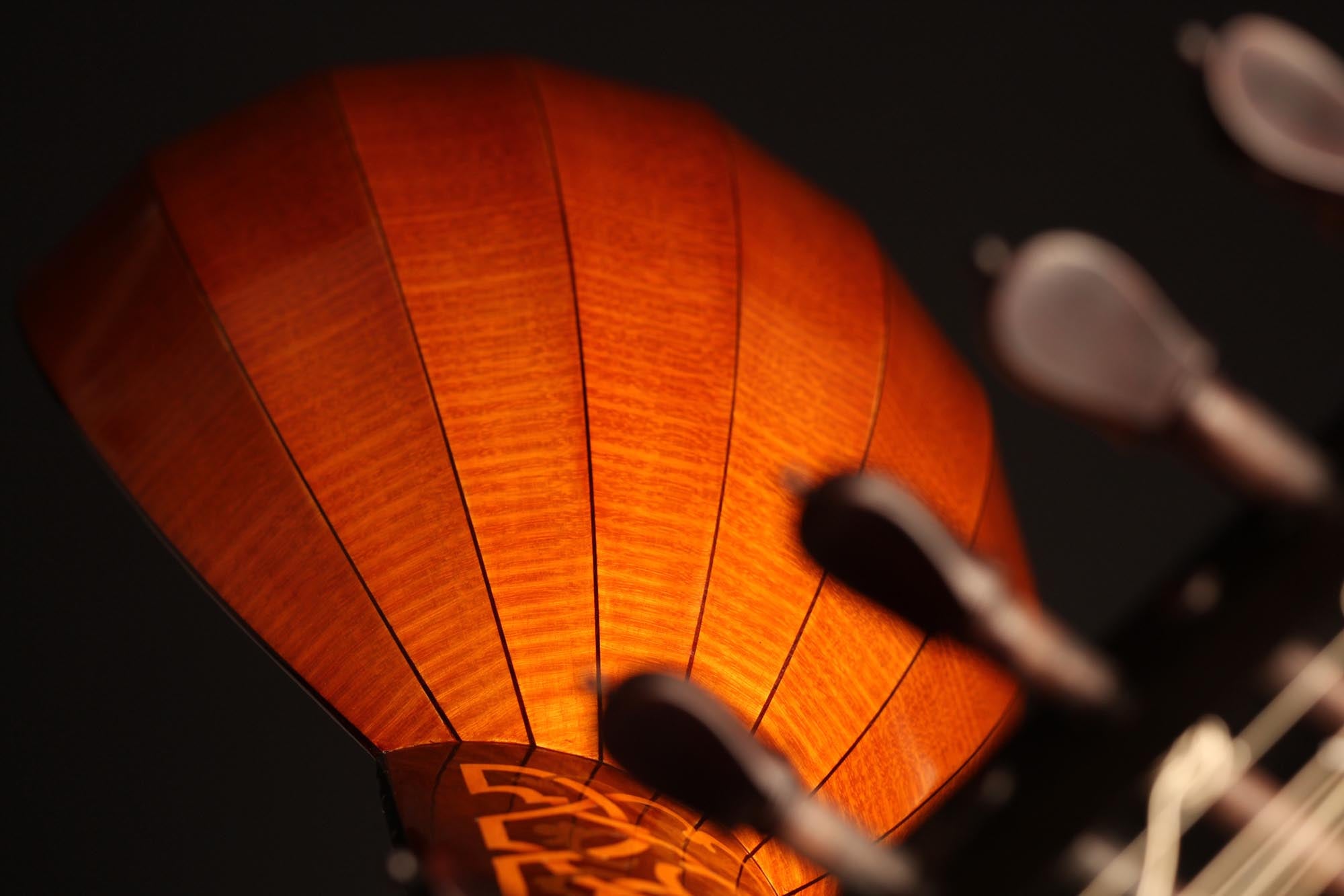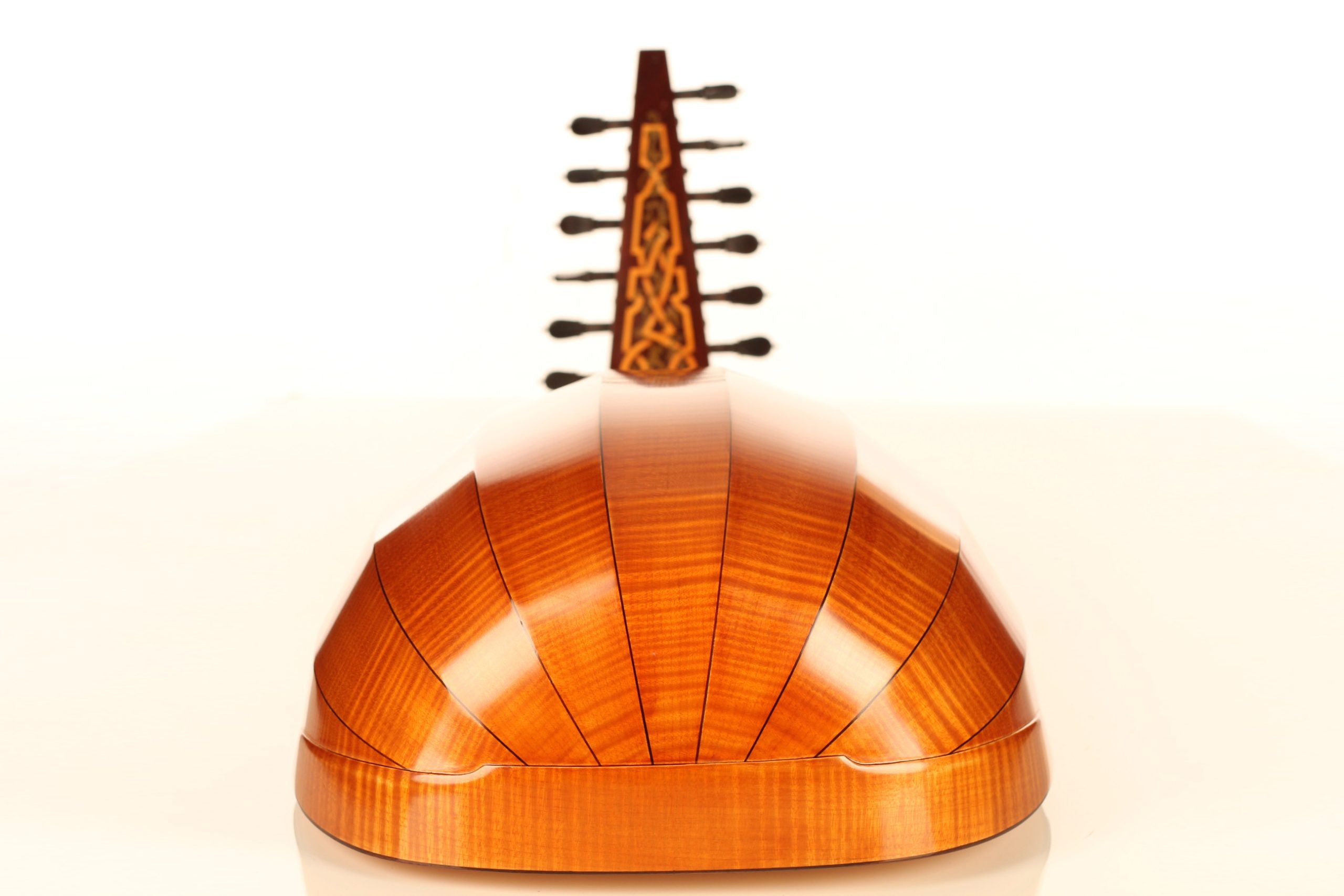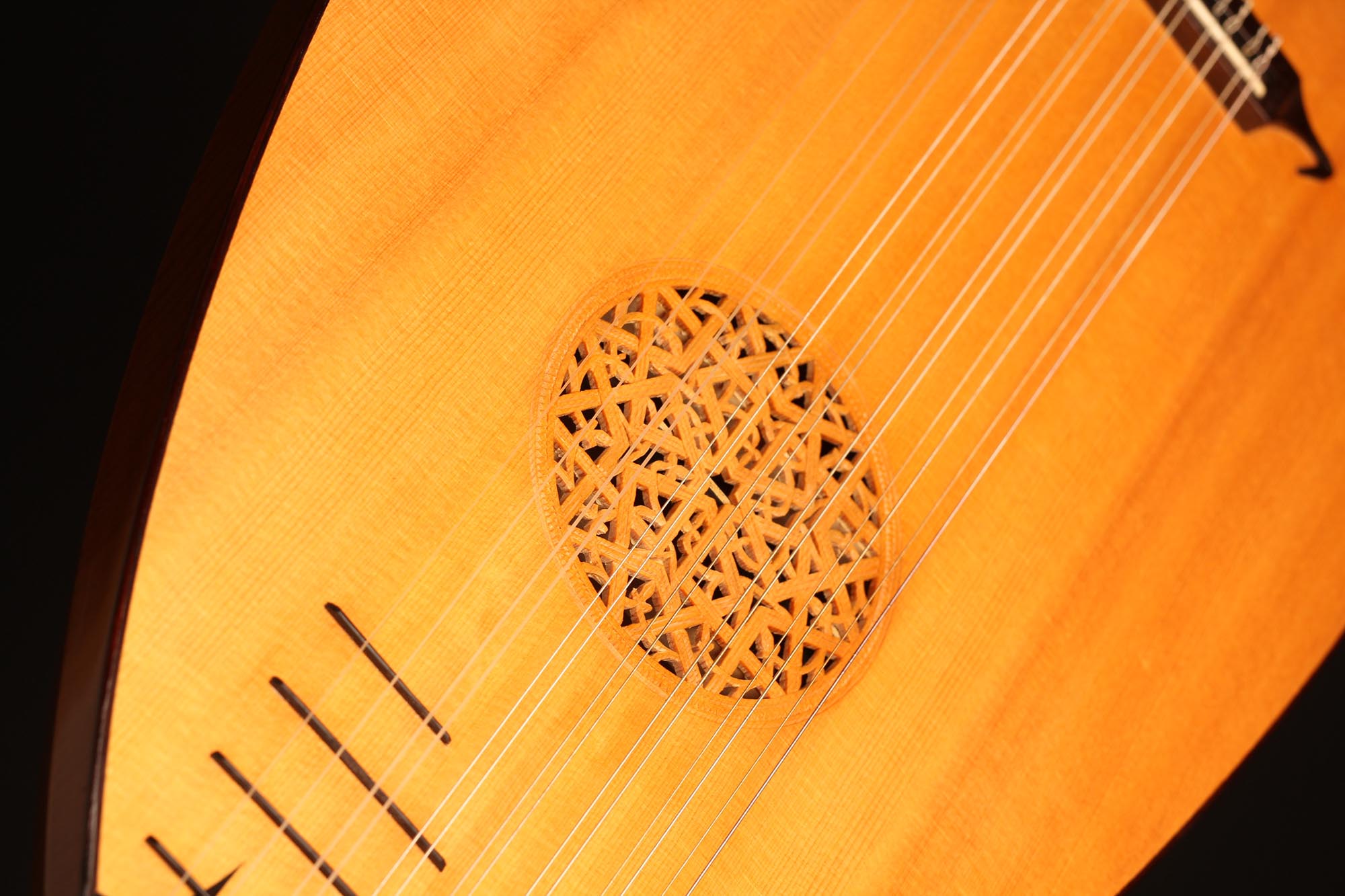 This 8 courses lute is a gorgeous example of David José Rubio’s high-quality workmanship. It is generously decorated with fine marquetry inlays on the head and the neck. This instrument was built based on the model of Bream’s 1967 8 courses lute, featuring the two first two strings as single-strings, the inlaid frets and the elevated first-string peg. This lute is in excellent condition, no cracks nor repairs have occurred. This lute only has some handling wear on the top of the head and some imperceptible playing marks on the top. It is a rare opportunity to see a lute made by this great English master and an even bigger event to have the chance to approach such a gorgeously decorated instrument made on the model of Julian Bream’s one.