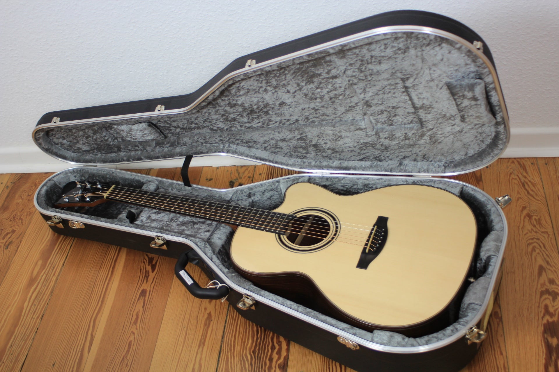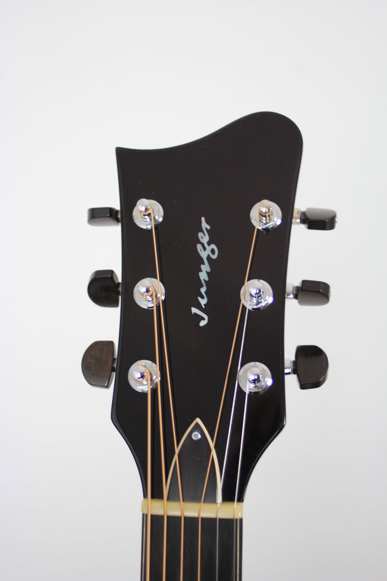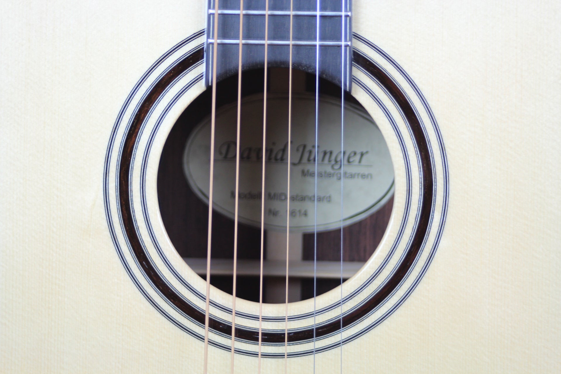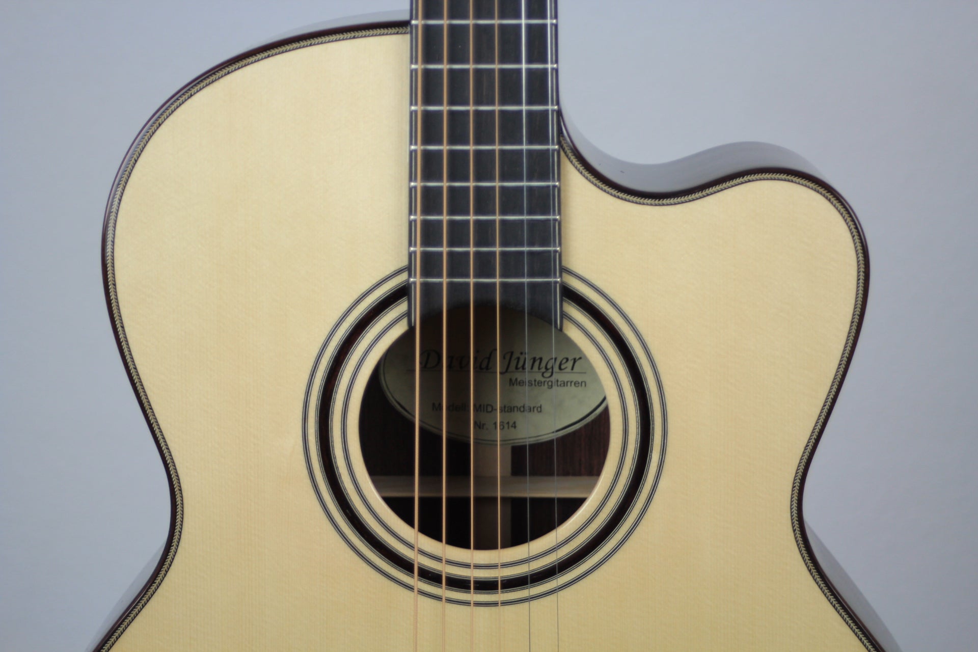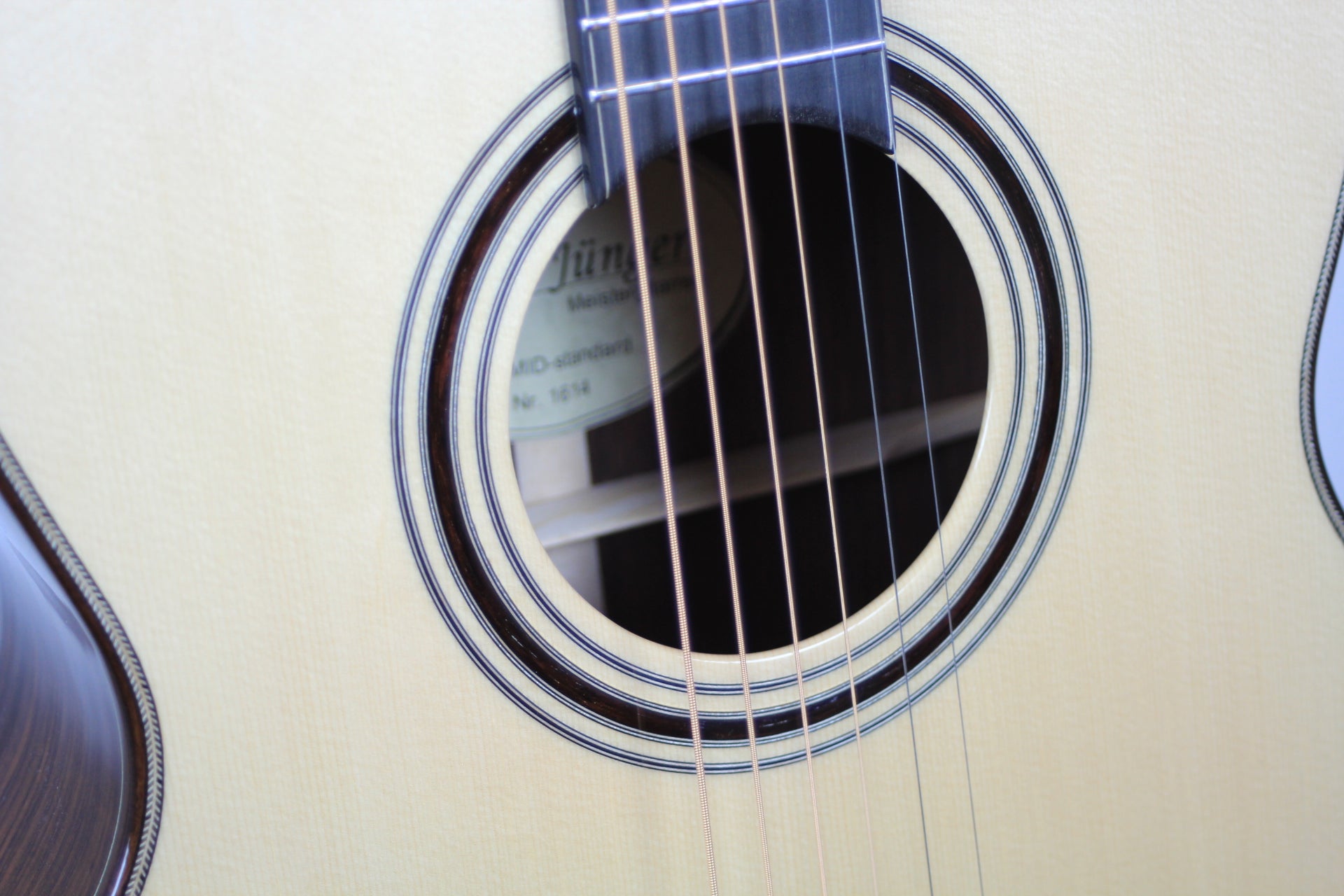 David Jünger ist ein junger und ambitionierter Gitarrenbauer, der sich auf die Fertigung von handgebauten Steelstring Gitarren sowie Archtop Jazzgitarren spezialisiert hat. Das Studium des Zupfinstrumentenbaus (Bachelor of Arts) schloss er mit Auszeichnung ab, kurz darauf folgte der Meistertitel. Das Modell MID-standard zeichnet sich durch seinen ausgewogenen Klang sowie durch die feinen Verzierungen aus. Die Korpusgröße ist etwas breiter als bei einem OM Modell. Dadurch ist sie leicht zu bespielen und bietet gleichzeitig ein ausreichend großes Volumen für einen kräftigen Klang. Die modifizierte X-Beleistung ist ideal auf die fein ausgearbeitete Alpenfichtendecke abgestimmt. Der feinjährige ostindische Palisander für Boden und Zargen unterstützt das ausgewogene Klangbild. Mit einer Breite von 44 mm am Sattel liegt der schlanke Mahagonihals sehr gut in der Hand. Die hauchdünn ausgeführte Nitrozellulose-Lackierung bietet ausreichenden Schutz, ohne das Instrument zu bedämpfen. Eingebaut ist das sehr natürlich klingende Schattesdesign HFN Active VT Tonabnehmersystem, dessen Ton- und Volumenregler vom Schallloch aus gut zu erreichen sind. Inklusive is ein ferfekt passender Koffer von Hiscox.