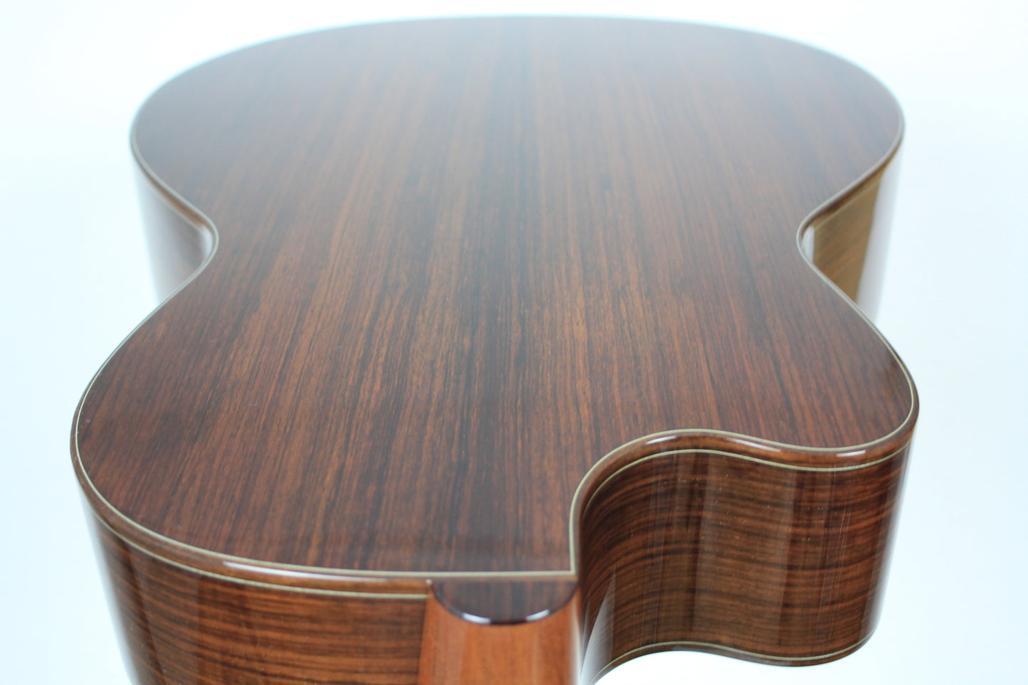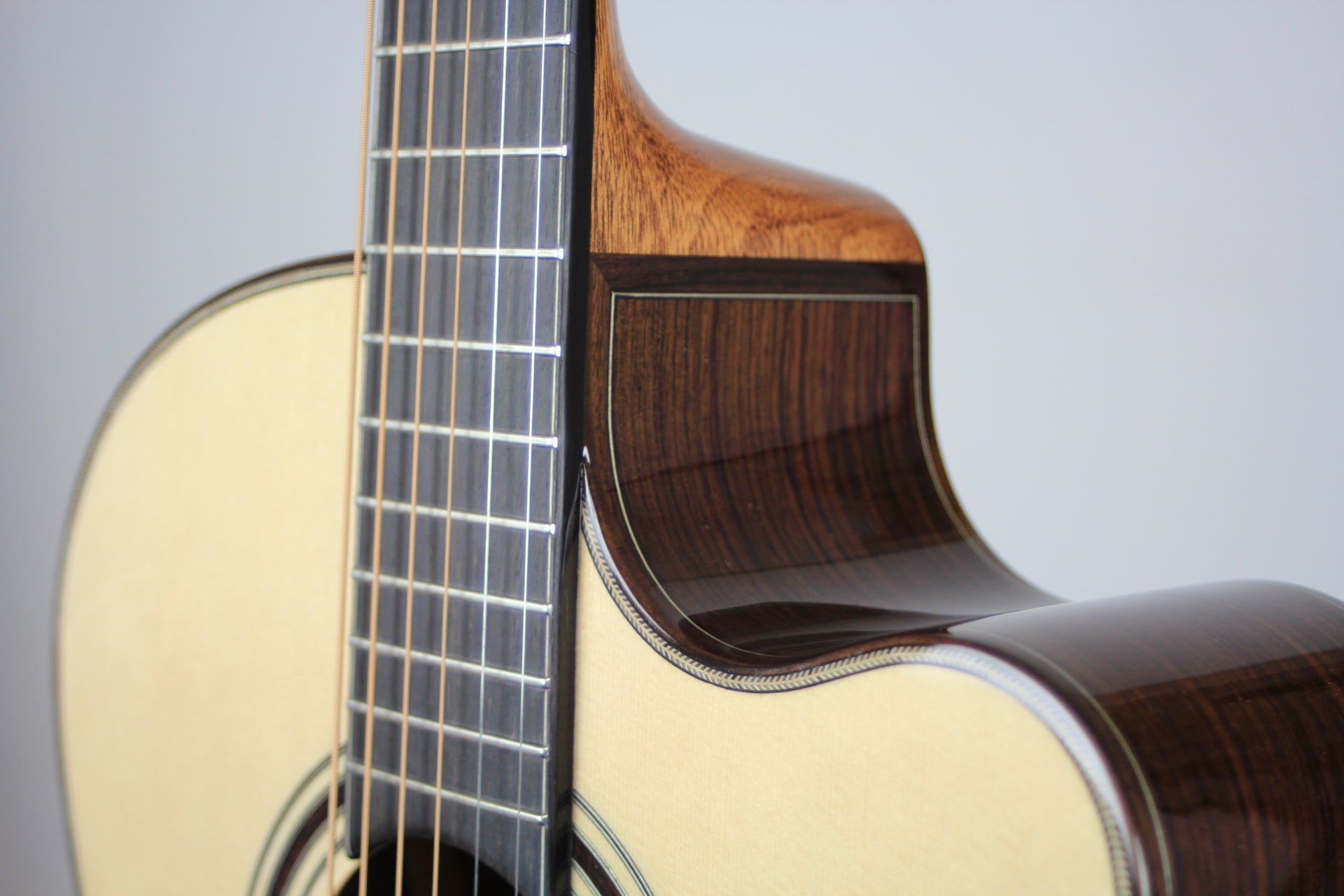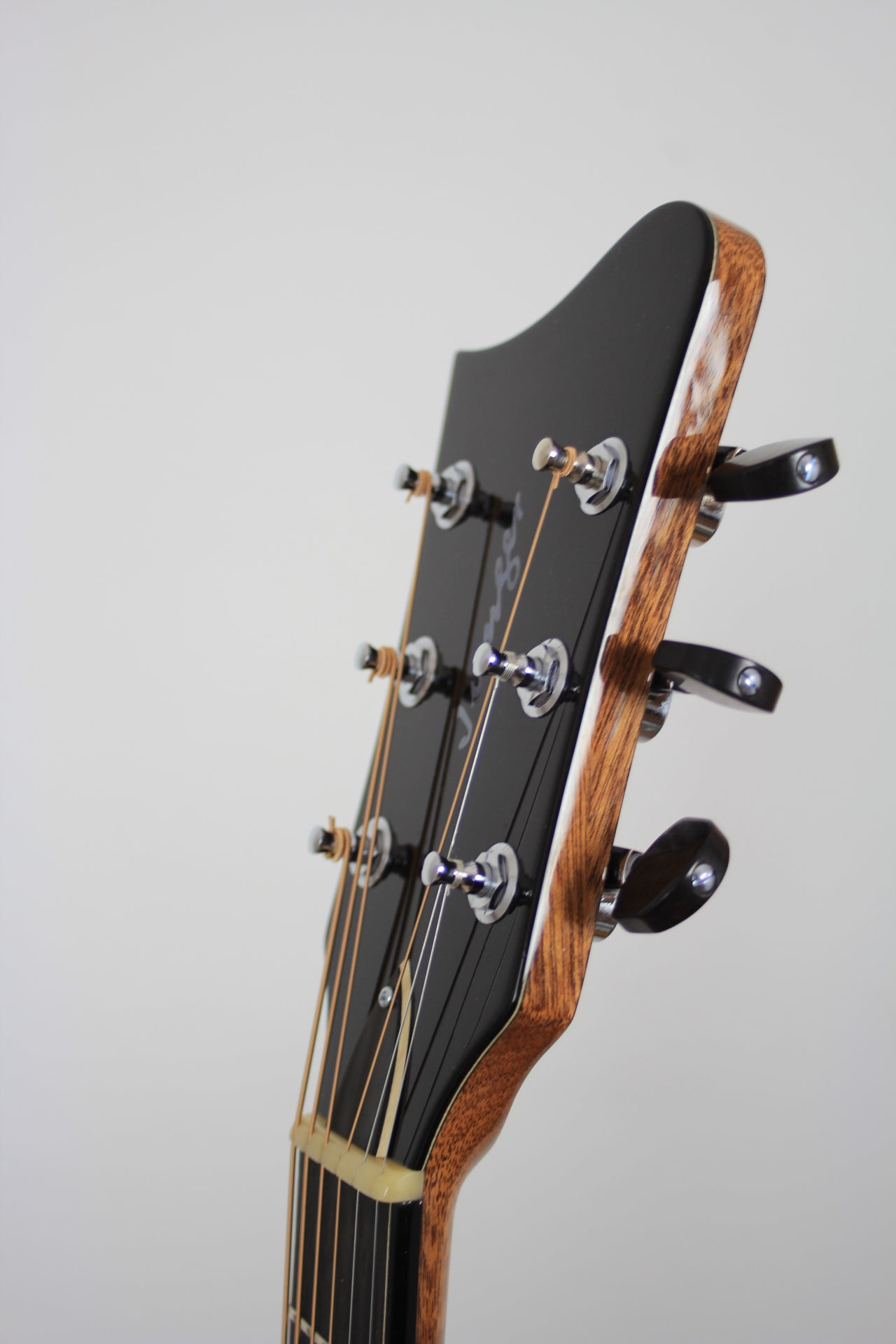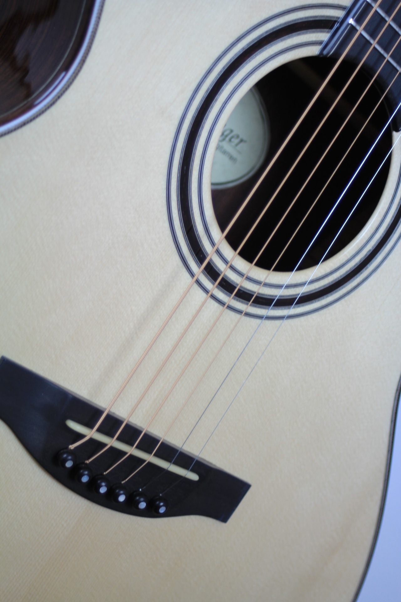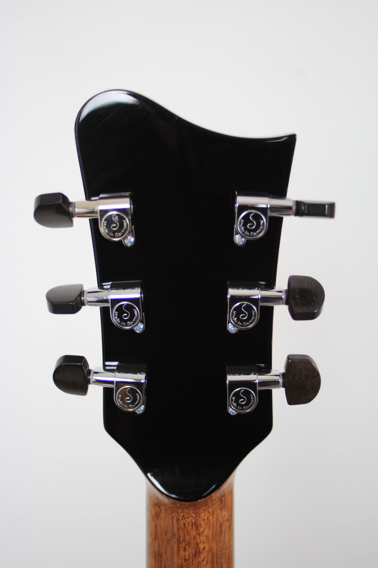 David Jünger ist ein junger und ambitionierter Gitarrenbauer, der sich auf die Fertigung von handgebauten Steelstring Gitarren sowie Archtop Jazzgitarren spezialisiert hat. Das Studium des Zupfinstrumentenbaus (Bachelor of Arts) schloss er mit Auszeichnung ab, kurz darauf folgte der Meistertitel. Das Modell MID-standard zeichnet sich durch seinen ausgewogenen Klang sowie durch die feinen Verzierungen aus. Die Korpusgröße ist etwas breiter als bei einem OM Modell. Dadurch ist sie leicht zu bespielen und bietet gleichzeitig ein ausreichend großes Volumen für einen kräftigen Klang. Die modifizierte X-Beleistung ist ideal auf die fein ausgearbeitete Alpenfichtendecke abgestimmt. Der feinjährige ostindische Palisander für Boden und Zargen unterstützt das ausgewogene Klangbild. Mit einer Breite von 44 mm am Sattel liegt der schlanke Mahagonihals sehr gut in der Hand. Die hauchdünn ausgeführte Nitrozellulose-Lackierung bietet ausreichenden Schutz, ohne das Instrument zu bedämpfen. Eingebaut ist das sehr natürlich klingende Schattesdesign HFN Active VT Tonabnehmersystem, dessen Ton- und Volumenregler vom Schallloch aus gut zu erreichen sind. Inklusive is ein ferfekt passender Koffer von Hiscox.