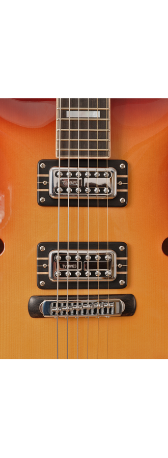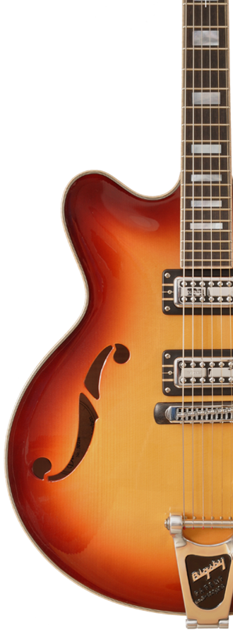 David Jünger ist ein junger und ambitionierter Gitarrenbauer, der sich auf den Bau von Archtop Jazzgitarren sowie Steelstring Gitarren spezialisiert hat. Bereits während seiner Schulzeit begann er, sich mit dem Gitarrenbau zu beschäftigen. Bald folgten viele Monate Praktikum, unter anderem bei Andreas Cuntz, Stefan Hahl und Jürgen Volkert. Dieses Jazzgitarrenmodell ist speziell für das Spielen mit dem Verstärker entwickelt worden. Es verfügt über eine steife Decke sowie steife Beleistung, um Rückkopplungen bei der elektrischen Verstärkung zu vermeiden. Boden sowie Zargen sind aus Riegelahorn gefertigt, die Decke besteht aus feiner Alpenfichte. Das Ebenholzgriffbrett verfügt über 24 Bünde, was in Verbindung mit dem Cutaway und dem Halsübergang am 16. Bund das Spielen in den hohen Lagen erleichtert. Die TV Jones Tonabnehmer bringen das Instrument am Verstärker gut zur Geltung. Durch die Schaller Rollerbridge ist die Stimmstabilität auch nach Benutzung des Bigsby Tremolosystems garantiert. Die dünne Nitrolackierung verleiht dem Instrument einen edlen Glanz.