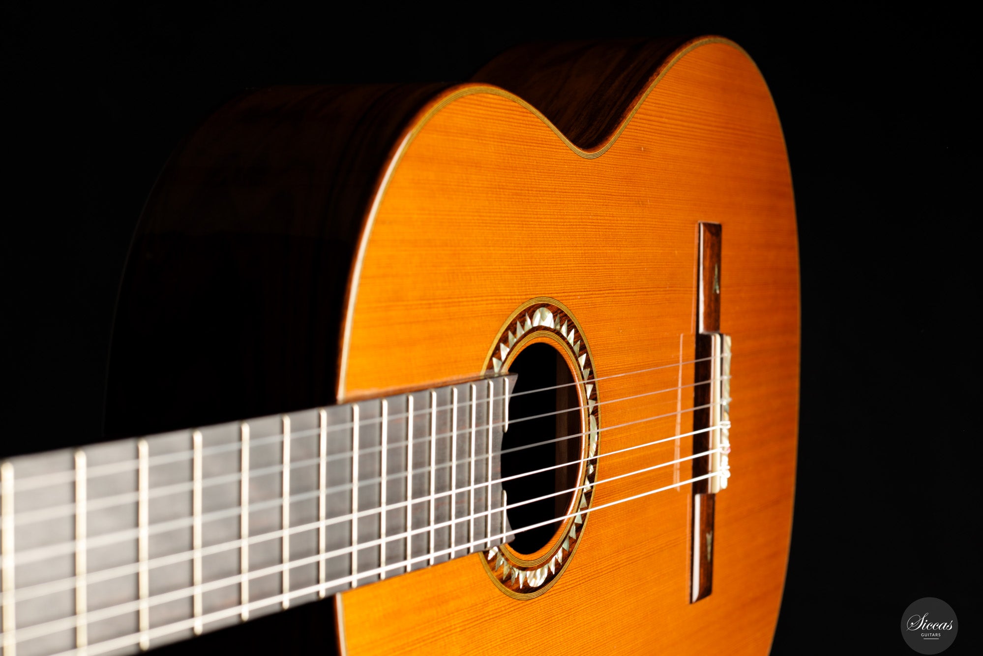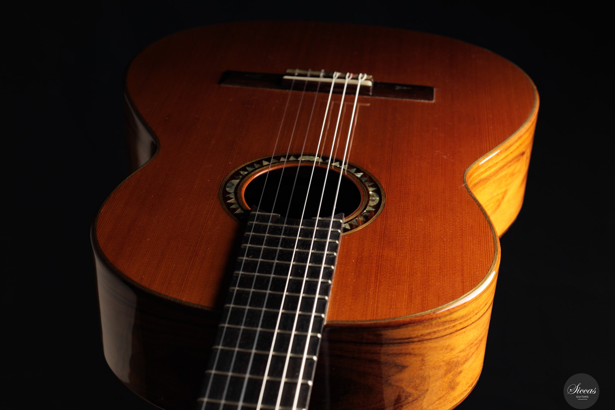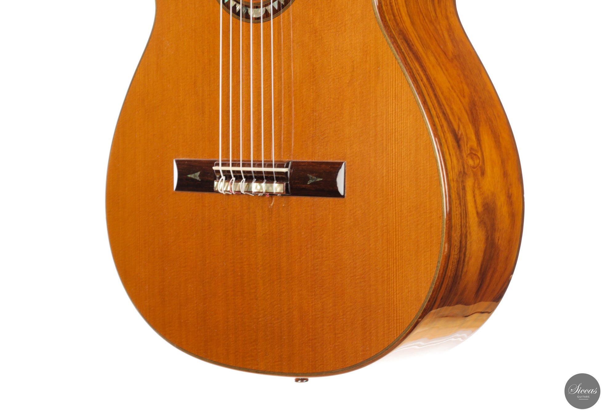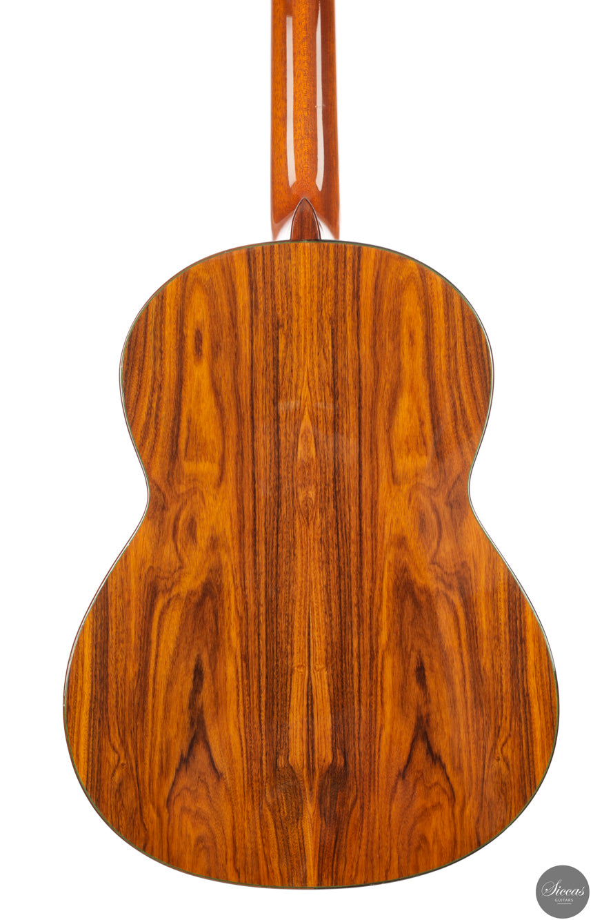 Diese Konzertgitarre von Dieter Hopf aus dem Jahr 1980 repräsentiert den ausgereiften traditionellen Stil des Meisters. Die Decke aus Zeder und der Korpus aus Santos-Palisander erzeugen einen warmen, konzentrierten Klang mit sanftem Tonansatz und stabilem Sustain. Die Ansprache ist direkt, aber stets kontrolliert, was eine feine dynamische Abstufung und nuancierte Phrasierung ermöglicht. Die Ausgewogenheit zwischen den Registern ist sorgfältig abgestimmt und unterstützt sowohl kantable Melodieführung als auch dichte Polyphonie. Trotz ihres Alters überzeugt die Gitarre mit klarer Projektion und klanglicher Präsenz – ein Zeugnis für die Qualität von Materialwahl und Bauweise.