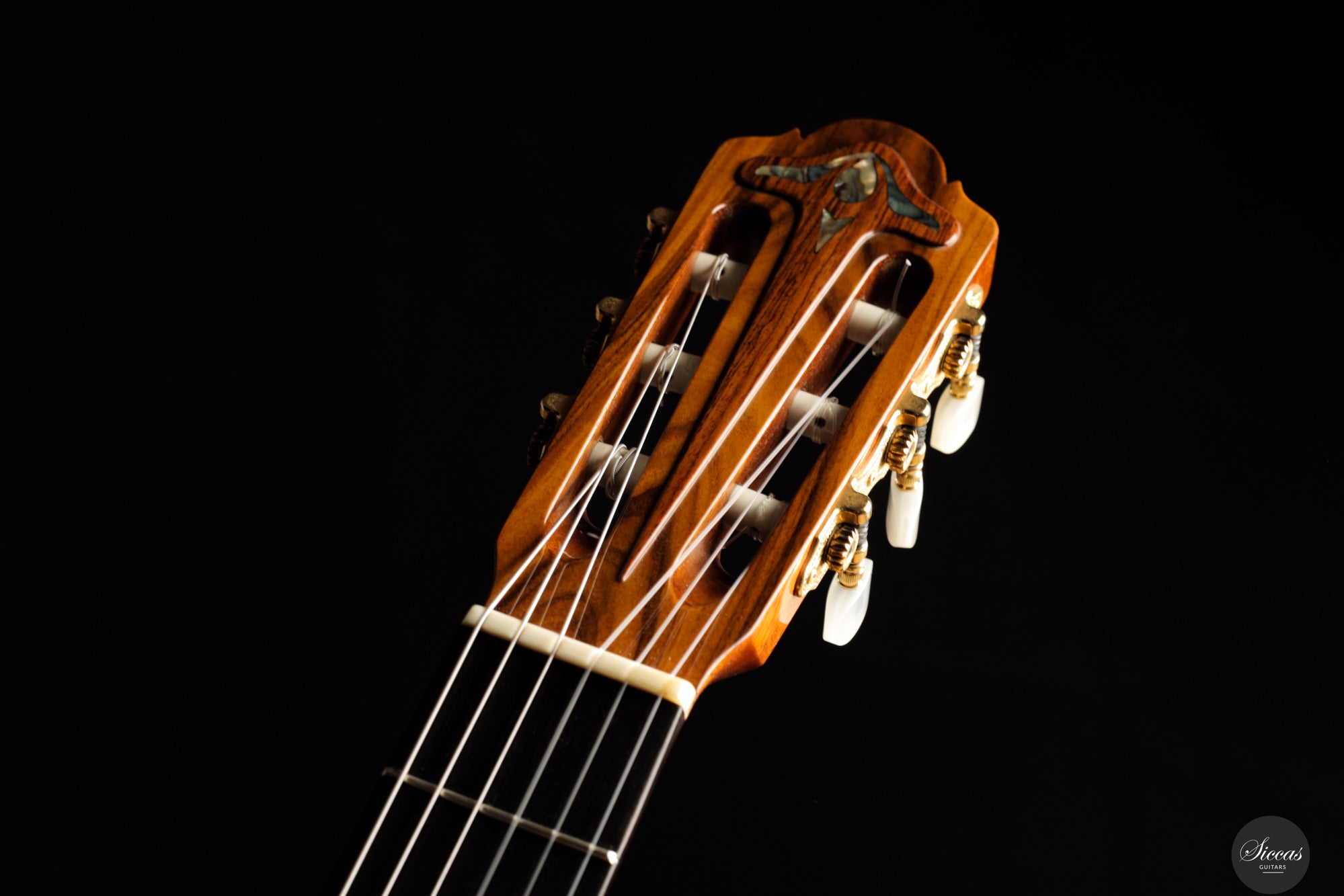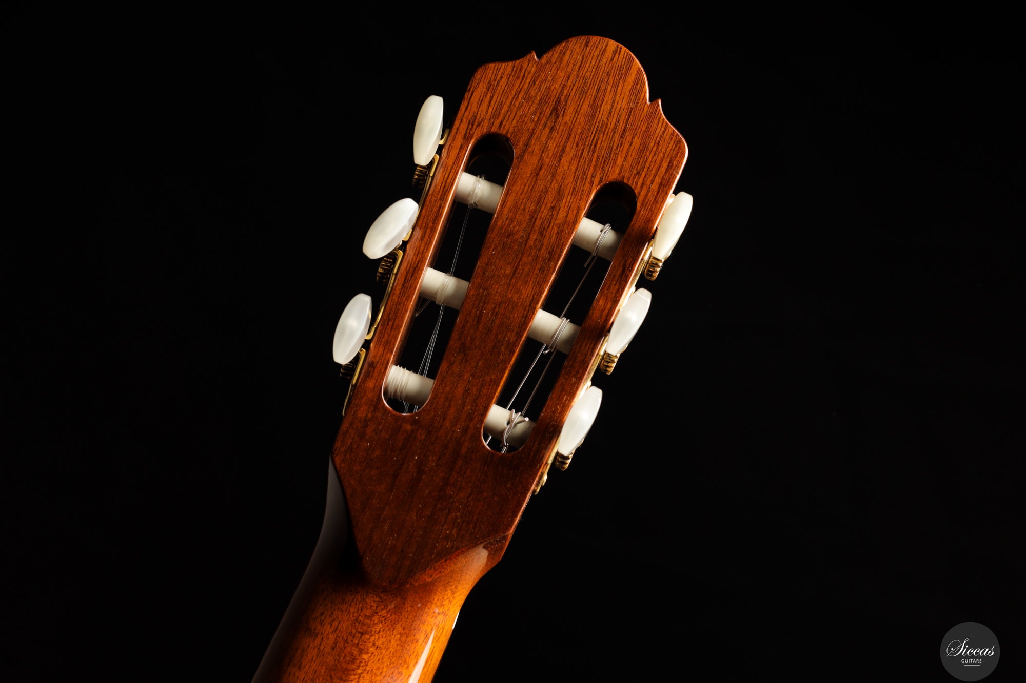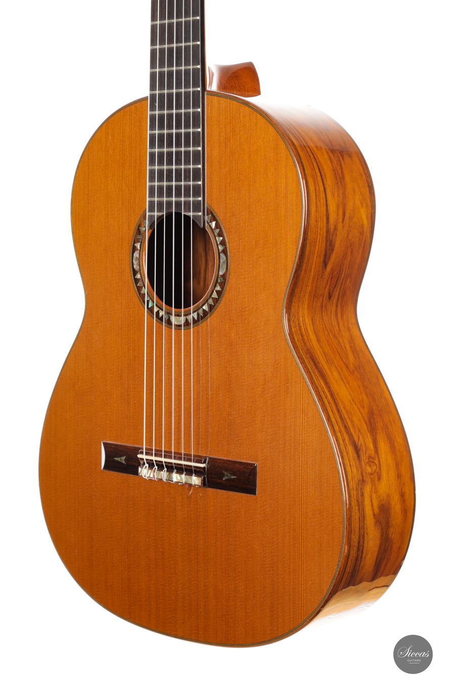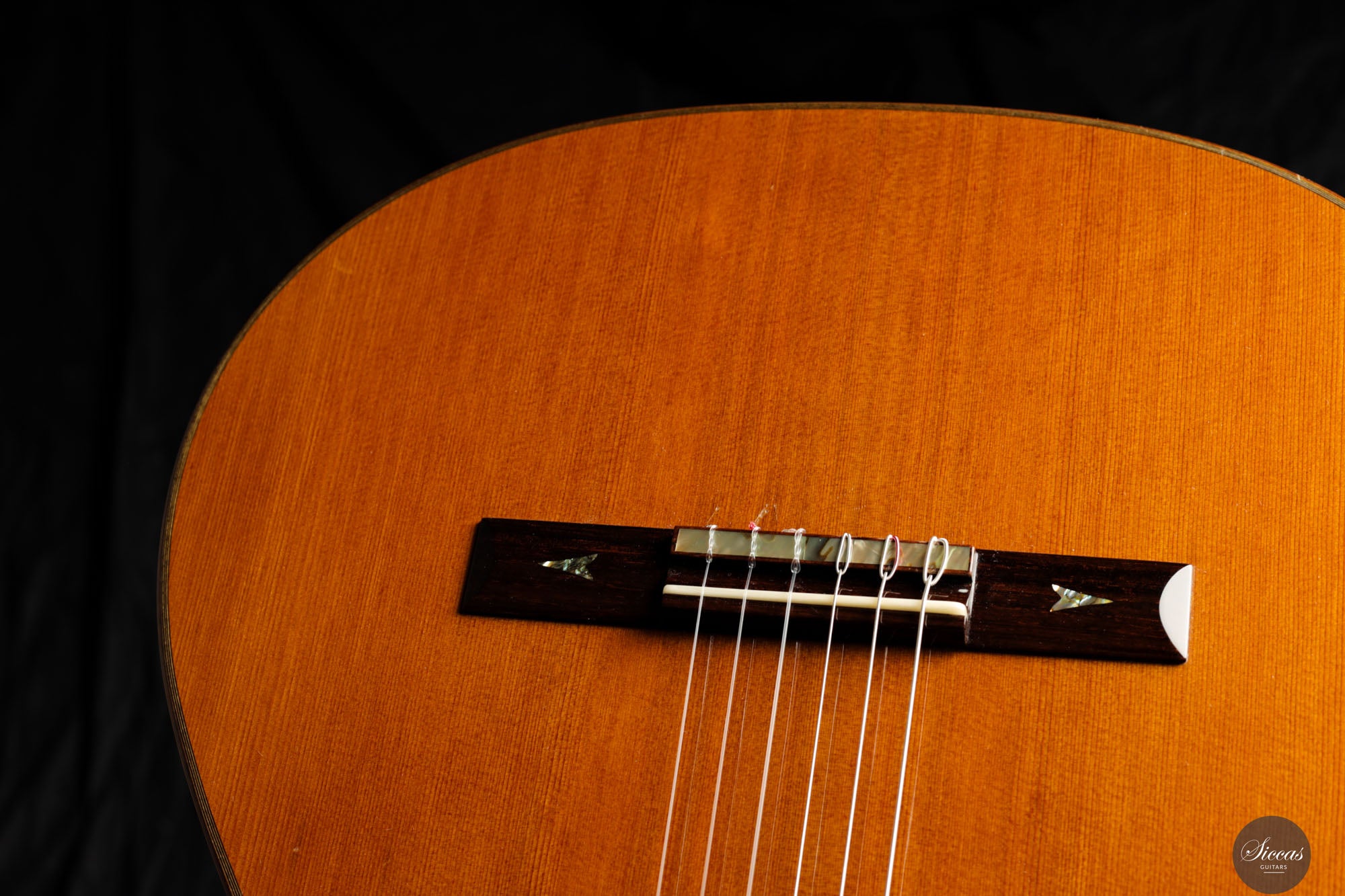 Diese Konzertgitarre von Dieter Hopf aus dem Jahr 1980 repräsentiert den ausgereiften traditionellen Stil des Meisters. Die Decke aus Zeder und der Korpus aus Santos-Palisander erzeugen einen warmen, konzentrierten Klang mit sanftem Tonansatz und stabilem Sustain. Die Ansprache ist direkt, aber stets kontrolliert, was eine feine dynamische Abstufung und nuancierte Phrasierung ermöglicht. Die Ausgewogenheit zwischen den Registern ist sorgfältig abgestimmt und unterstützt sowohl kantable Melodieführung als auch dichte Polyphonie. Trotz ihres Alters überzeugt die Gitarre mit klarer Projektion und klanglicher Präsenz – ein Zeugnis für die Qualität von Materialwahl und Bauweise.
