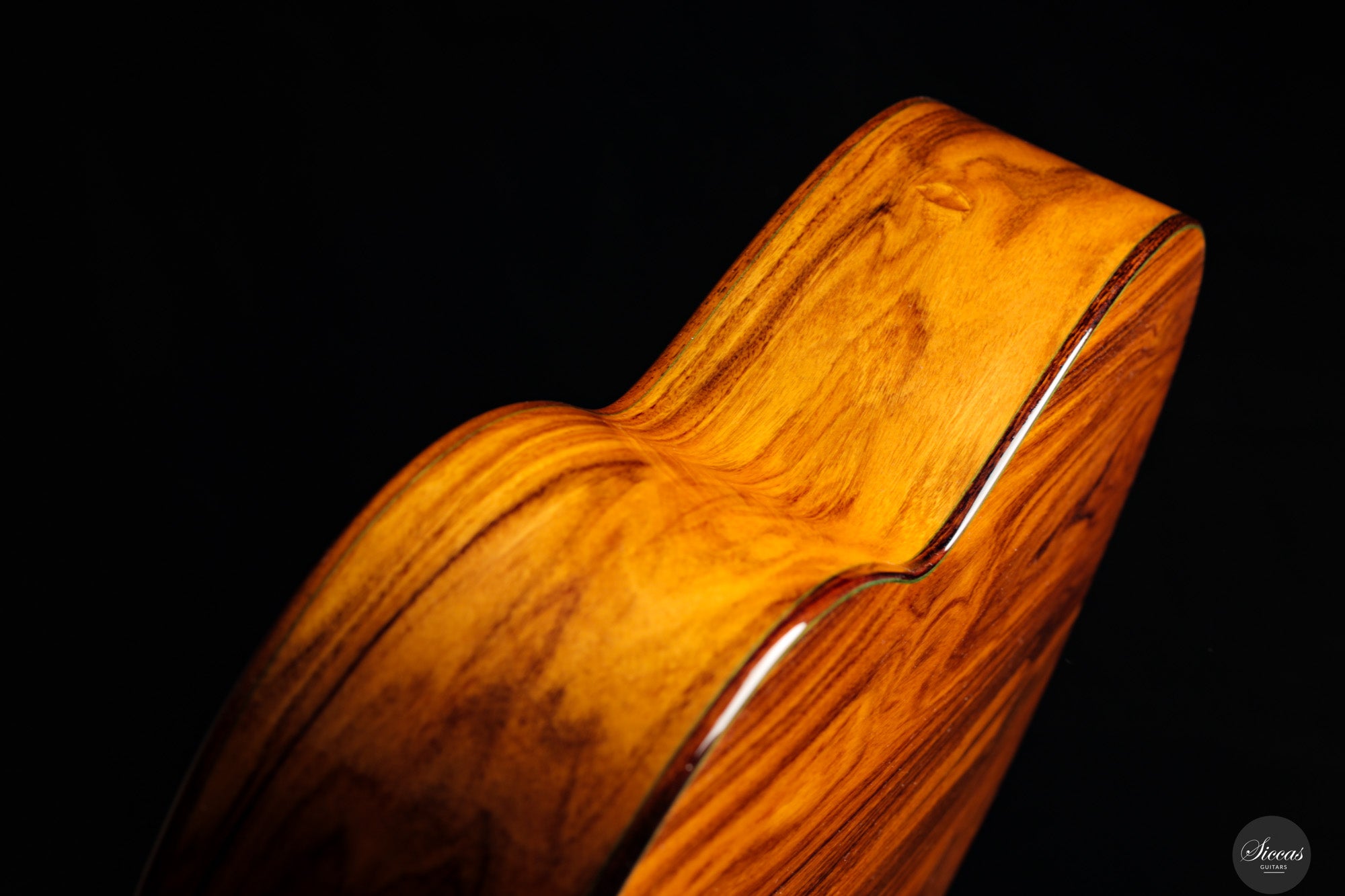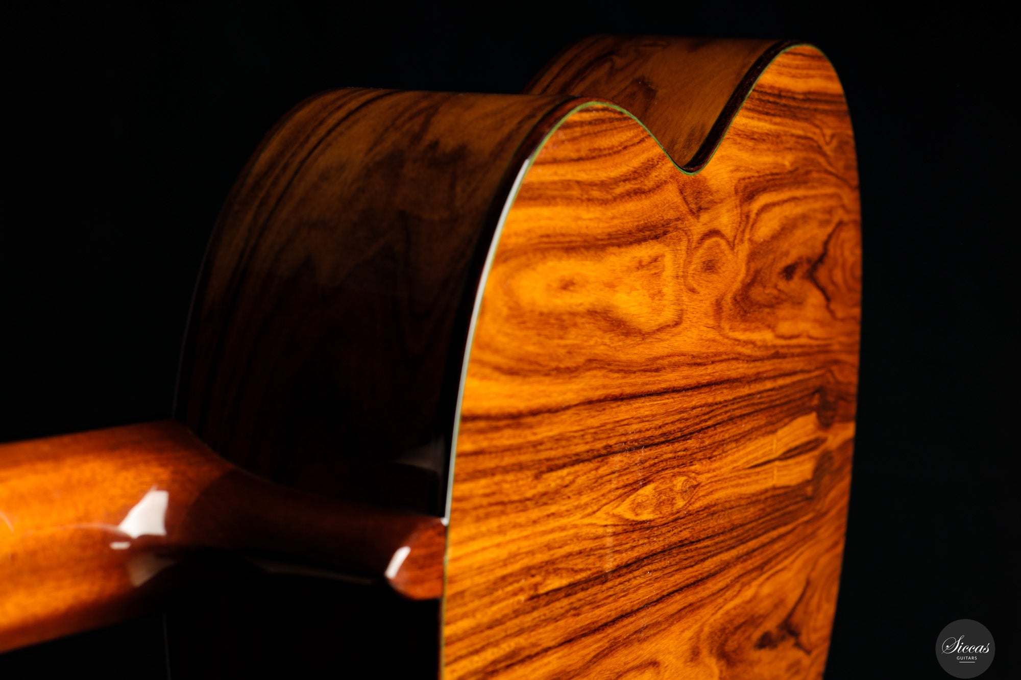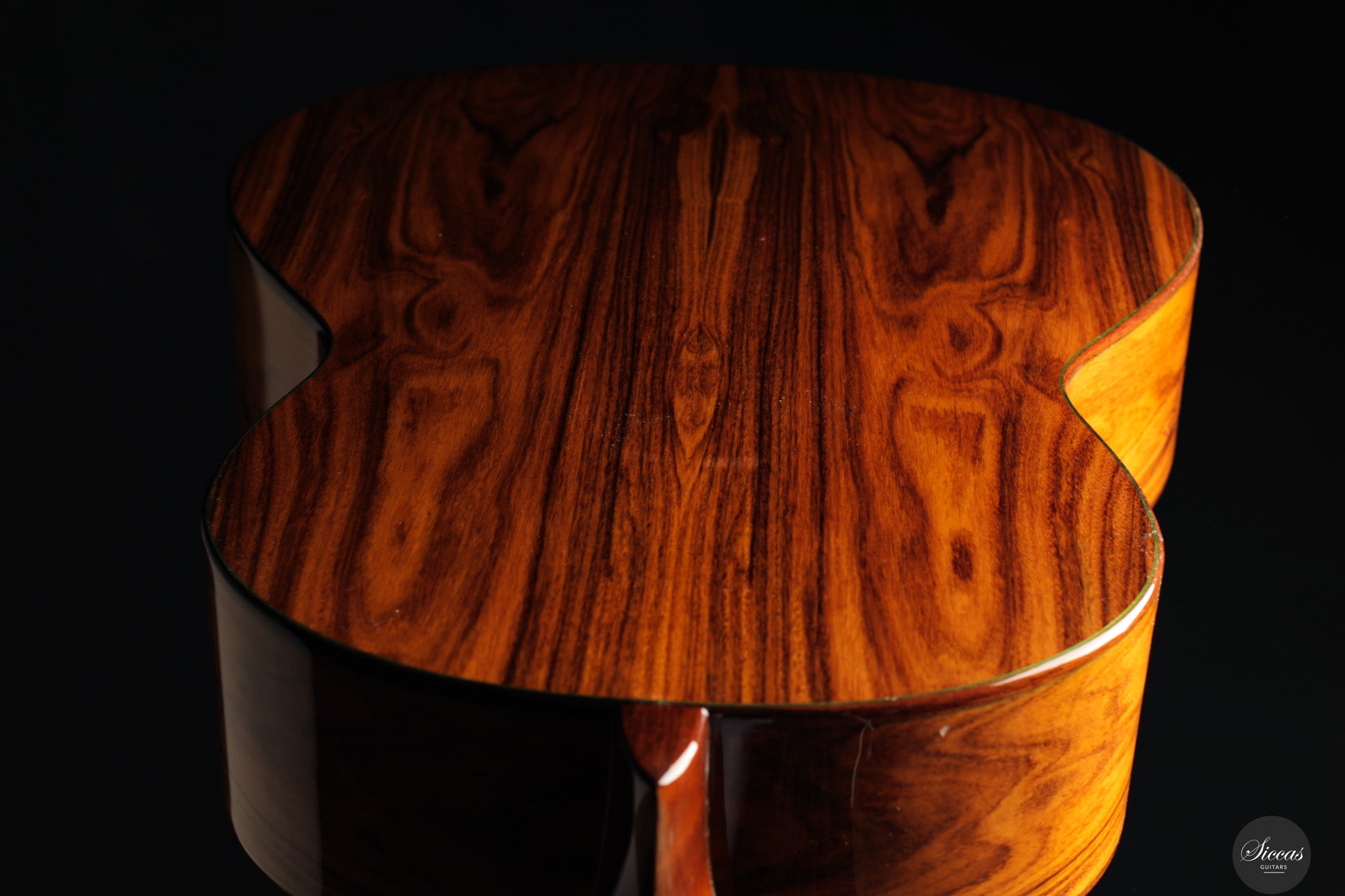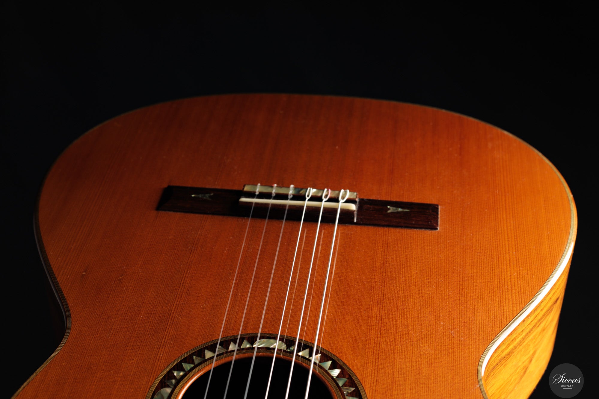 Diese Konzertgitarre von Dieter Hopf aus dem Jahr 1980 repräsentiert den ausgereiften traditionellen Stil des Meisters. Die Decke aus Zeder und der Korpus aus Santos-Palisander erzeugen einen warmen, konzentrierten Klang mit sanftem Tonansatz und stabilem Sustain. Die Ansprache ist direkt, aber stets kontrolliert, was eine feine dynamische Abstufung und nuancierte Phrasierung ermöglicht. Die Ausgewogenheit zwischen den Registern ist sorgfältig abgestimmt und unterstützt sowohl kantable Melodieführung als auch dichte Polyphonie. Trotz ihres Alters überzeugt die Gitarre mit klarer Projektion und klanglicher Präsenz – ein Zeugnis für die Qualität von Materialwahl und Bauweise.