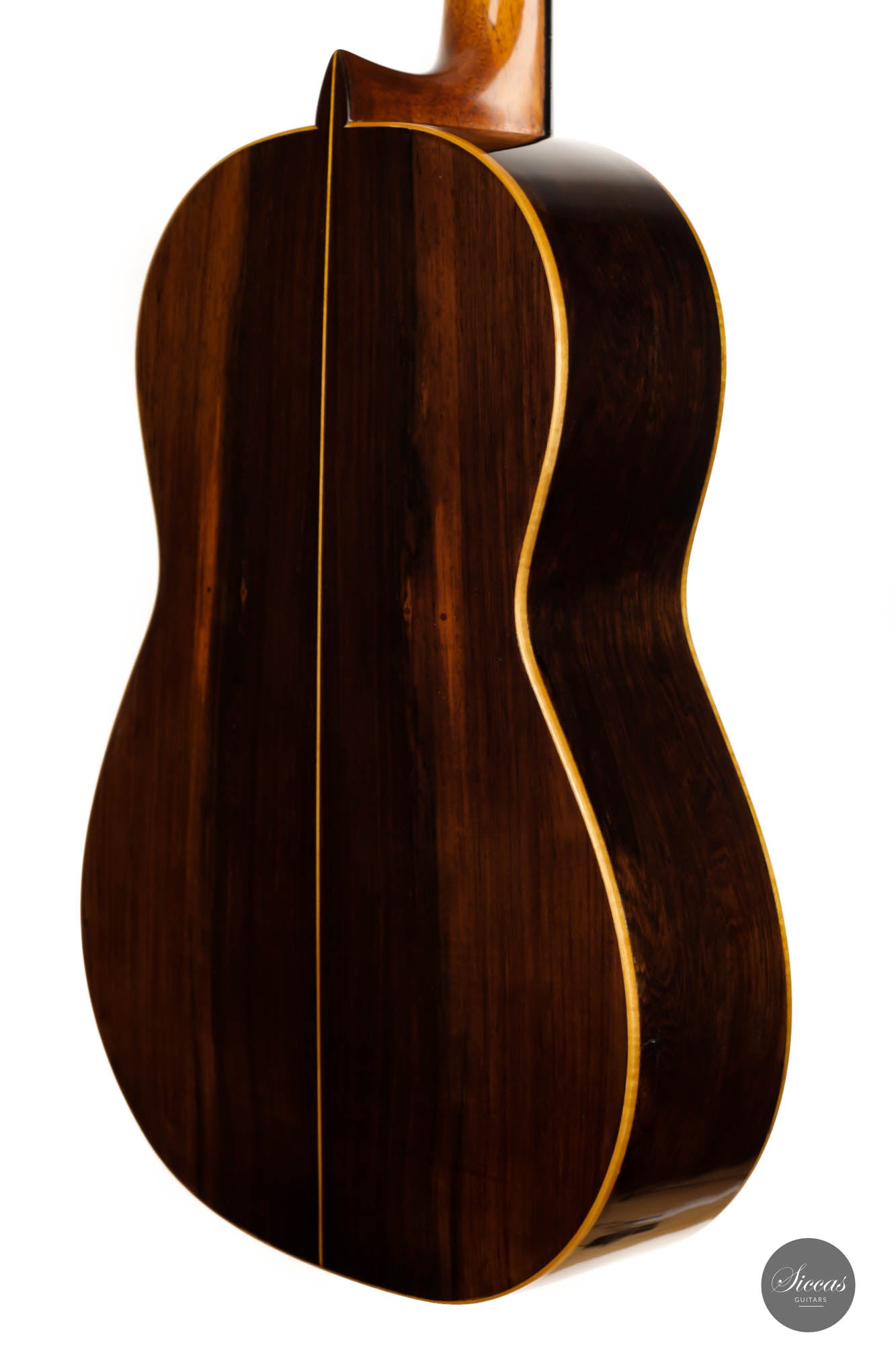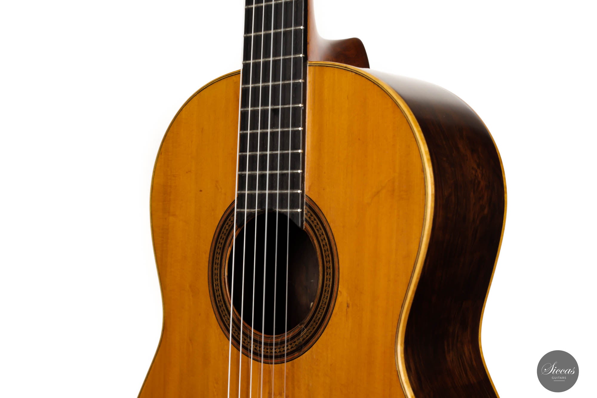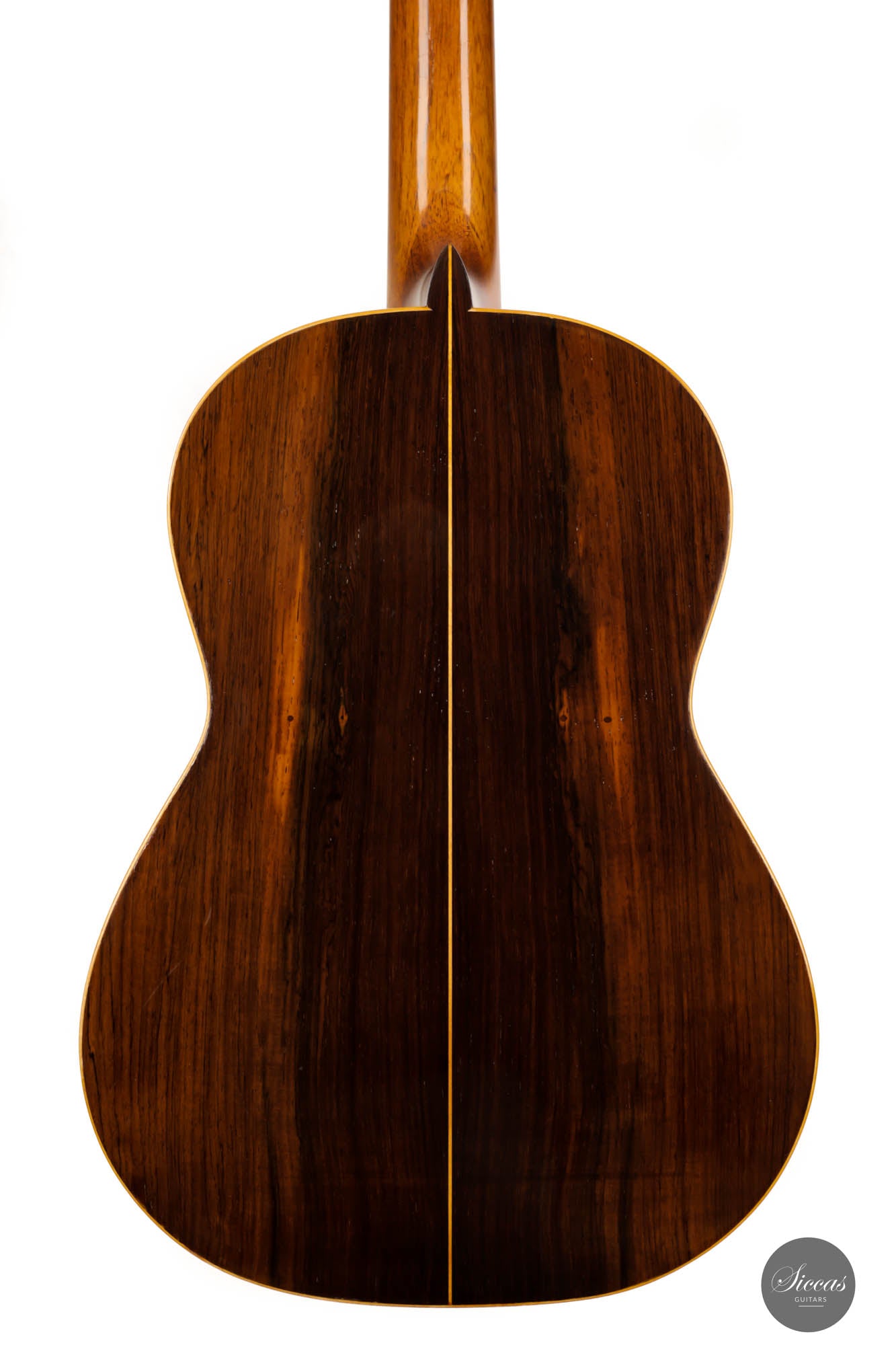 The spruce soundboard has matured over the years and shows a lovely patina color on it. Meanwhile, the old and rare Brazilian rosewood back and sides are just amazing to look at. The soundboard of this guitar has been restored masterfully at a very high level of precision, putting this instrument in perfect playing condition. The restoration was probably done at Celestino Fernandez's workshop. The back is incredibly well-preserved and has only one repaired crack.
