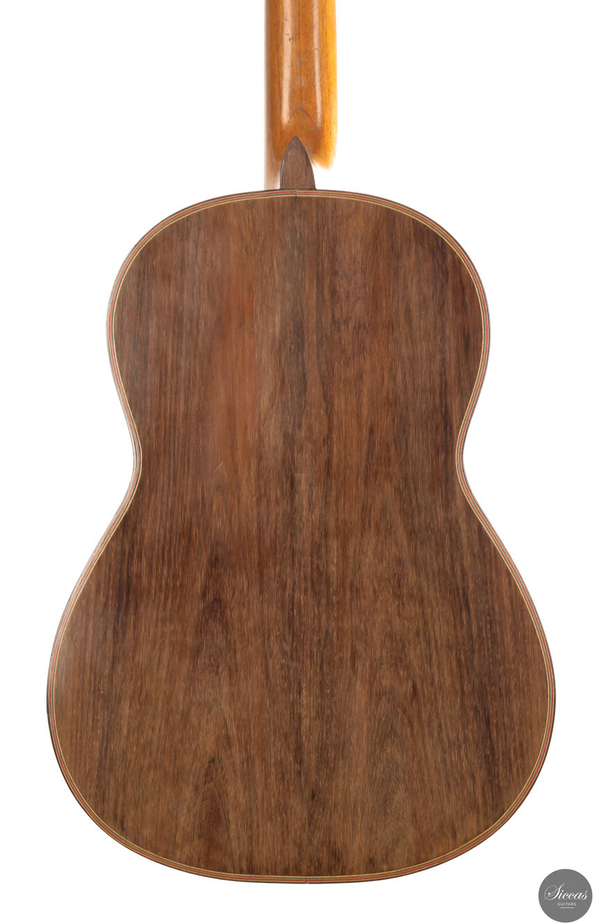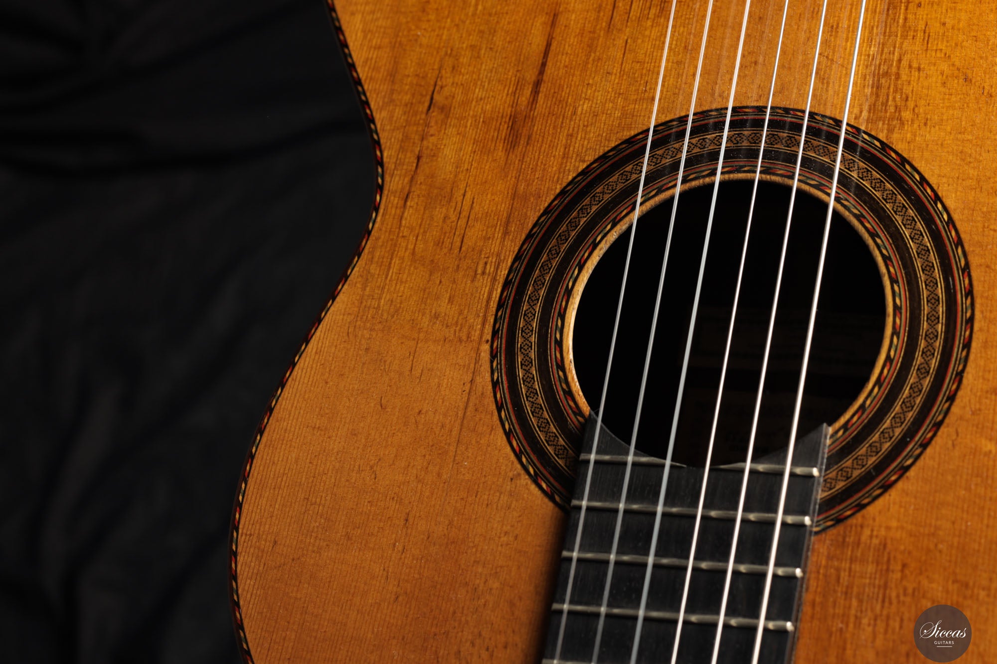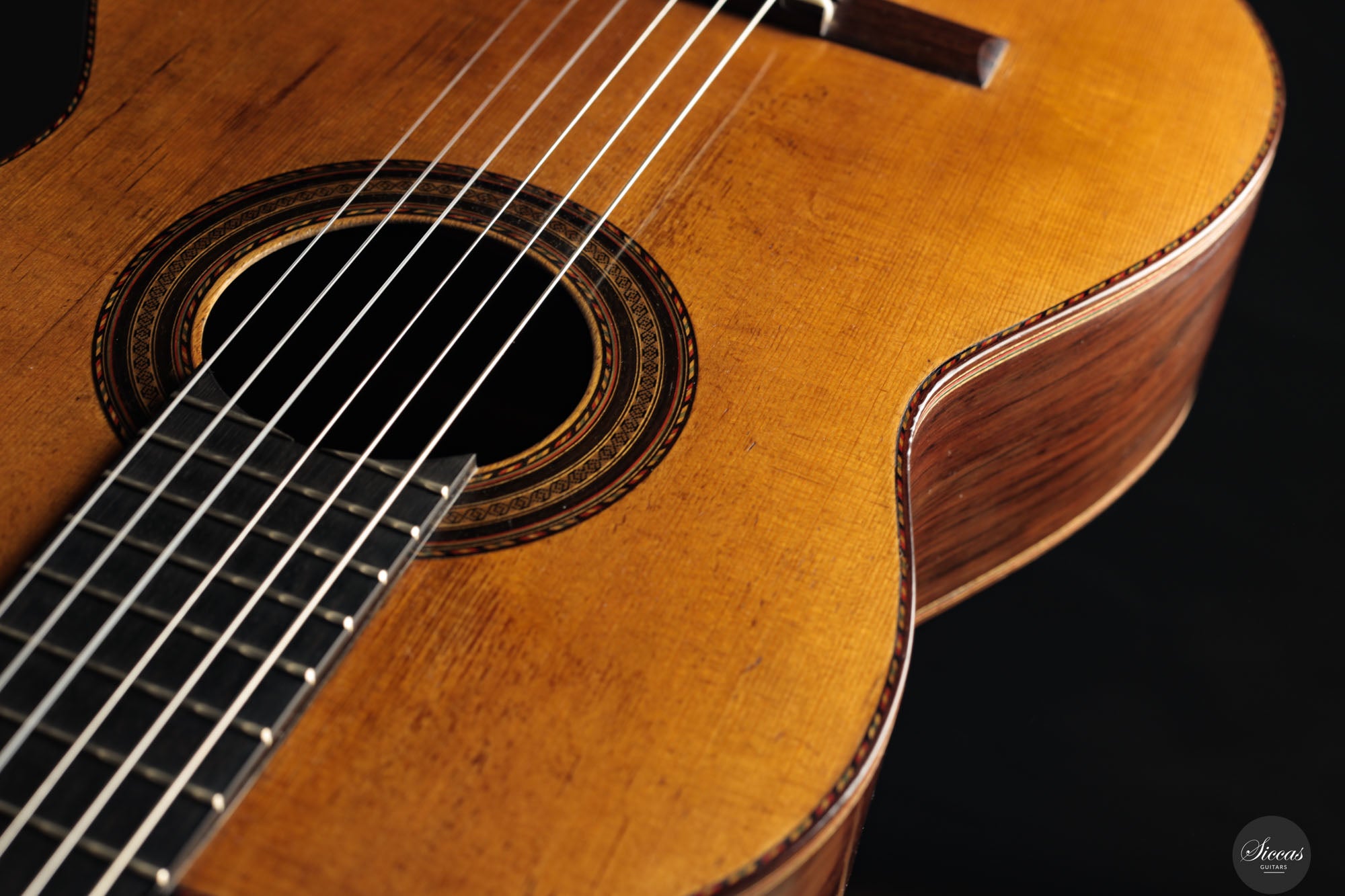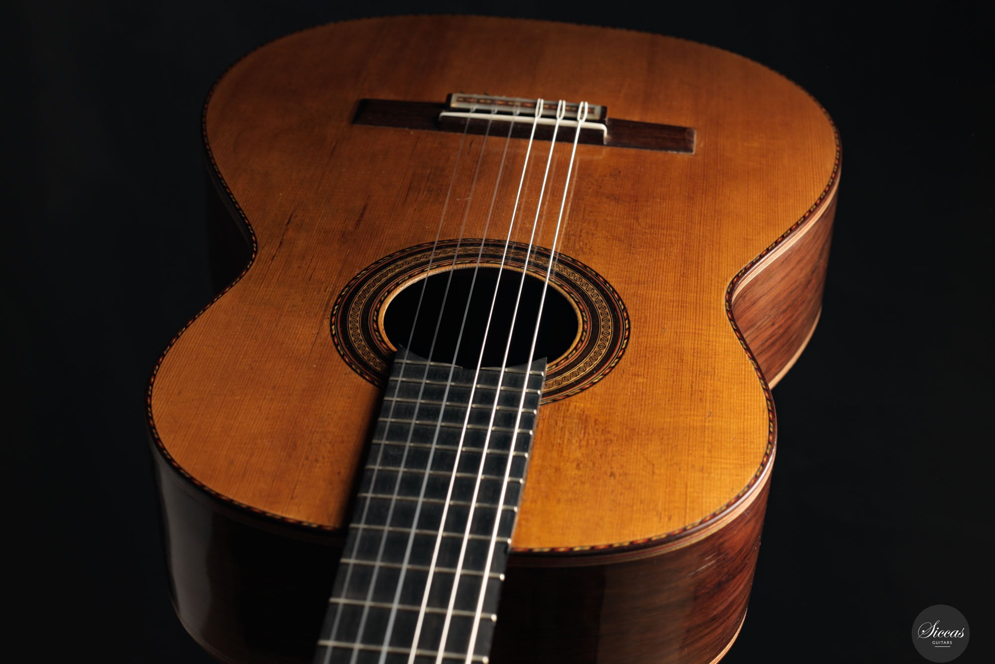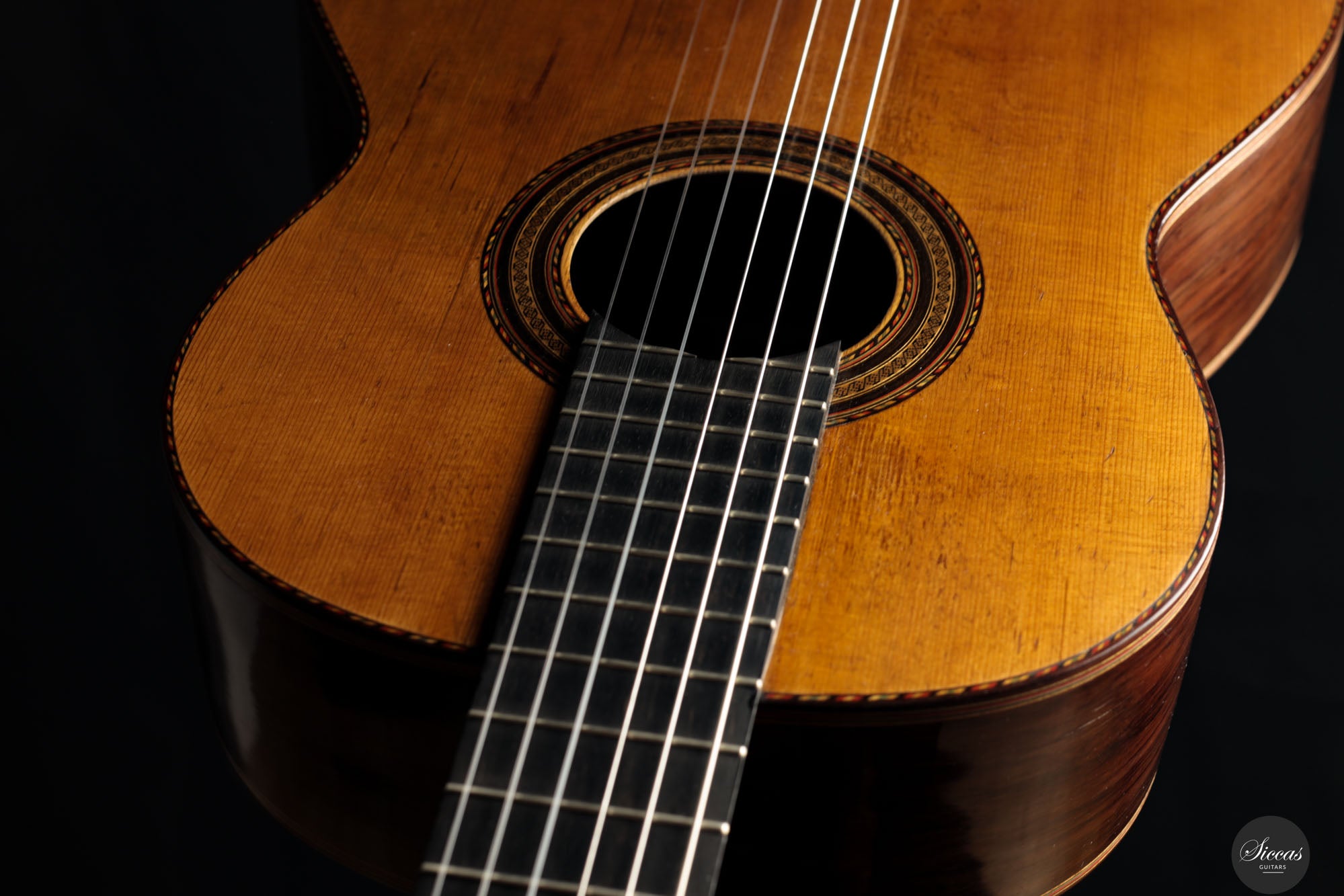 Diese außergewöhnliche Gitarre, gebaut im Jahr 1933 auf dem Höhepunkt der Karriere von Domingo Esteso, ist ein seltenes und erlesenes Modell mit Boden und Zargen aus brasilianischem Palisander. Sie verkörpert Estesos renommiertes puristisches Design, das durch schlichte, aber elegante Linien und filigrane Intarsien geprägt ist. Die französische Rosette strahlt Raffinesse aus, während die Kopfplatte als die aufwendigste aller Esteso-Modelle hervorsticht und an die feinsten Kreationen aus der Werkstatt von Manuel Ramírez erinnert. Im Jahr 2014 wurde diese Gitarre von einem professionellen Geigenbauer in Sevilla sorgfältig restauriert. Die fachmännisch reparierten Risse sind von außen kaum sichtbar: zwei Risse hinter der Stegeinlage, drei Risse zwischen Stegeinlage und Schallloch sowie zwei Risse rechts vom Schallloch. Alle Risse wurden mit Verstärkungen versehen, um die langfristige Stabilität der Reparatur zu gewährleisten und sowohl die strukturelle Integrität als auch den authentischen, brillanten Klang zu bewahren. Zudem befindet sich ein sehr kleiner Riss an der Seite, der als vorbeugende Maßnahme verleimt wurde. Trotz ihres nahenden einhundertjährigen Bestehens ist dieses Instrument lebendig, verspielt und reich an Klangfarben – ein Zeugnis zeitloser Handwerkskunst. Diese Gitarre ist ein Meisterwerk des Handwerks und ein klangliches Juwel, das die Quintessenz des spanischen Klangs aus dem frühen 20. Jahrhundert repräsentiert.