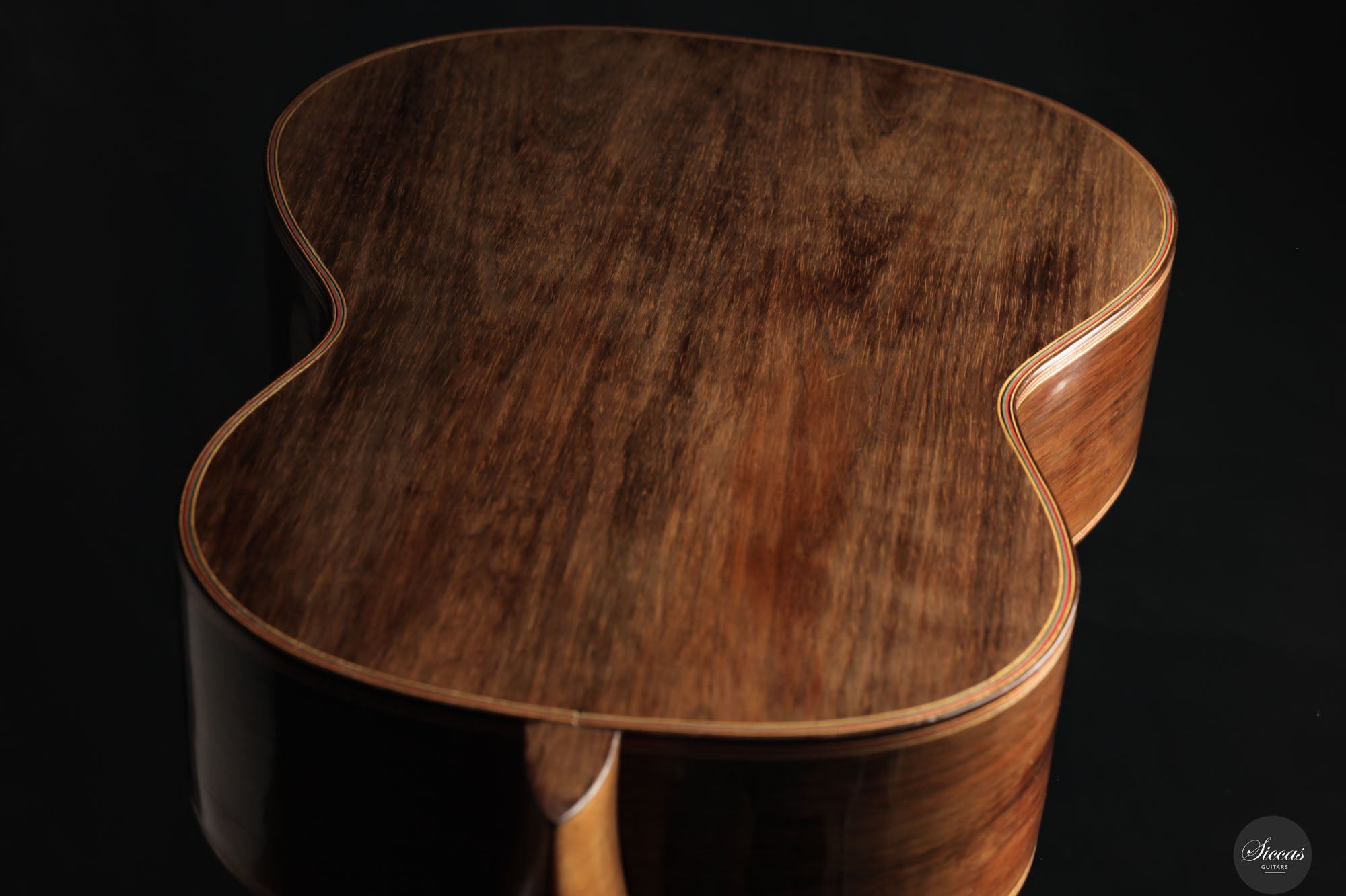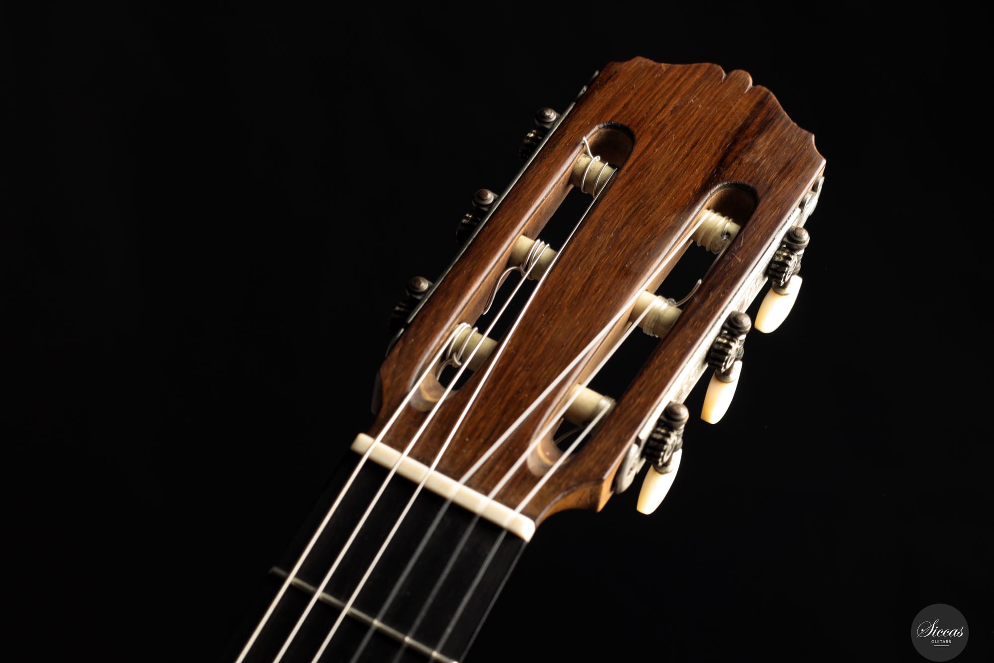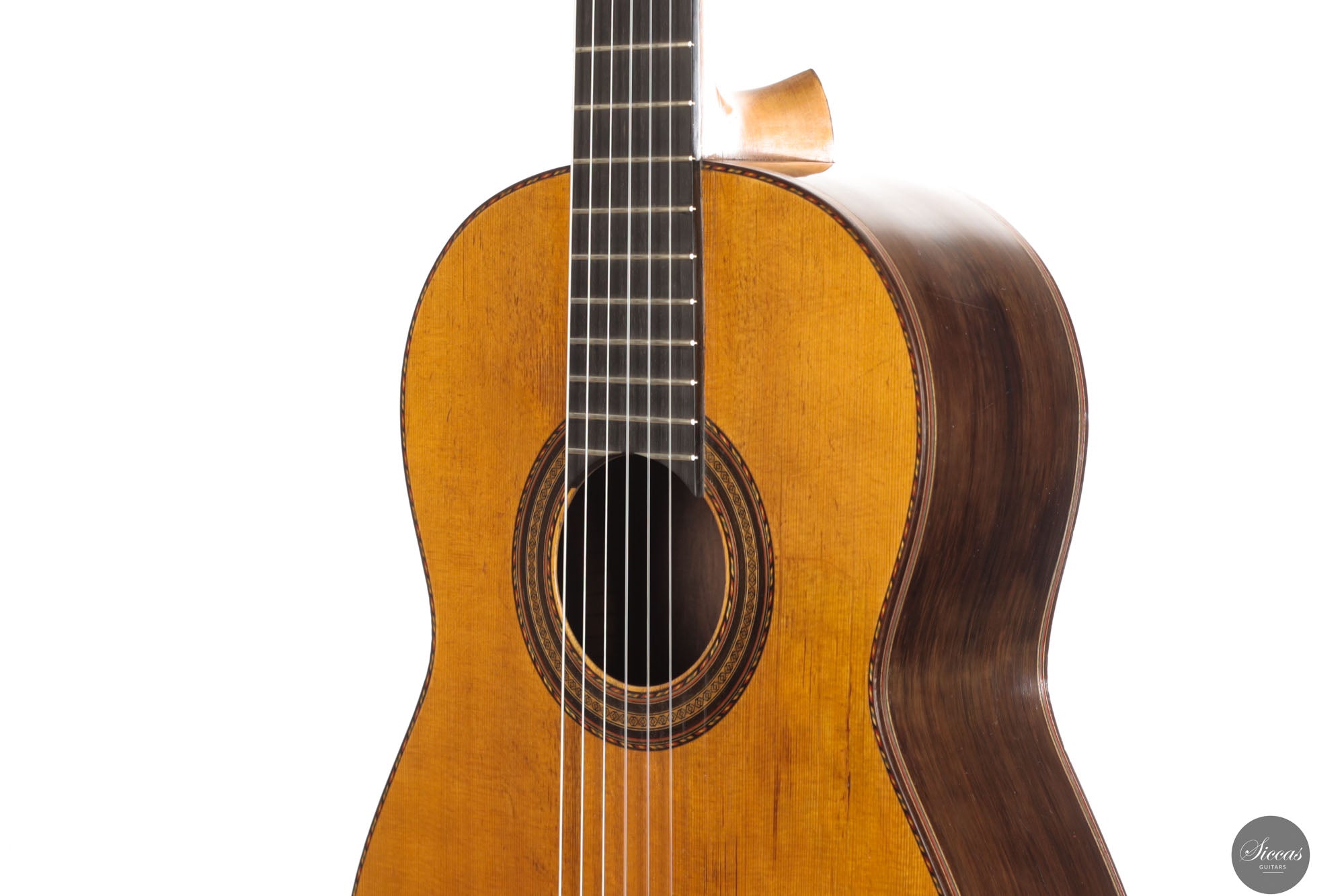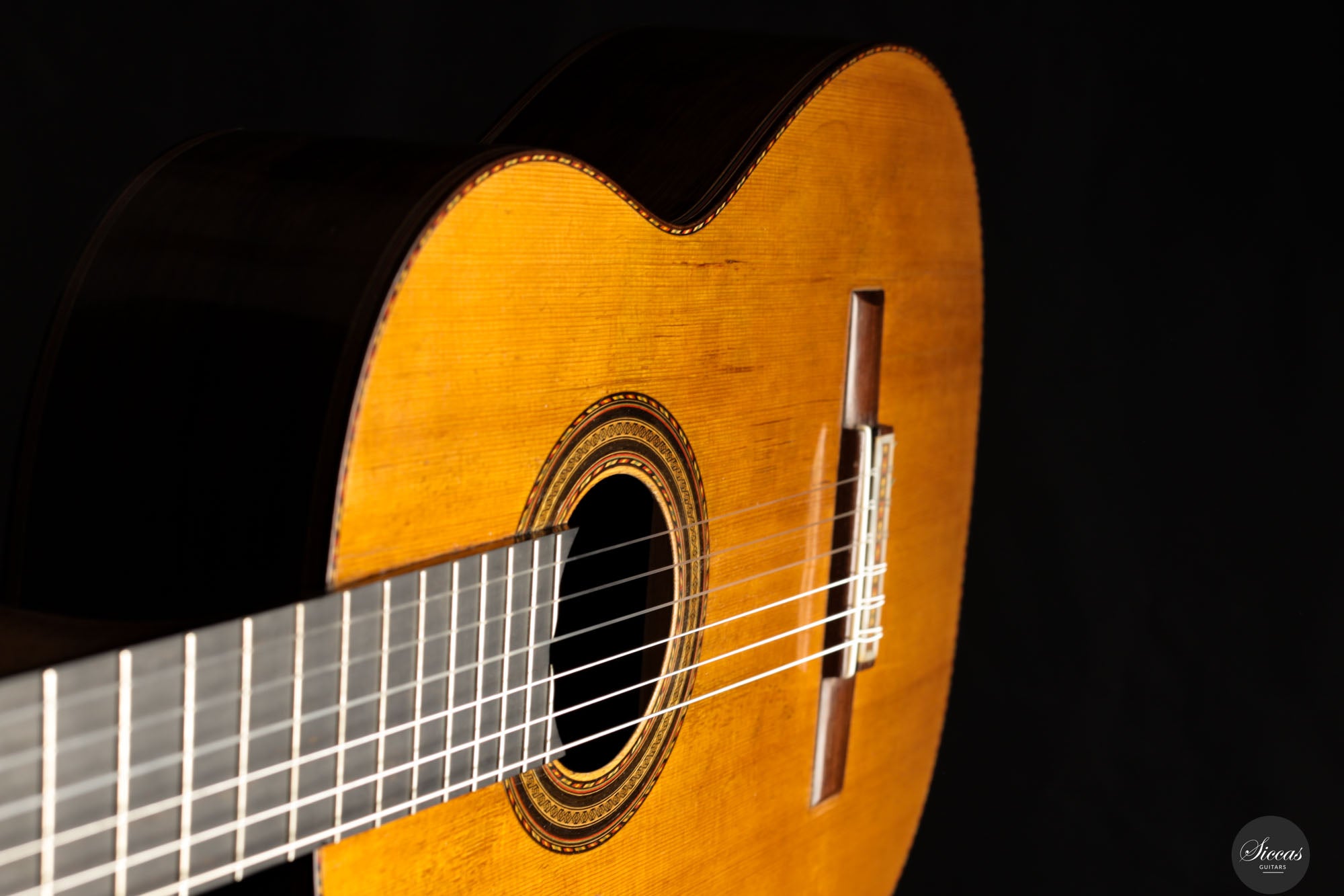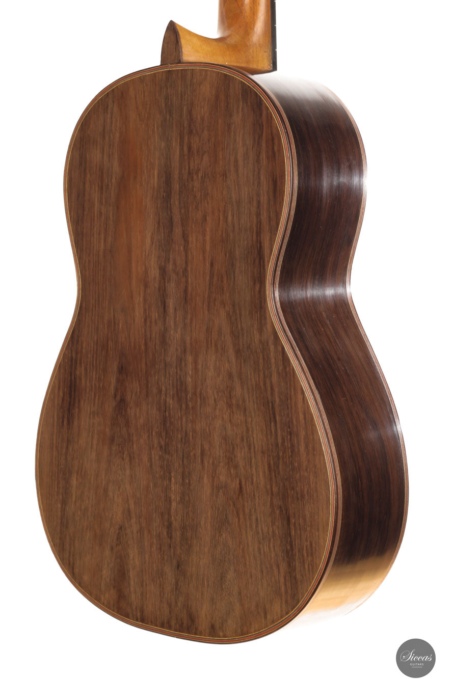 Diese außergewöhnliche Gitarre, gebaut im Jahr 1933 auf dem Höhepunkt der Karriere von Domingo Esteso, ist ein seltenes und erlesenes Modell mit Boden und Zargen aus brasilianischem Palisander. Sie verkörpert Estesos renommiertes puristisches Design, das durch schlichte, aber elegante Linien und filigrane Intarsien geprägt ist. Die französische Rosette strahlt Raffinesse aus, während die Kopfplatte als die aufwendigste aller Esteso-Modelle hervorsticht und an die feinsten Kreationen aus der Werkstatt von Manuel Ramírez erinnert. Im Jahr 2014 wurde diese Gitarre von einem professionellen Geigenbauer in Sevilla sorgfältig restauriert. Die fachmännisch reparierten Risse sind von außen kaum sichtbar: zwei Risse hinter der Stegeinlage, drei Risse zwischen Stegeinlage und Schallloch sowie zwei Risse rechts vom Schallloch. Alle Risse wurden mit Verstärkungen versehen, um die langfristige Stabilität der Reparatur zu gewährleisten und sowohl die strukturelle Integrität als auch den authentischen, brillanten Klang zu bewahren. Zudem befindet sich ein sehr kleiner Riss an der Seite, der als vorbeugende Maßnahme verleimt wurde. Trotz ihres nahenden einhundertjährigen Bestehens ist dieses Instrument lebendig, verspielt und reich an Klangfarben – ein Zeugnis zeitloser Handwerkskunst. Diese Gitarre ist ein Meisterwerk des Handwerks und ein klangliches Juwel, das die Quintessenz des spanischen Klangs aus dem frühen 20. Jahrhundert repräsentiert.