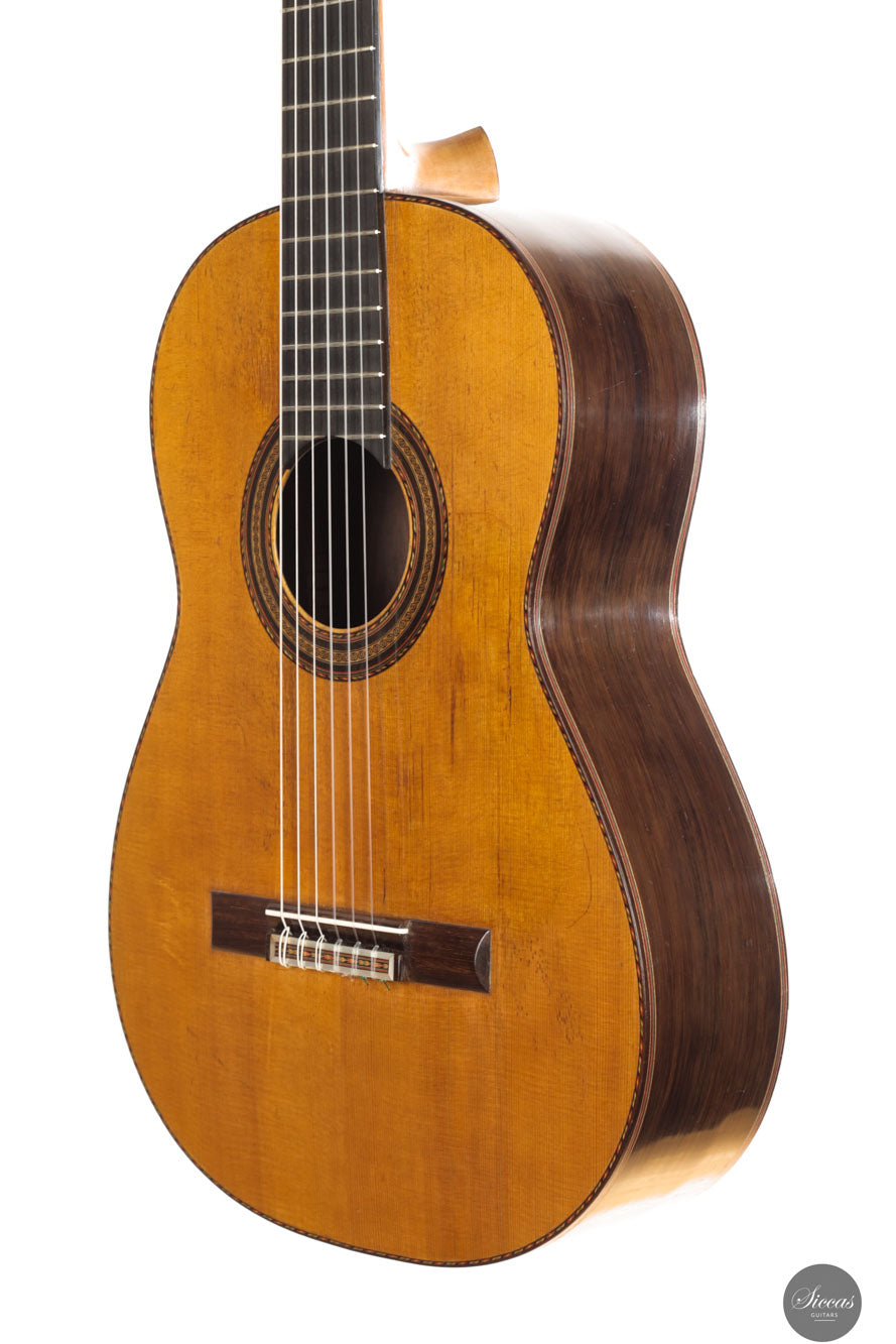 Diese 1933 erbaute Konzertgitarre von Domingo Esteso zählt zu den seltenen Spitzeninstrumenten des großen Madrider Meisters. Mit Boden und Zargen aus brasilianischem Palisander und einer fein gearbeiteten Fichtendecke verkörpert sie den puristischen, zugleich eleganten Stil Estesos, geprägt von schlichten Linien, filigranen Intarsien und einer besonders kunstvoll gestalteten Kopfplatte. Ihr Klang ist brillant, farbenreich und lebendig – ein typisches Beispiel für den spanischen Ton der frühen 1930er-Jahre. 2014 wurde sie von einem Geigenbauer in Sevilla behutsam restauriert, wobei mehrere Risse professionell und dauerhaft gesichert wurden, ohne die Authentizität oder den Charakter des Instruments zu beeinträchtigen. In ausgezeichnetem Erhaltungszustand vereint sie historische Bedeutung, meisterliche Baukunst und eine faszinierende Klangsprache, die sie zu einem wahren Juwel für Sammler und Konzertgitarristen macht.