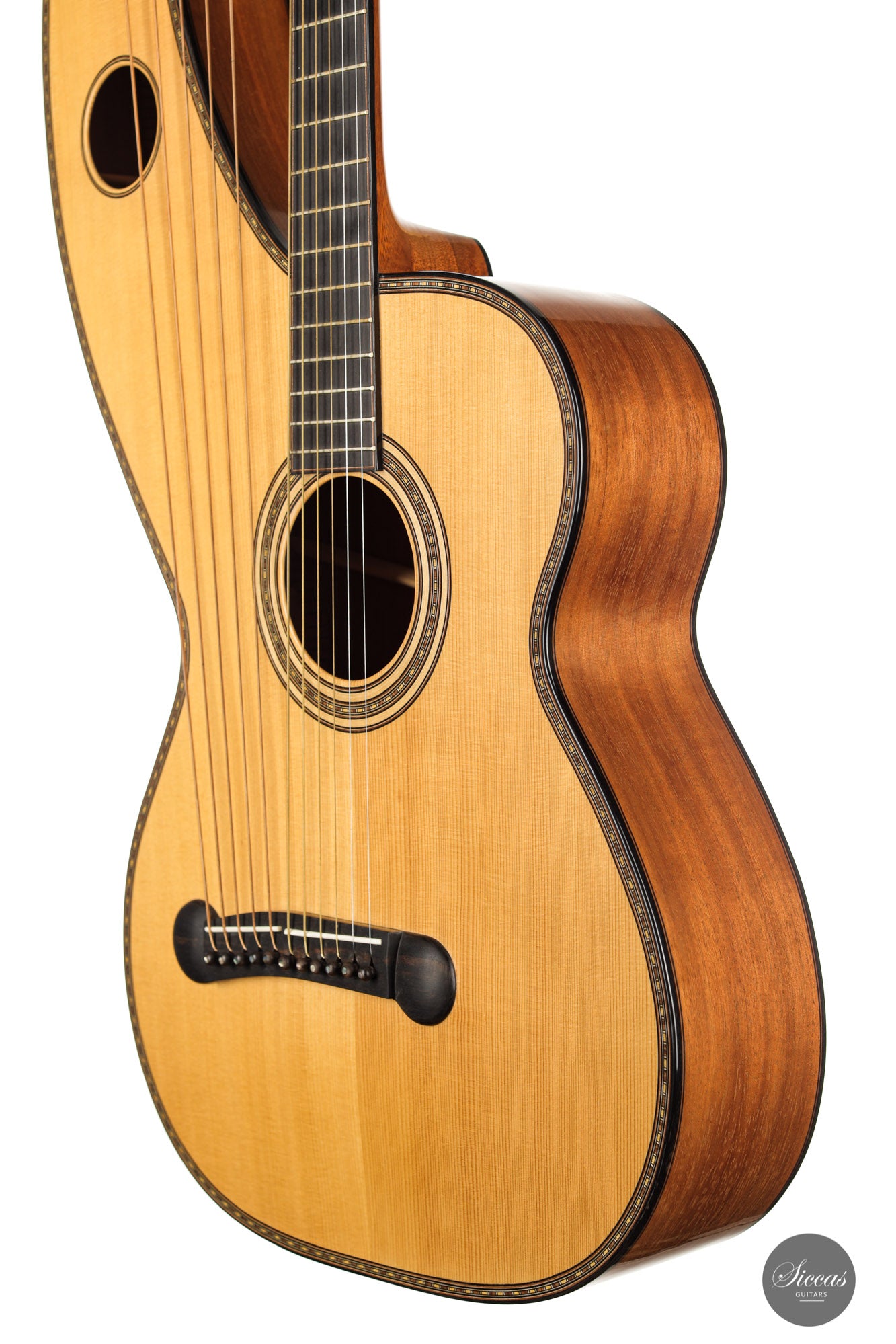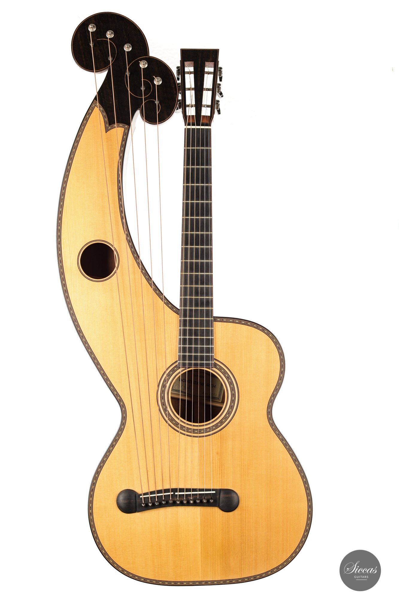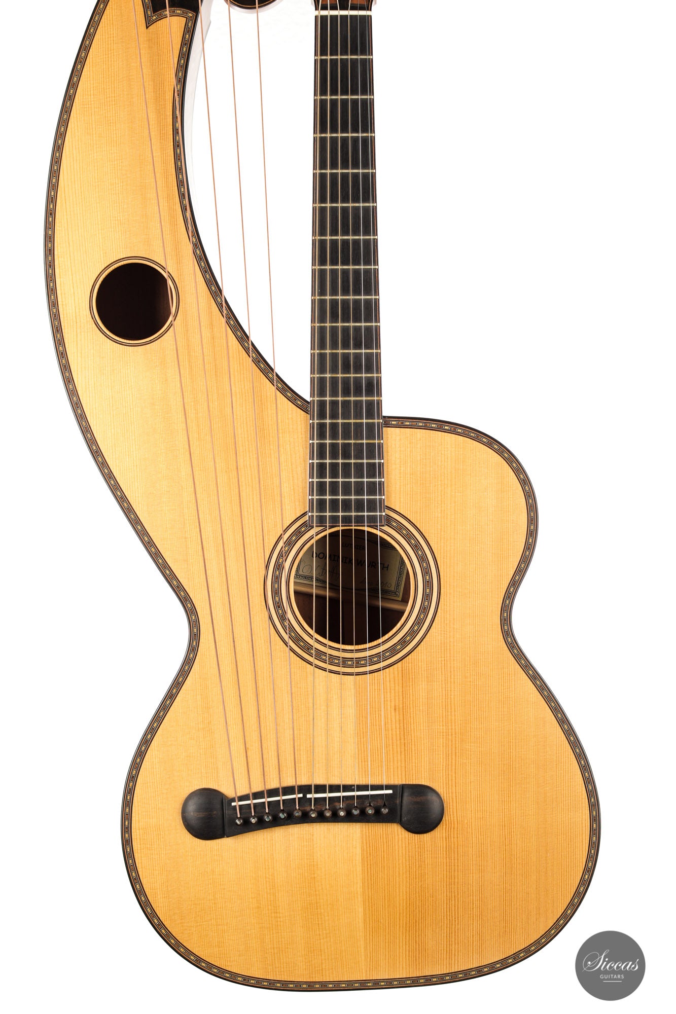 The sound is simply amazing, with strong treble voices and a never-ending sustain, paired with the deepest basses you can wish for on a steel-string guitar. It is a real pleasure to play on this harp guitar, also because these models are not easy to find, especially in Europe. In terms of craftsmanship, this harp guitar by Dominik Wurth is of the highest standard, also considering the rather complex construction with all its bindings and inlays. The reverb effect created by the additional basses is very inspiring and it is almost hard to put this wonderful instrument out of your hand.