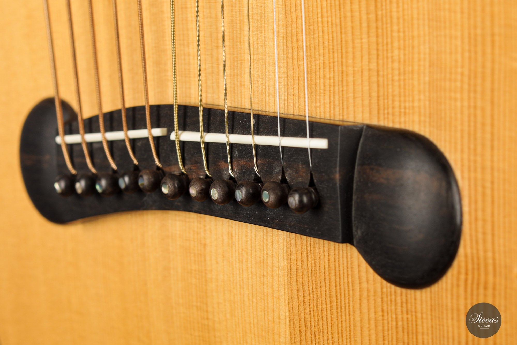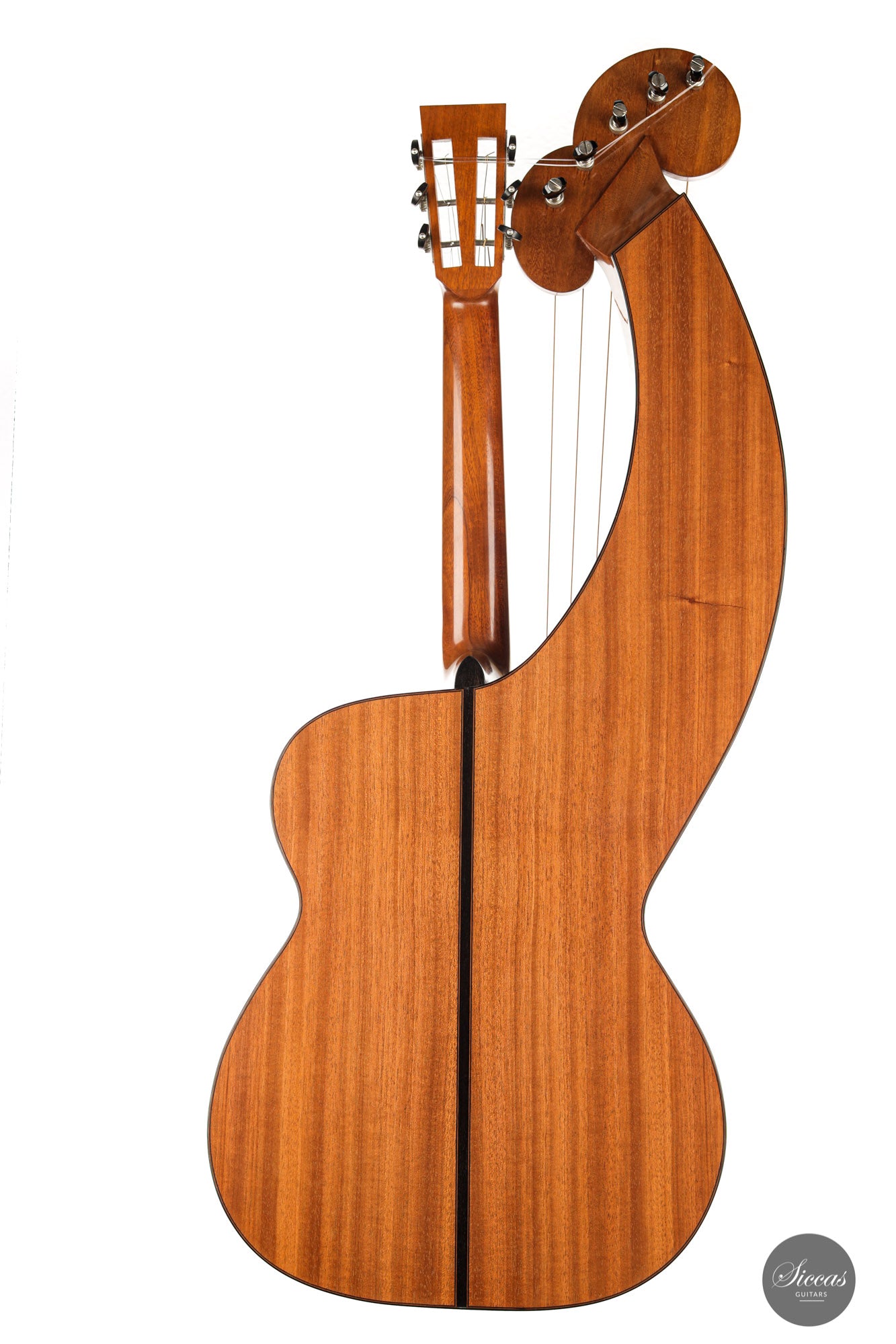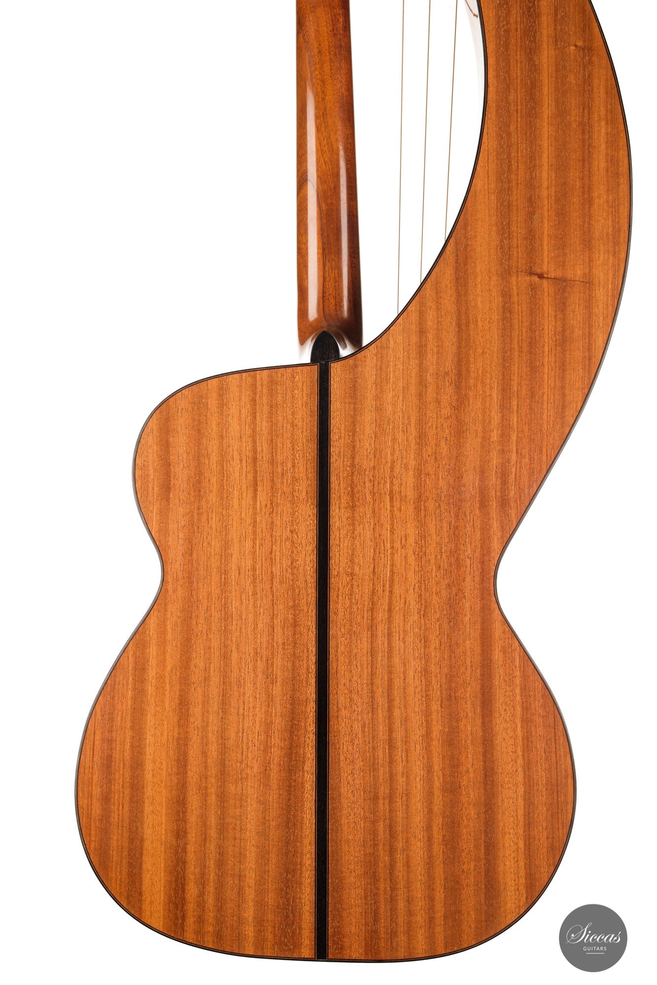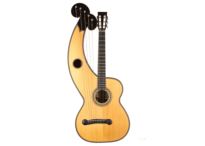 The sound is simply amazing, with strong treble voices and a never-ending sustain, paired with the deepest basses you can wish for on a steel-string guitar. It is a real pleasure to play on this harp guitar, also because these models are not easy to find, especially in Europe. In terms of craftsmanship, this harp guitar by Dominik Wurth is of the highest standard, also considering the rather complex construction with all its bindings and inlays. The reverb effect created by the additional basses is very inspiring and it is almost hard to put this wonderful instrument out of your hand.