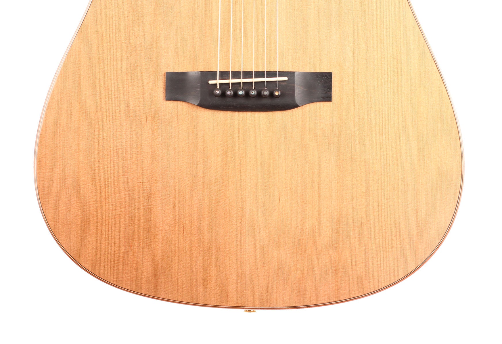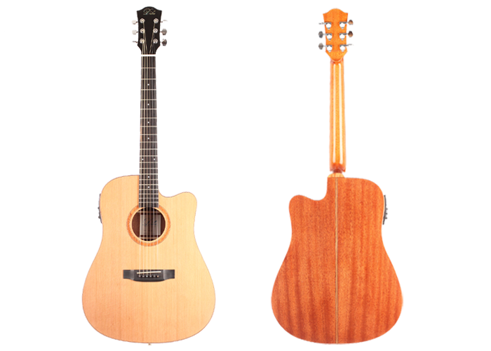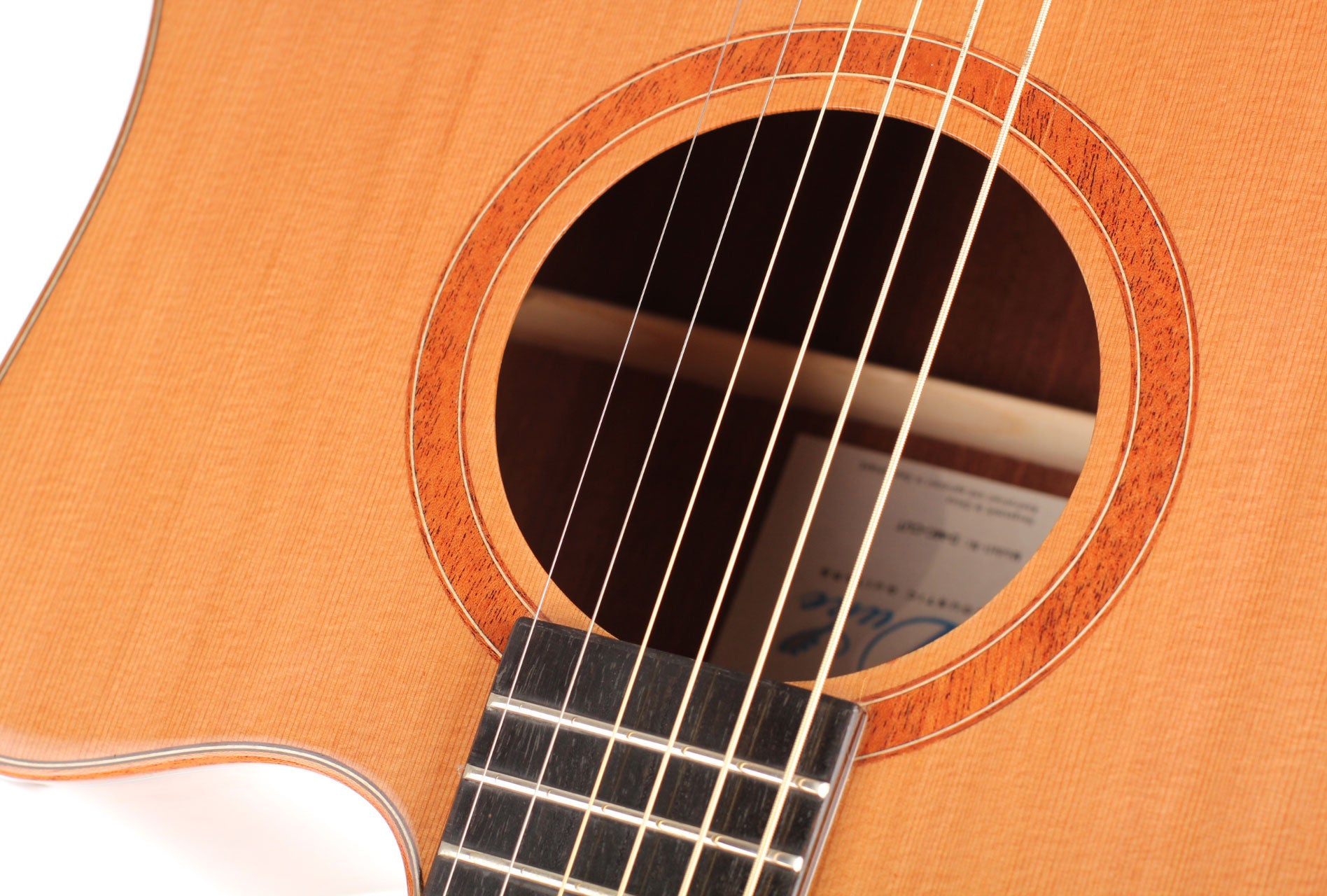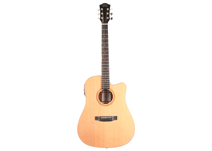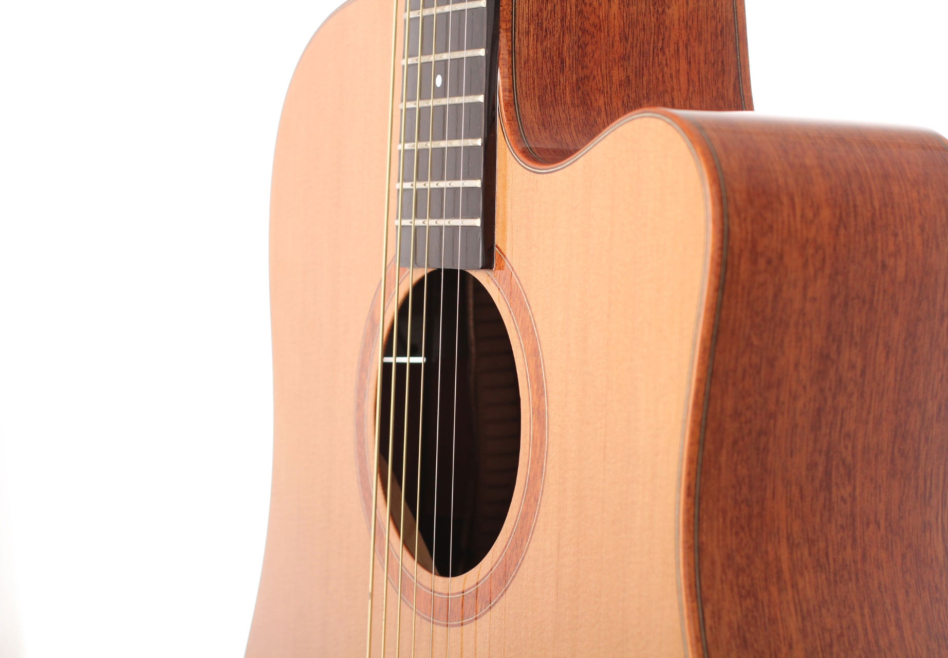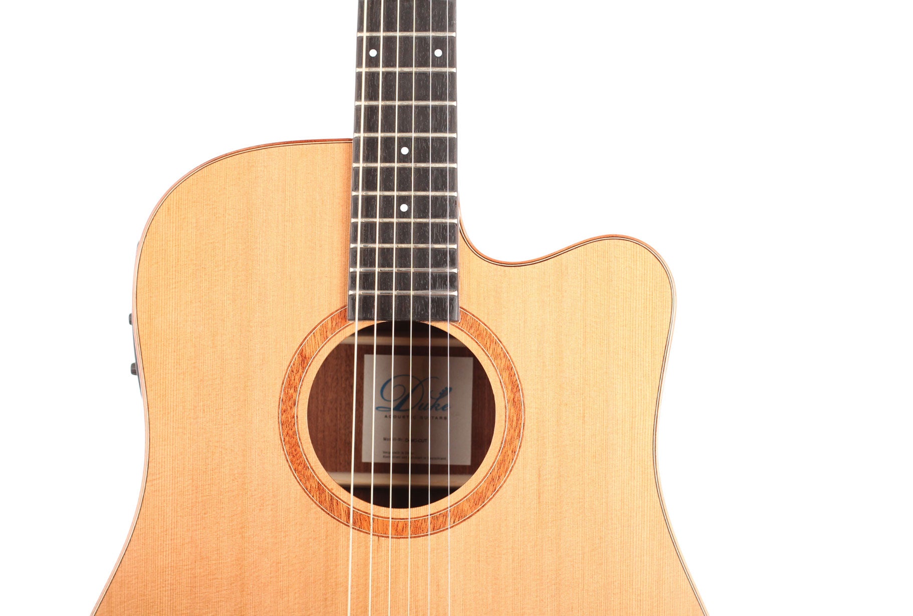 This Duke Dreadnought with cutaway guitar has an exceptional quality. It has a very powerful and equilibrated sound. This guitar is perfect for beginners and also professional players. The Duke D-MC-Cut guitar has a solid cedar top and back and sides that are made of mahogany. The guitars are refined with a high gloss finish. Included is a gig-bag by Duke.