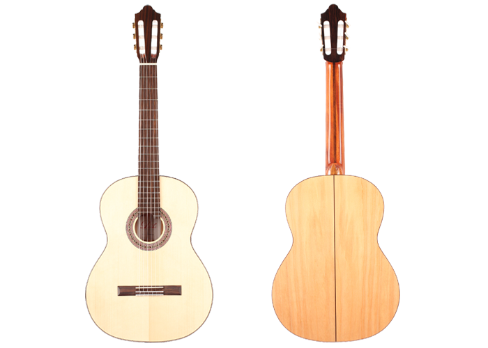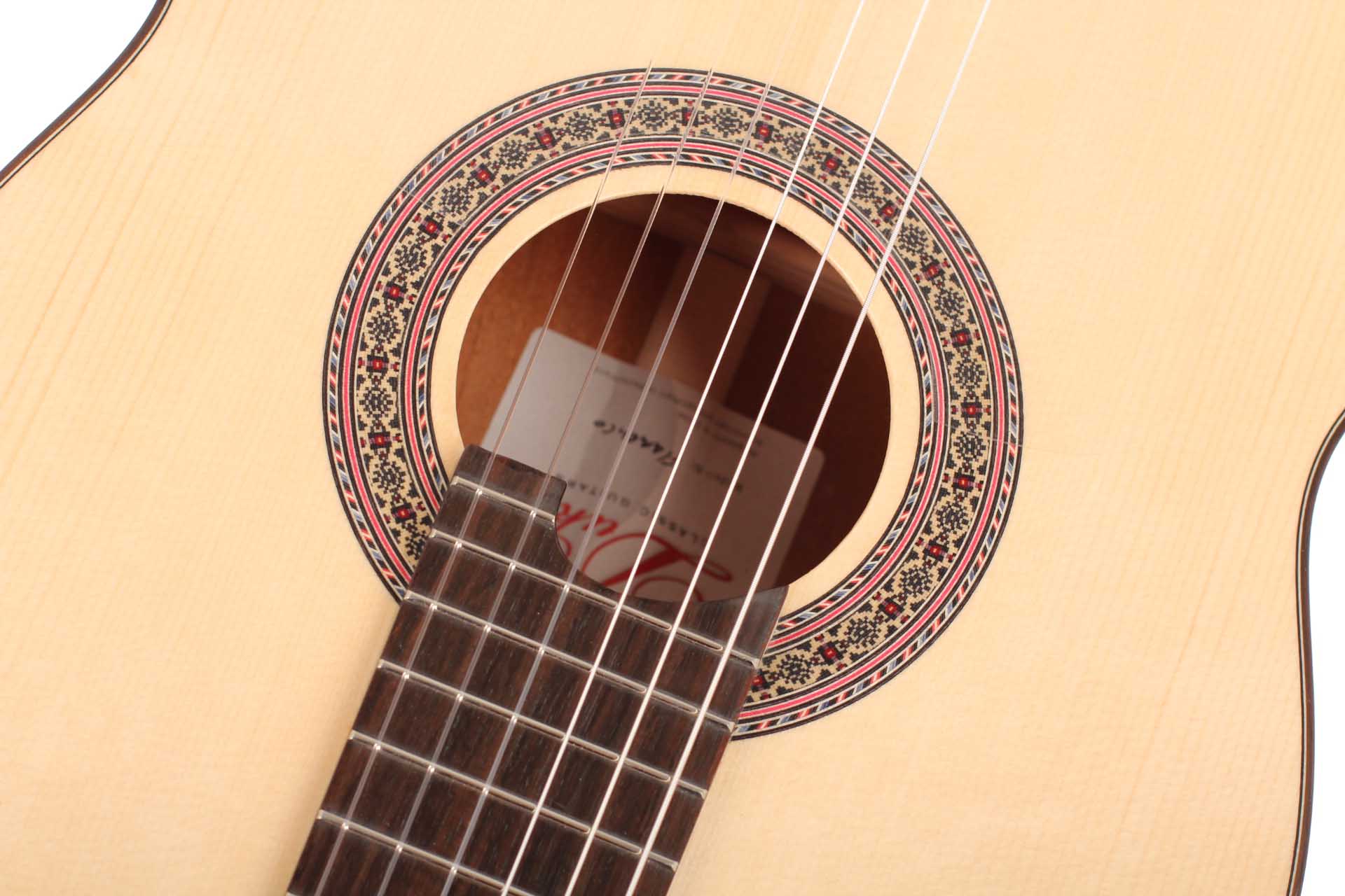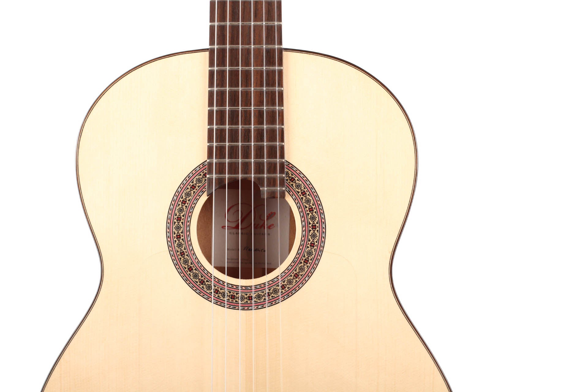 This beautiful Duke Flamenco guitar convinces through it's sound and construction. The top is made of spruce, back and sides are made of very fine cypress. The neck is made of cedro and is reinforced with Indian rosewood. The machine heads are R1 by Rubner, it has an golpeador and a high gloss finish.