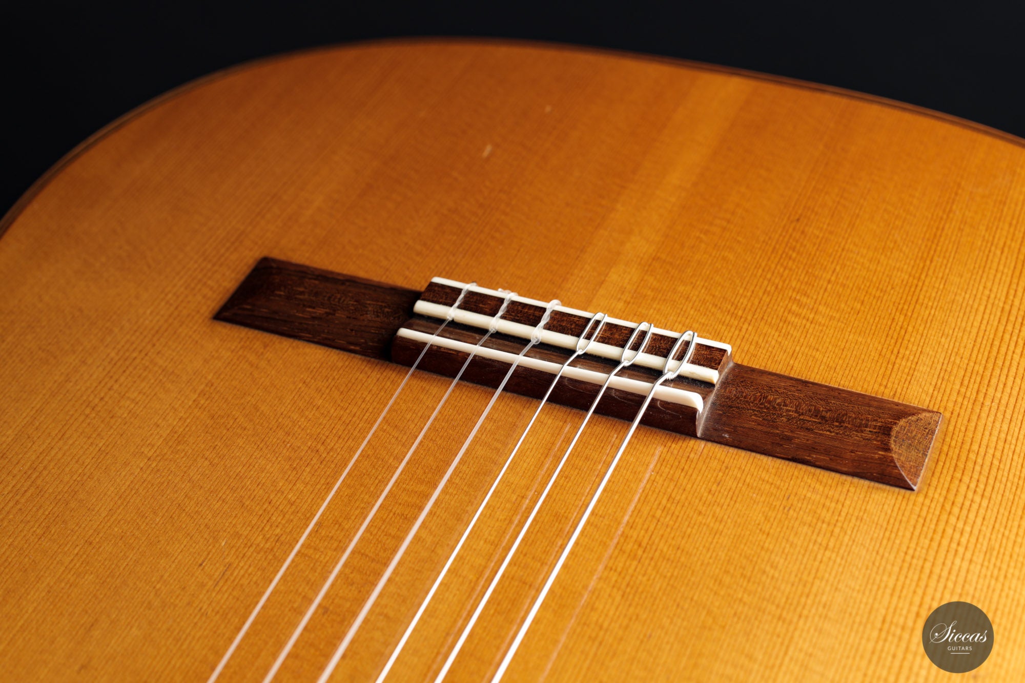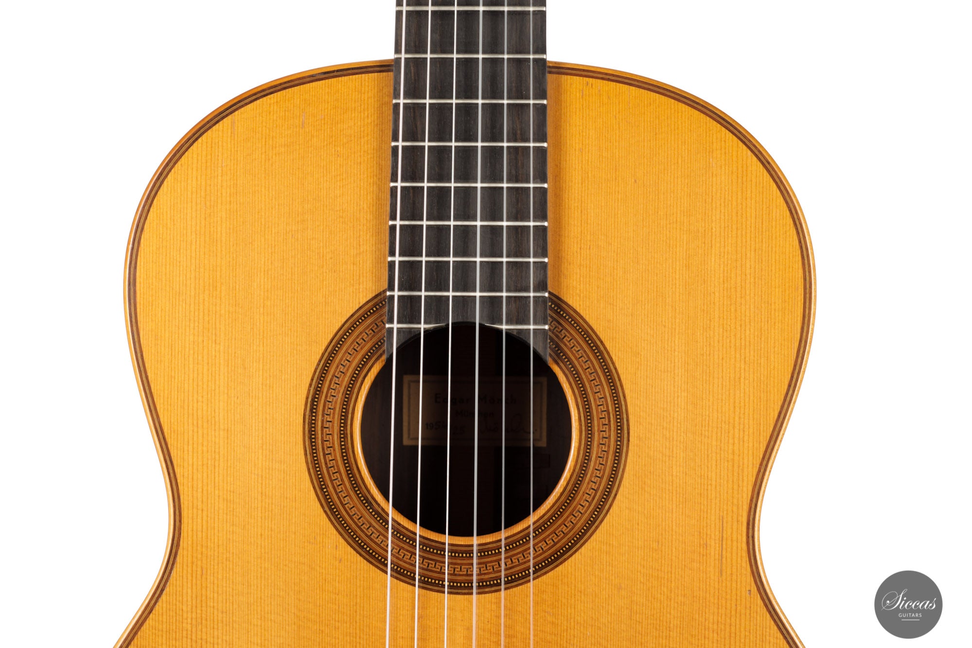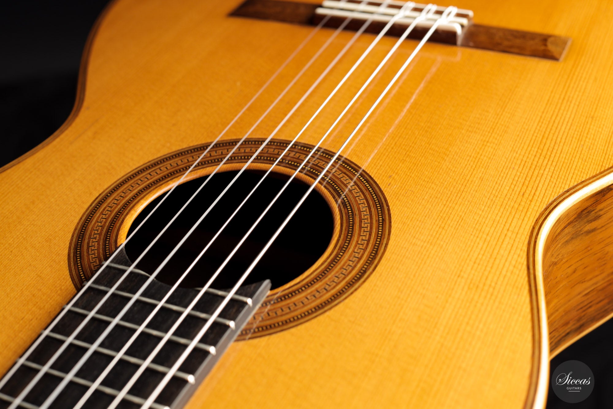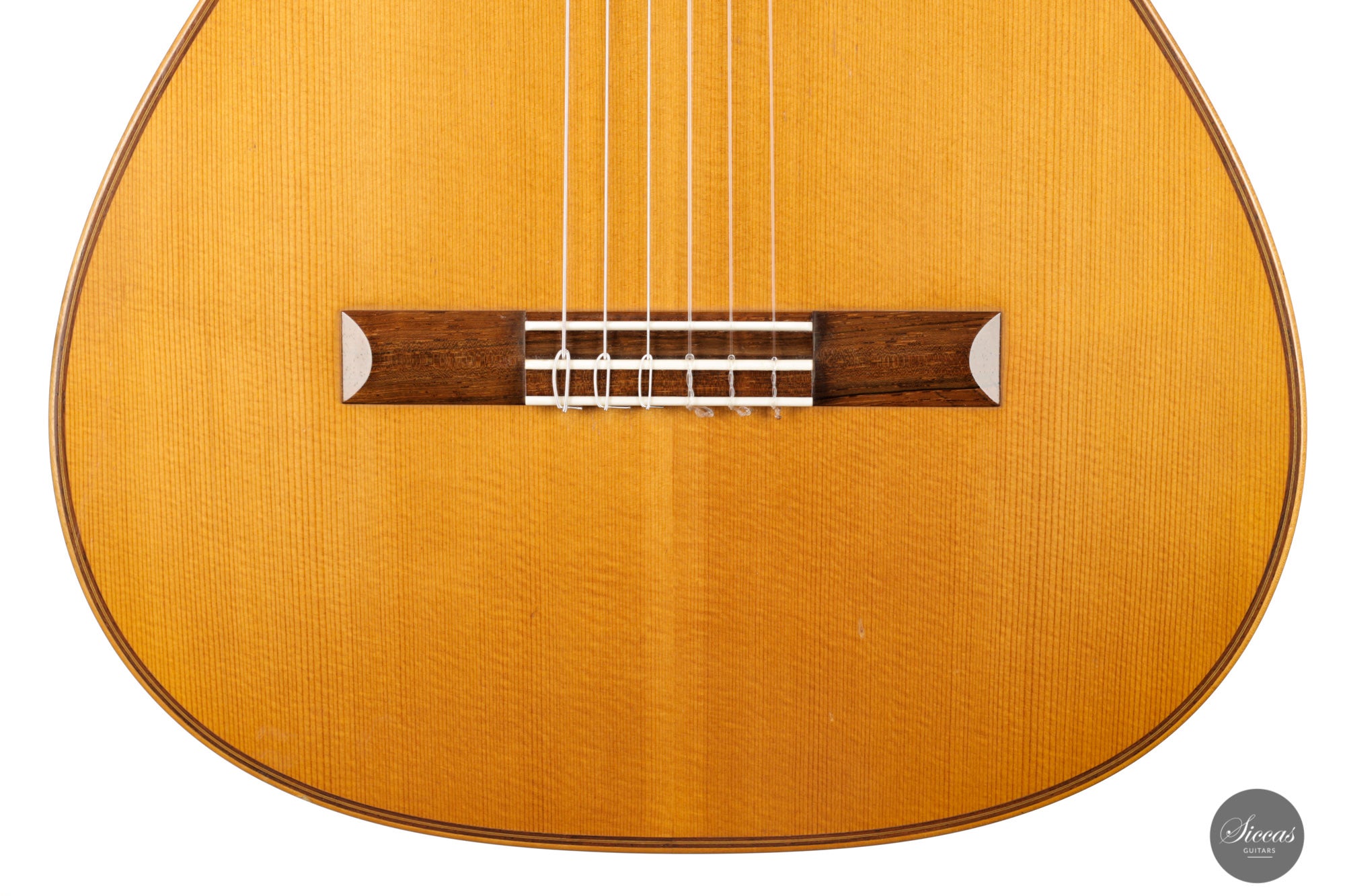 Visually, this guitar, made of spruce and Brazilian rosewood (CITES-certified), is especially captivating due to its maze-like rosette and beautiful honey-colored soundboard. Moreover, this very instrument is illustrated in the highly recommendable book "34 Classical Guitars in Life-Size" by Alberto Martinez, published by Camino Verde. Considering its age, it is in very good condition with only one repaired hairline crack on the top, one repaired crack on the back and the doubled fingerboard. All repairs have been carried out professionally, so this wonderful guitar is currently in fantastic playing condition.