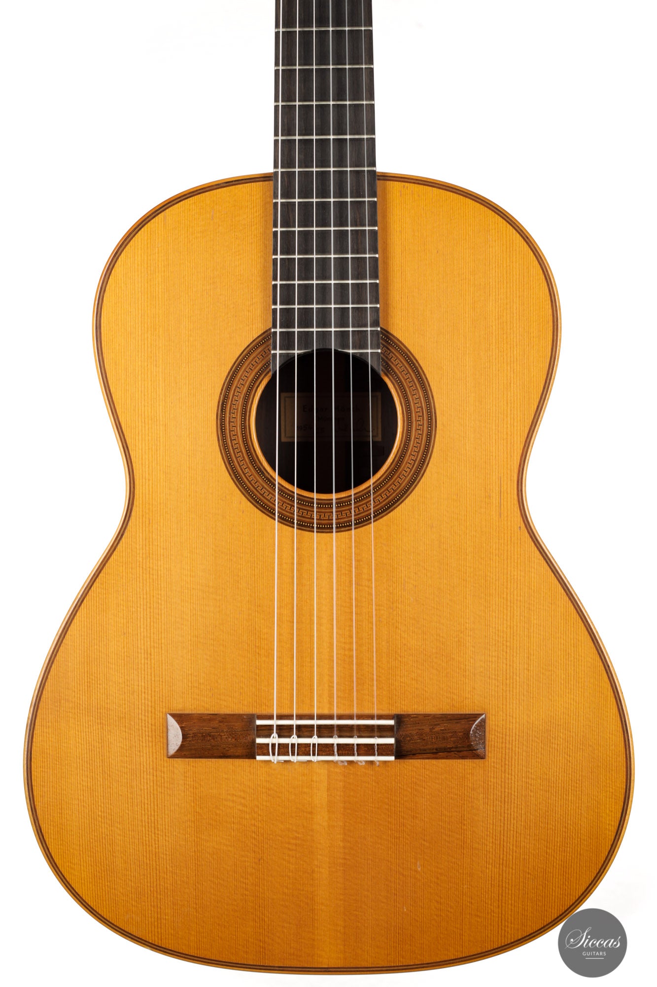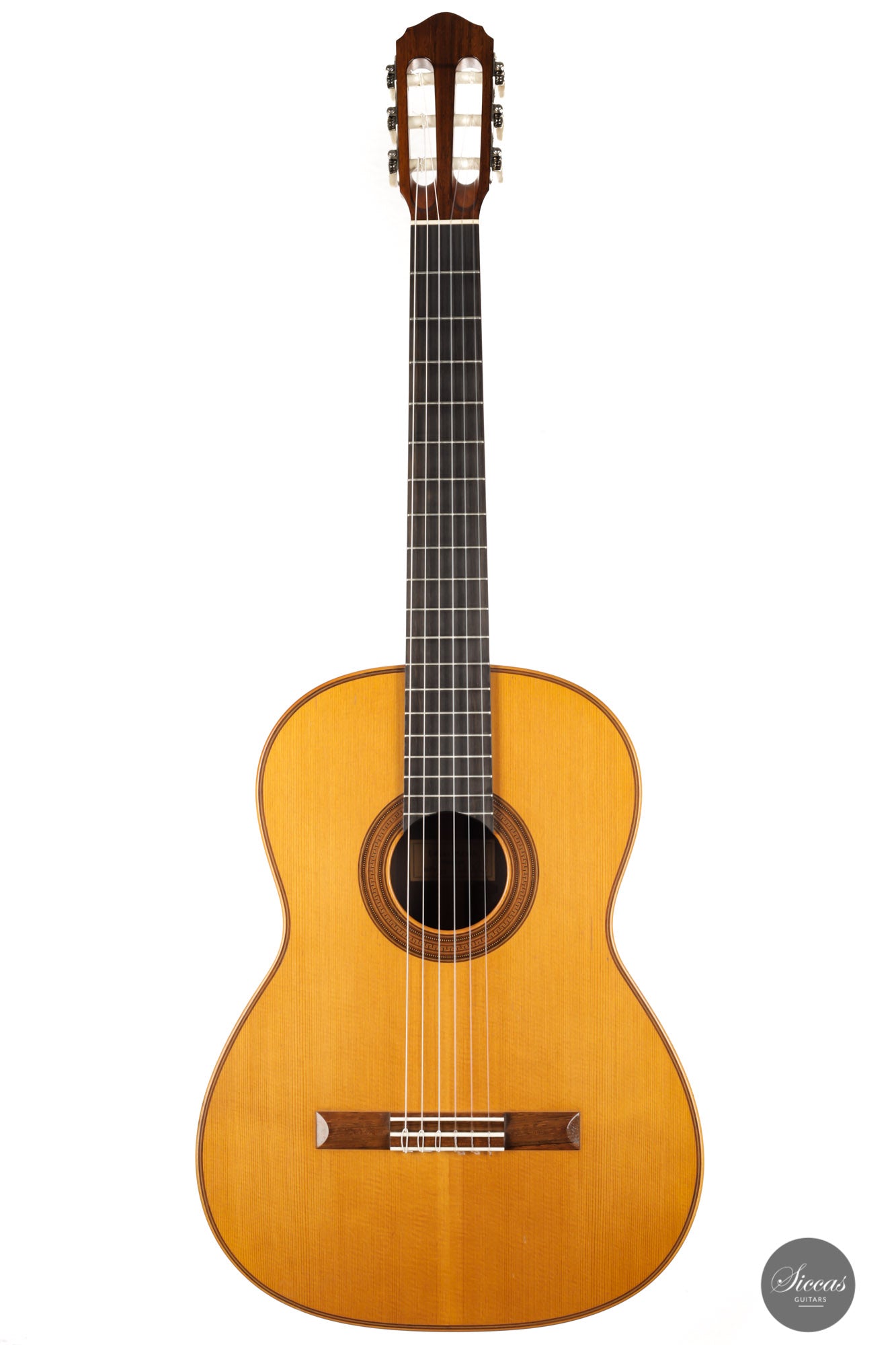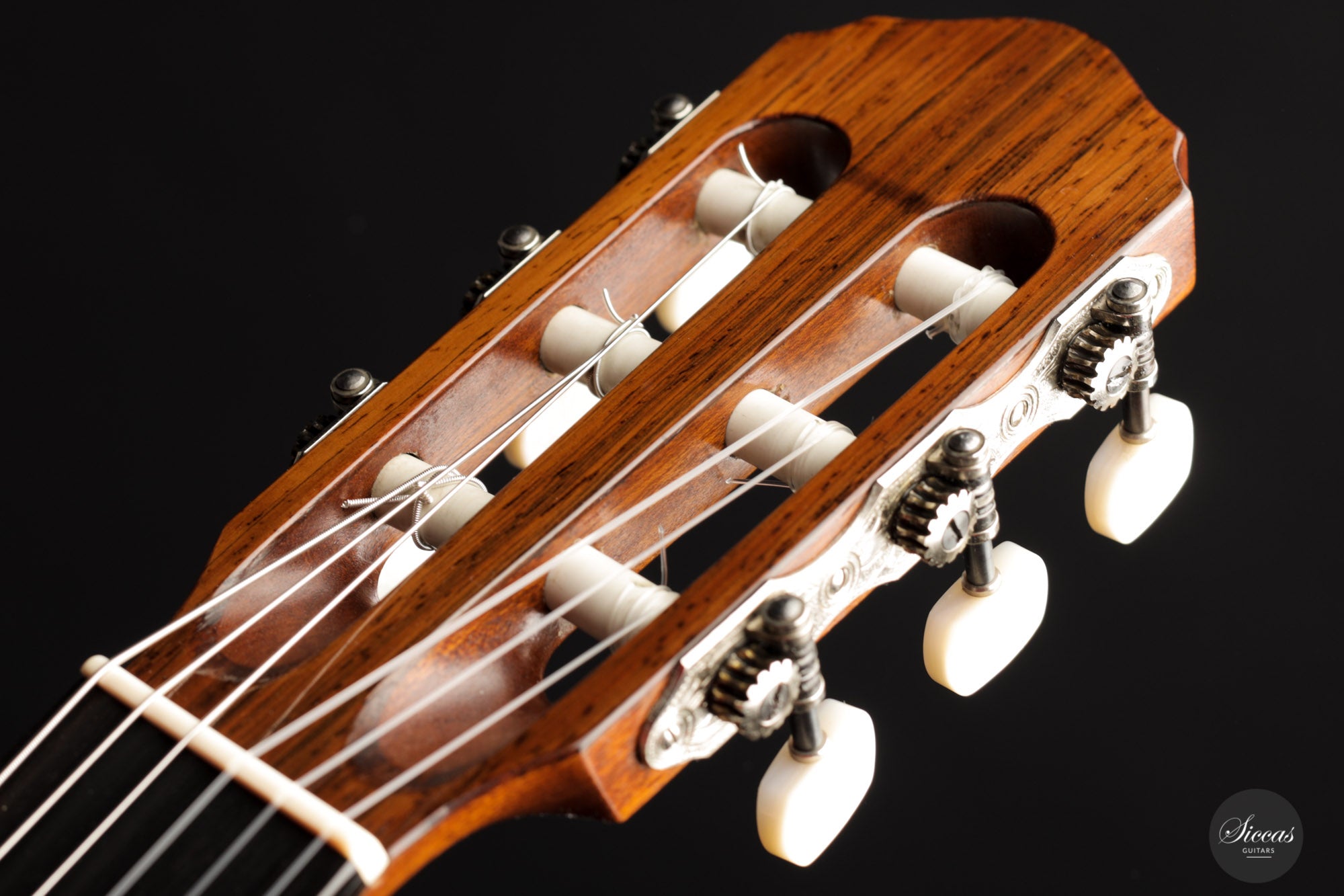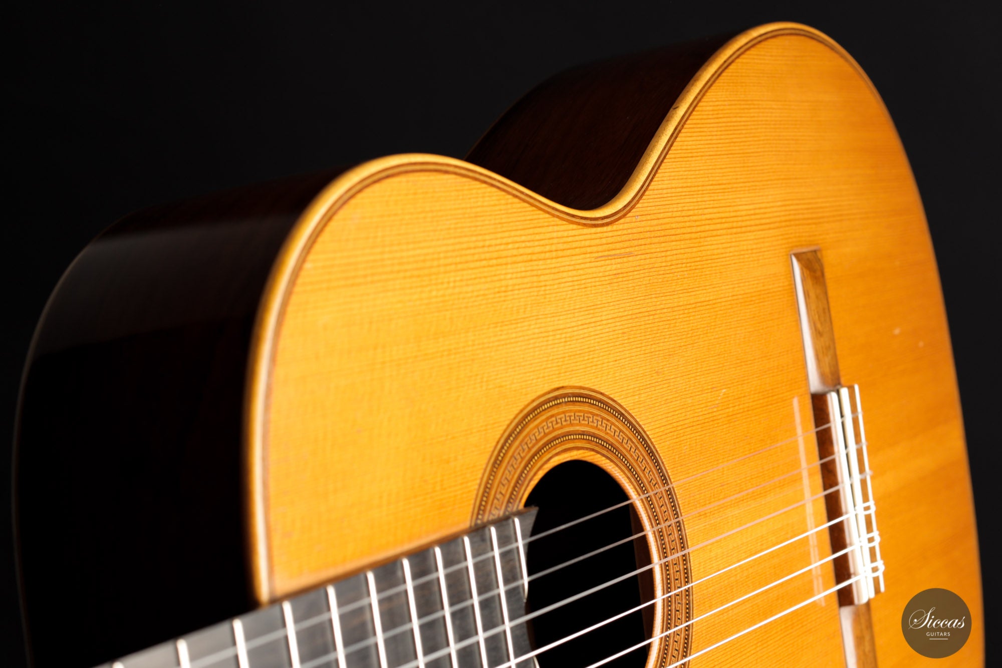 Visually, this guitar, made of spruce and Brazilian rosewood (CITES-certified), is especially captivating due to its maze-like rosette and beautiful honey-colored soundboard. Moreover, this very instrument is illustrated in the highly recommendable book "34 Classical Guitars in Life-Size" by Alberto Martinez, published by Camino Verde. Considering its age, it is in very good condition with only one repaired hairline crack on the top, one repaired crack on the back and the doubled fingerboard. All repairs have been carried out professionally, so this wonderful guitar is currently in fantastic playing condition.