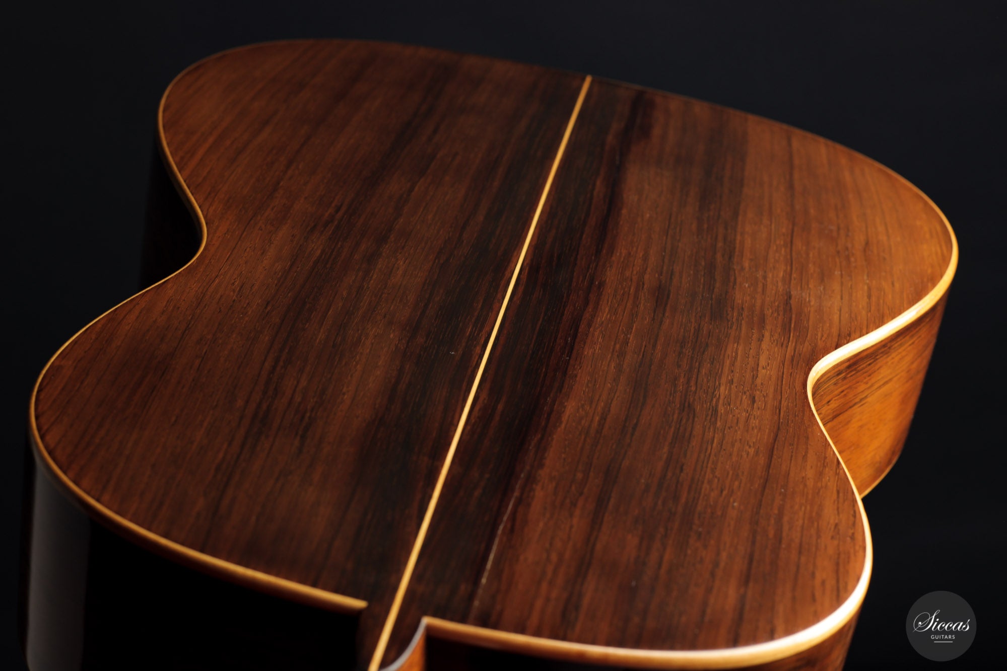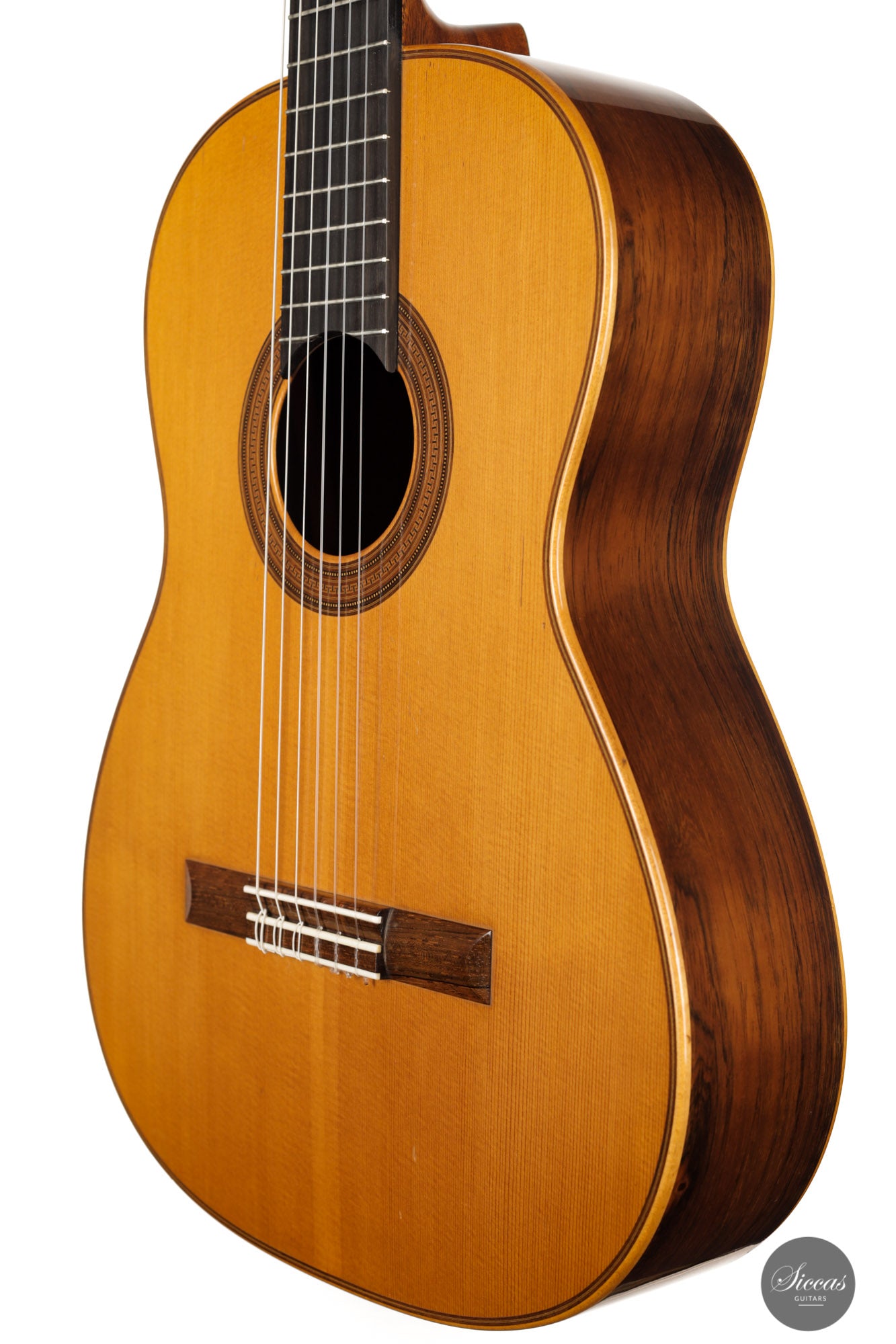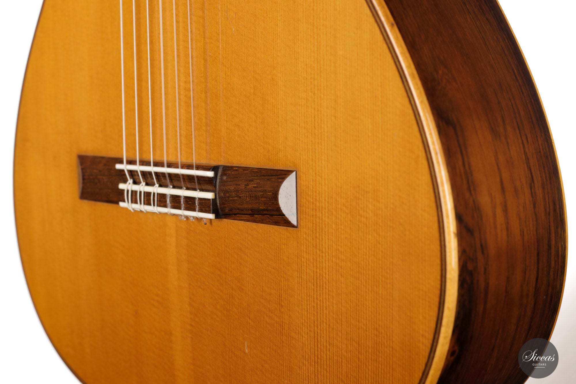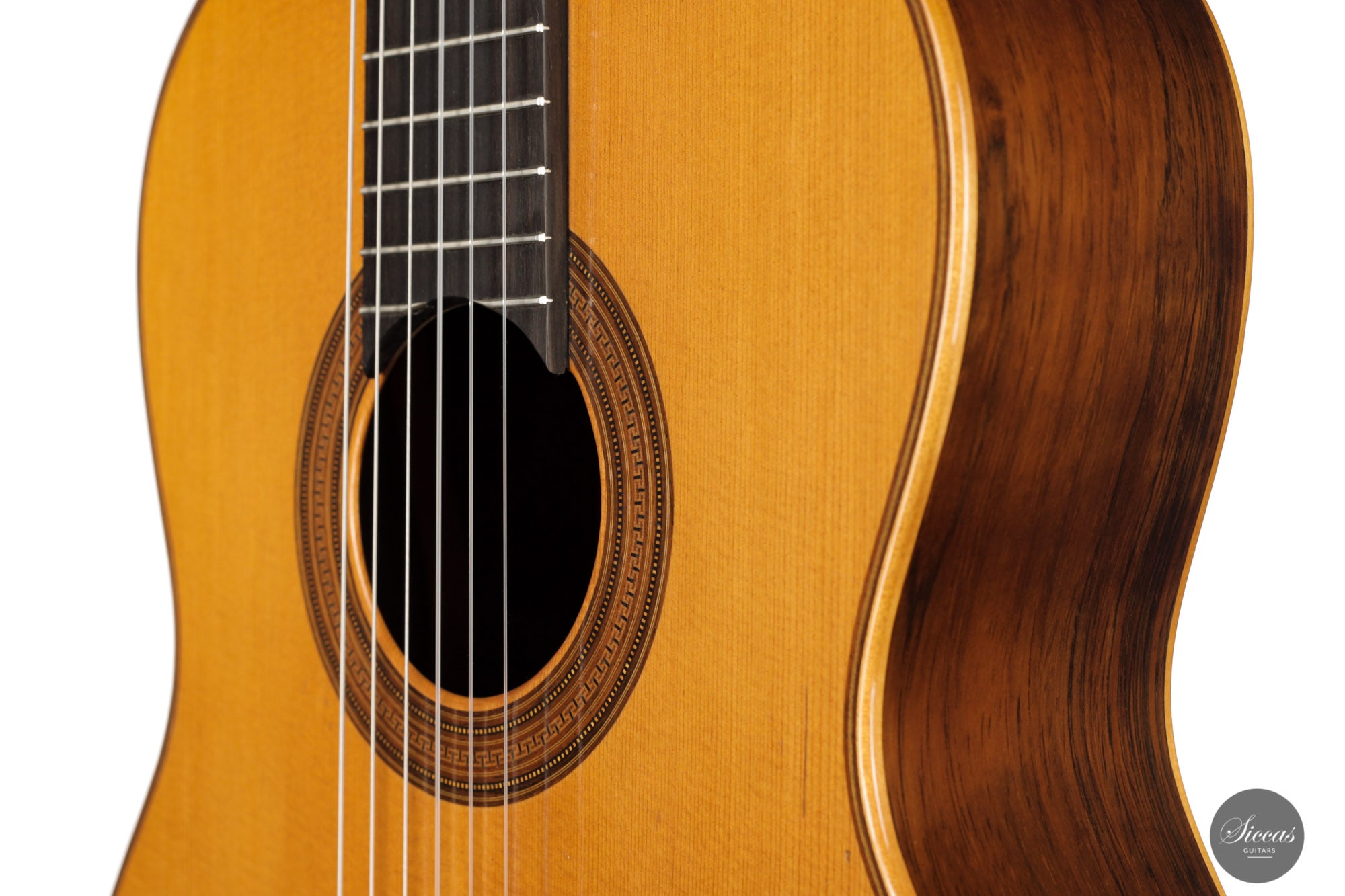 Visually, this guitar, made of spruce and Brazilian rosewood (CITES-certified), is especially captivating due to its maze-like rosette and beautiful honey-colored soundboard. Moreover, this very instrument is illustrated in the highly recommendable book "34 Classical Guitars in Life-Size" by Alberto Martinez, published by Camino Verde. Considering its age, it is in very good condition with only one repaired hairline crack on the top, one repaired crack on the back and the doubled fingerboard. All repairs have been carried out professionally, so this wonderful guitar is currently in fantastic playing condition.