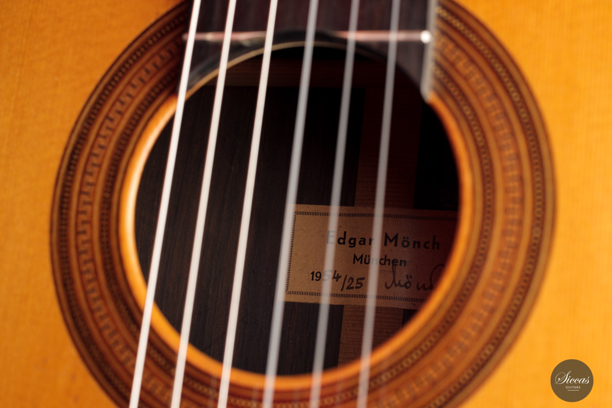 It was while he was a German prisoner of war in an English POW camp that he got involved in guitar making. There he met a Wroclaw luthier who showed him how to make a guitar. Released from captivity in 1947, Edgar Mönch began working as a luthier. He perfected his knowledge of guitar making by studying in Spain with guitar maker friend Marcelo Barbero in Madrid. Edgar Mönch's skill and drive for perfection earned him worldwide recognition. He worked very precisely and self-critically like rarely any other German luthier before. Edgar willingly passed on his knowledge to his students, and world-renowned luthiers such as John Larrivee, Kolya Panhuyzen, Ken Bowen and Joseph Kurek grew out of his workshop. Two months after his son's passing, Edgar Mönch himself died on February 16, 1977. Segovia, Julian Bream, John Williams, Vicente Gomez and many other guitarists around the world played and still play a Mönch guitar.