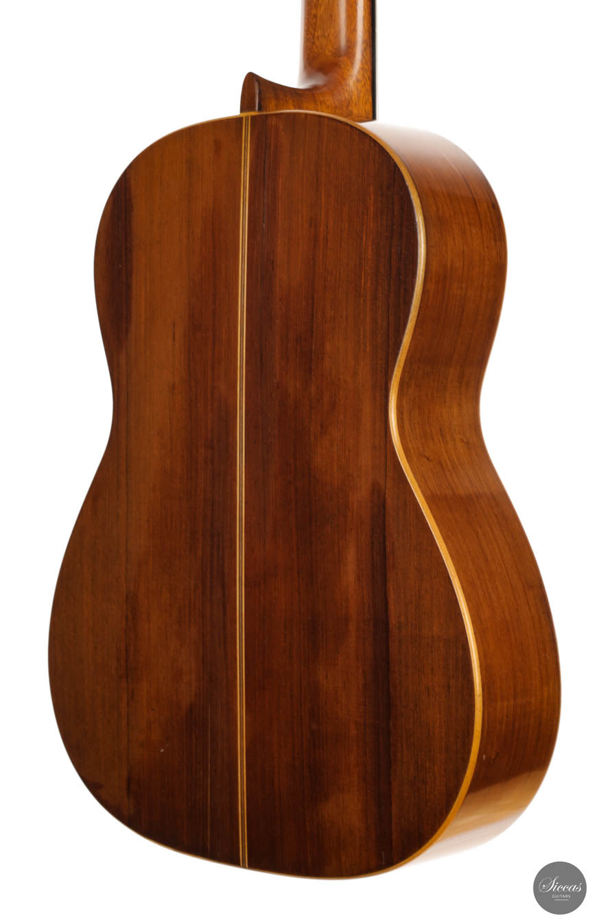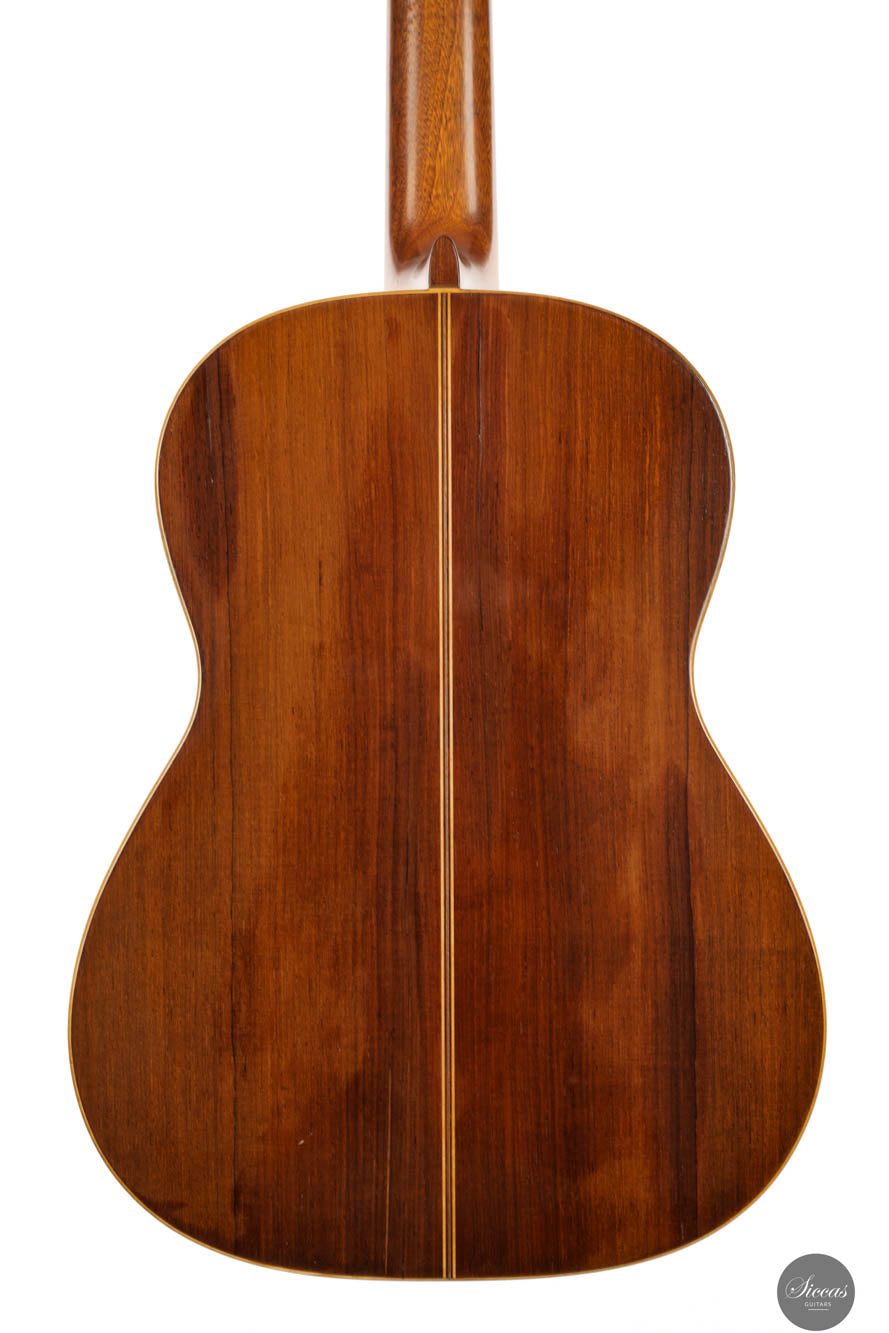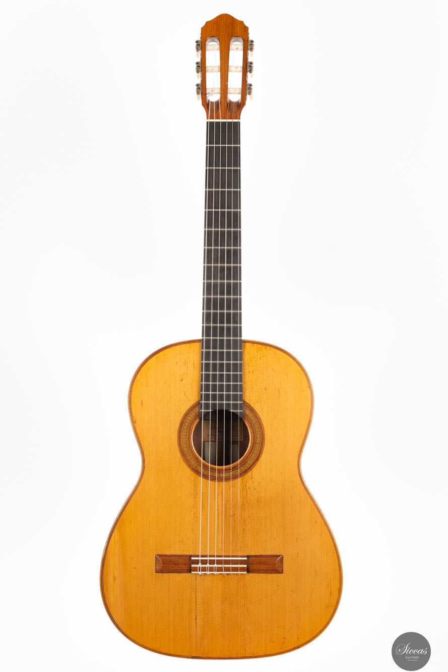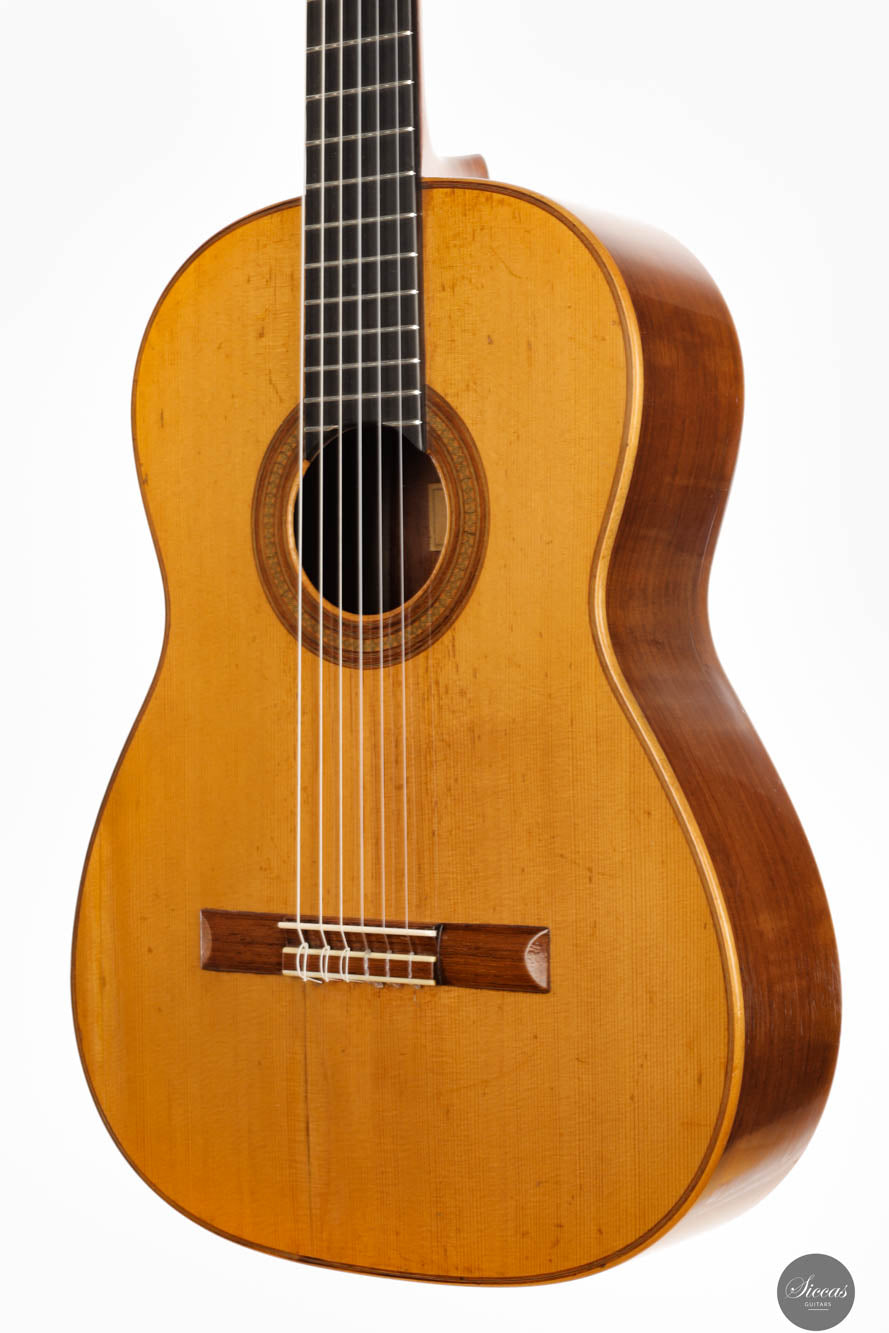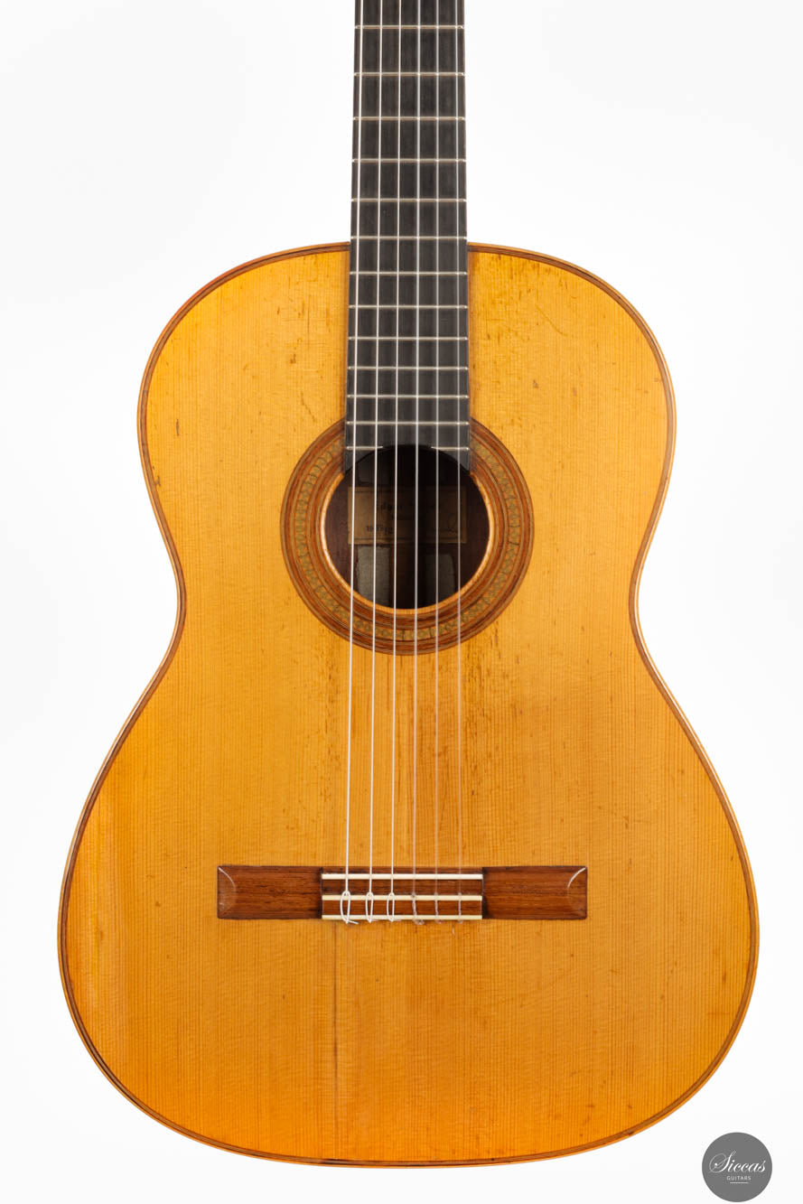 Guitars from the “Munich Epoch,” a brief but intensely creative period, are exceedingly rare and highly coveted by collectors and musicians alike. This particular guitar features a distinctive bracing pattern, with a central five-fan system flanked by two vertical V-bars, echoing the designs of Marcello Barbero. Its construction and sound quality often draw comparisons to the instruments of Hermann Hauser II, known for their brilliant and crystal-clear trebles. Despite its age, this guitar has been well-preserved with only a few professionally repaired cracks on the soundboard and the striking Brazilian rosewood back and sides. These careful restorations ensure that the guitar not only maintains its historical value but also remains in excellent playing condition, ready to deliver its exceptional sound to new generations of musicians.
