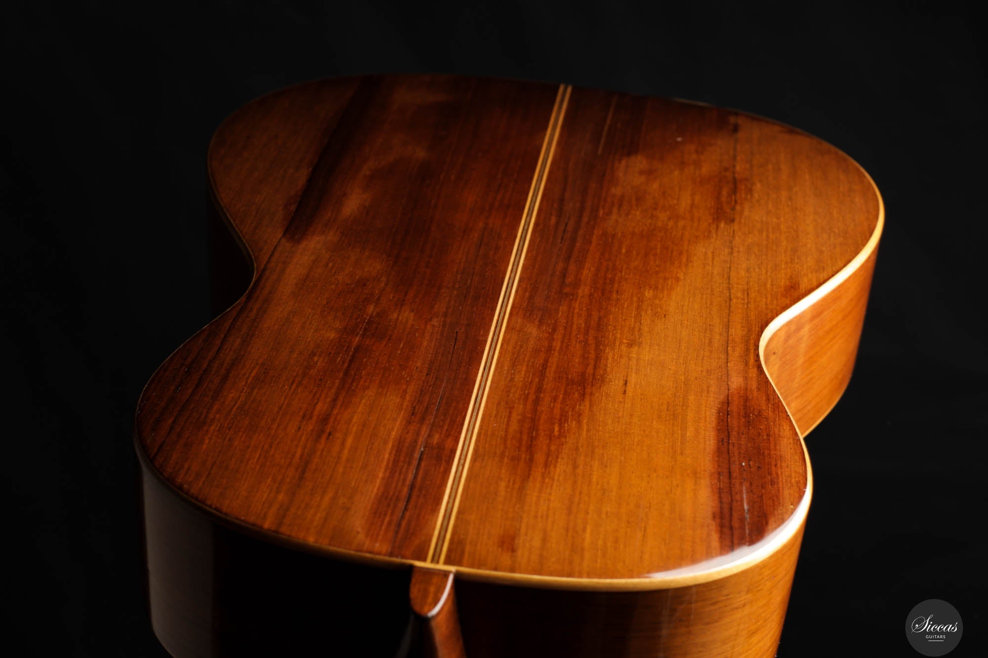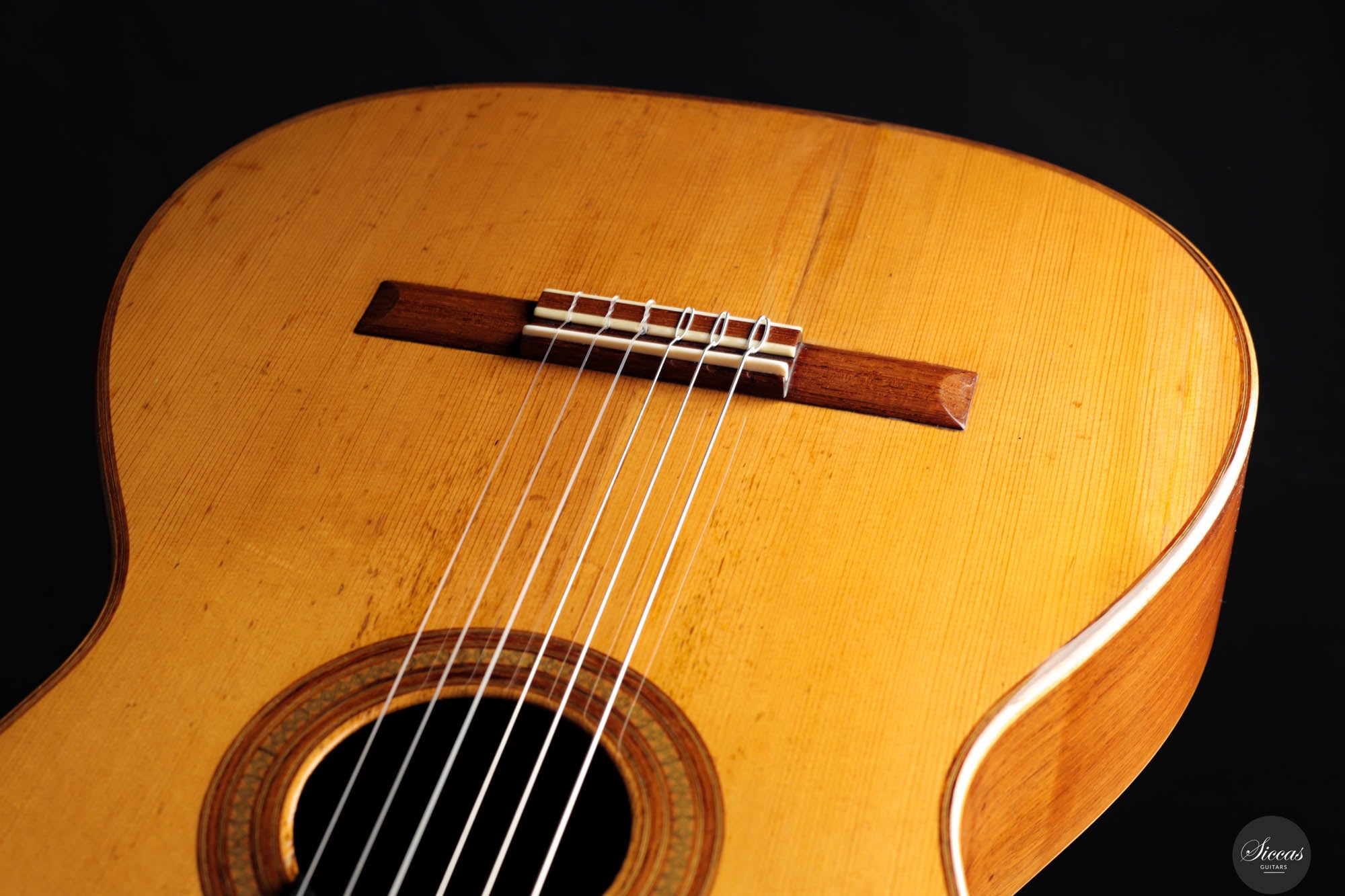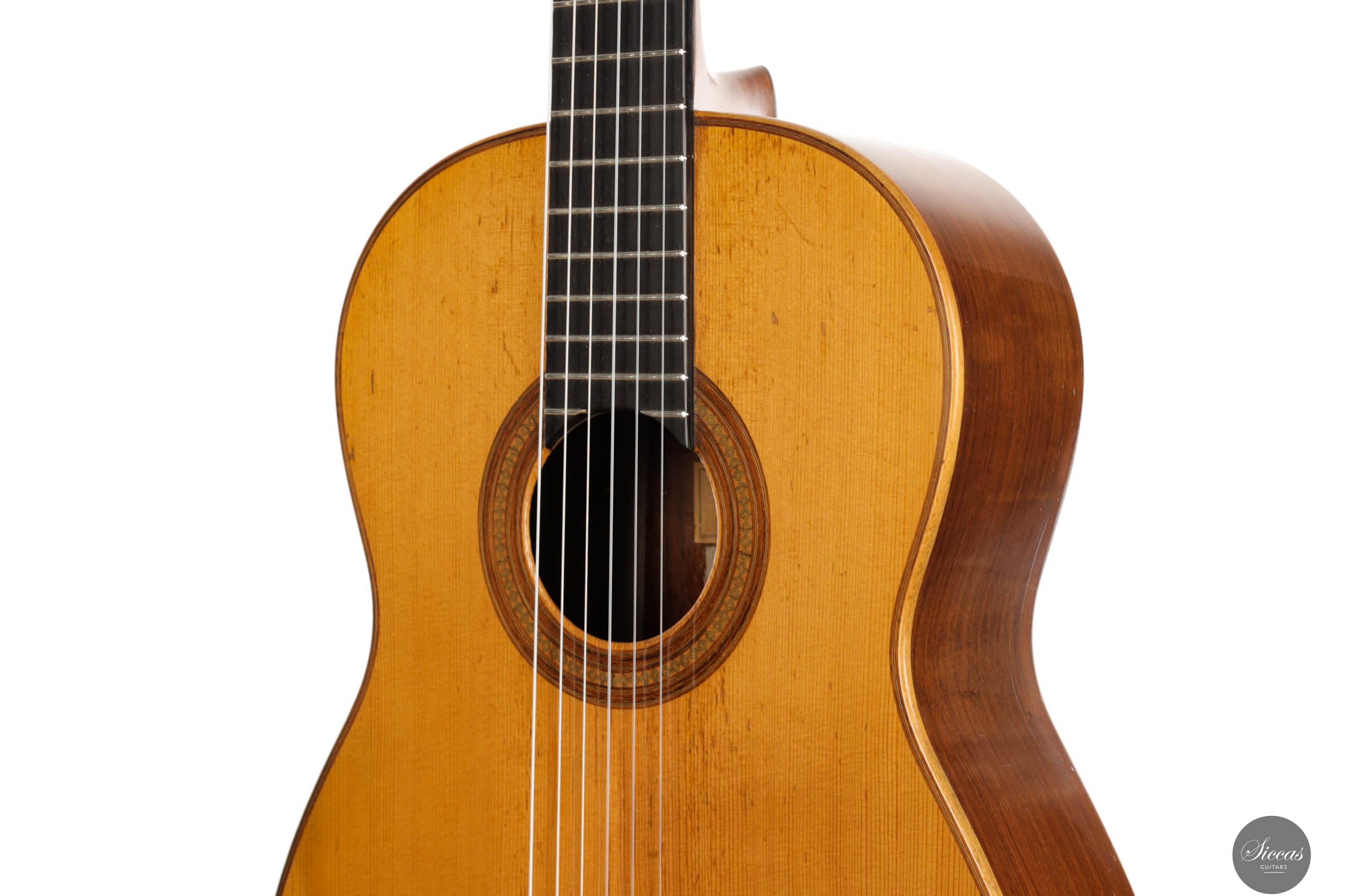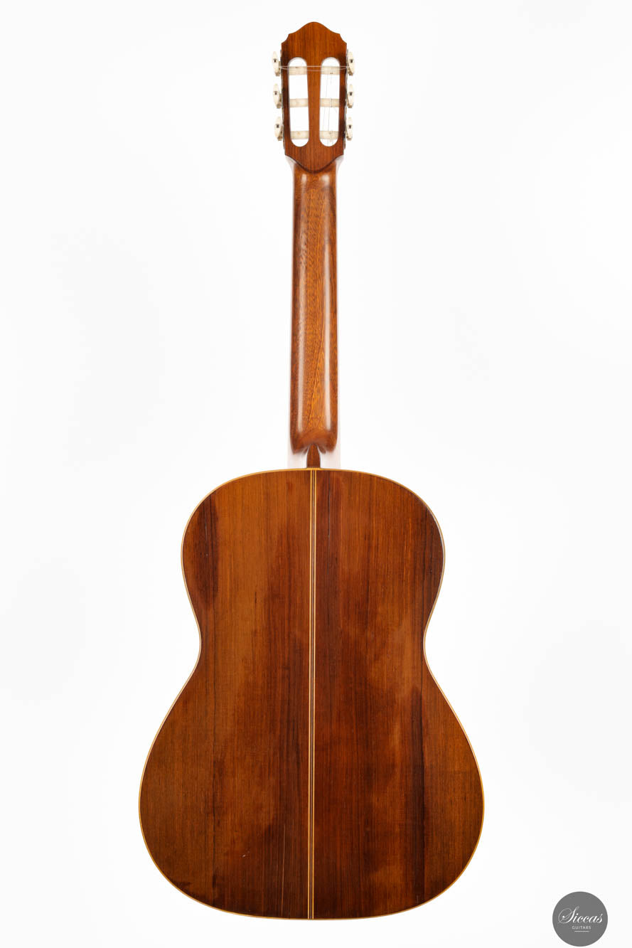 Guitars from the “Munich Epoch,” a brief but intensely creative period, are exceedingly rare and highly coveted by collectors and musicians alike. This particular guitar features a distinctive bracing pattern, with a central five-fan system flanked by two vertical V-bars, echoing the designs of Marcello Barbero. Its construction and sound quality often draw comparisons to the instruments of Hermann Hauser II, known for their brilliant and crystal-clear trebles. Despite its age, this guitar has been well-preserved with only a few professionally repaired cracks on the soundboard and the striking Brazilian rosewood back and sides. These careful restorations ensure that the guitar not only maintains its historical value but also remains in excellent playing condition, ready to deliver its exceptional sound to new generations of musicians.