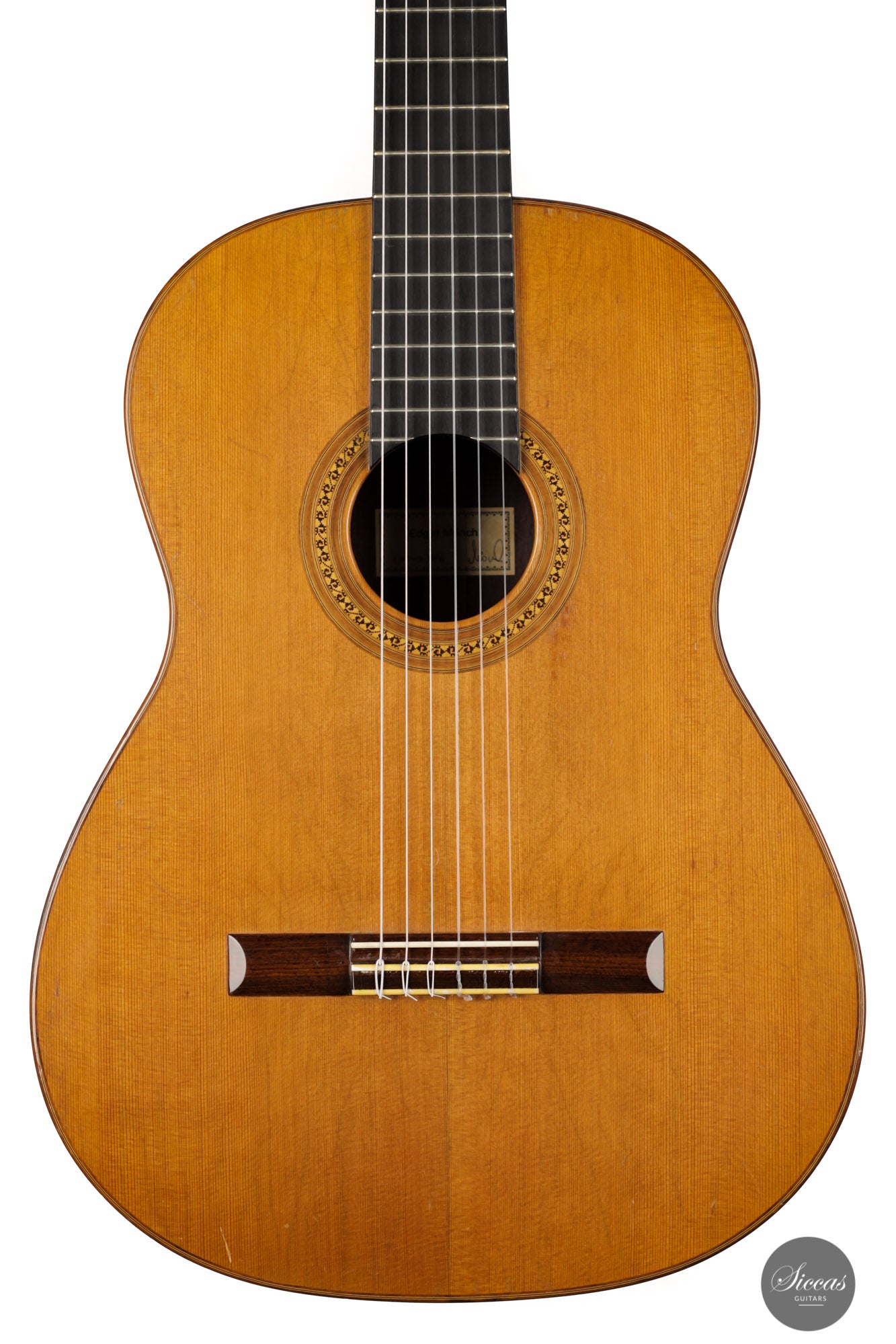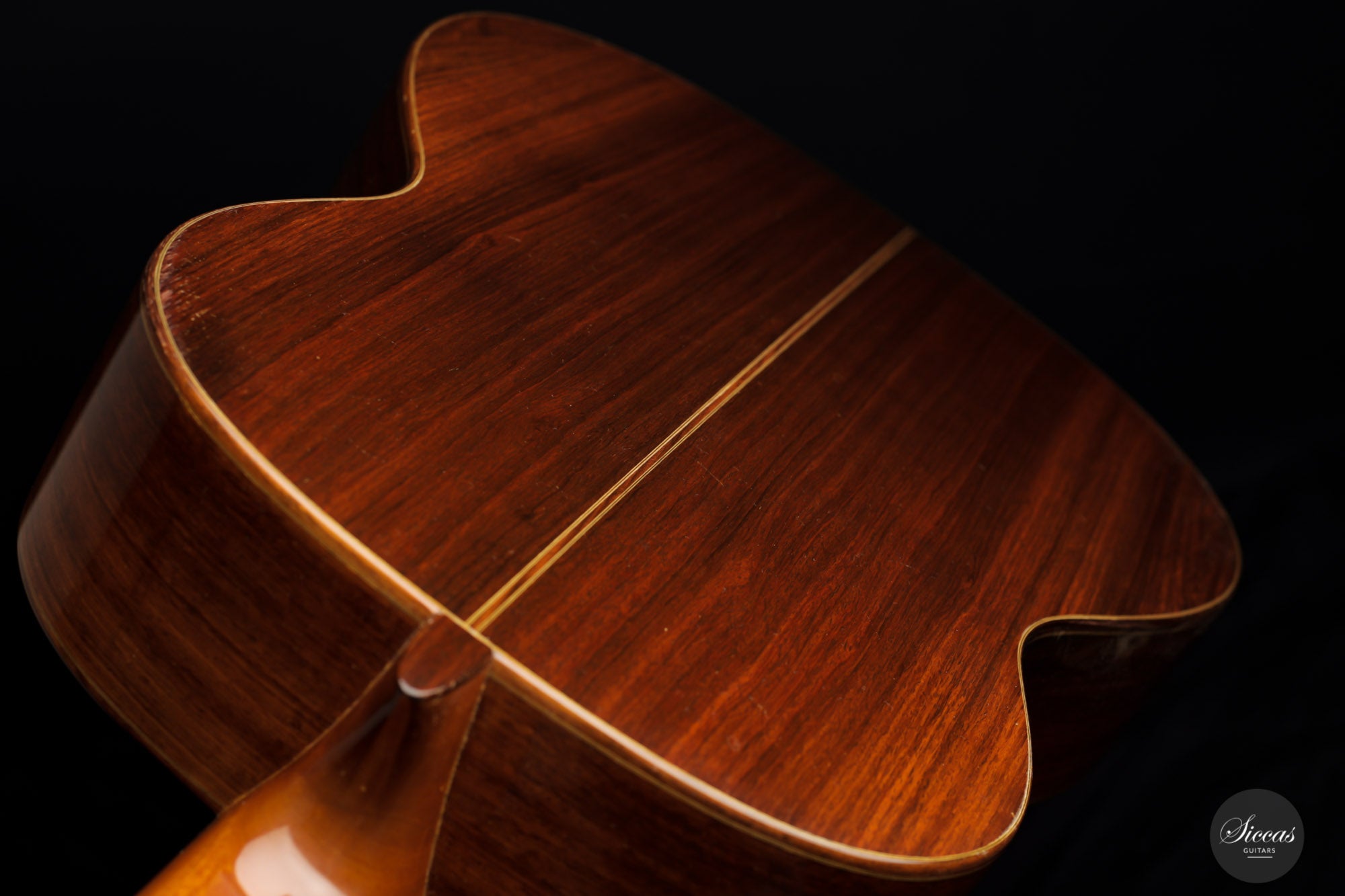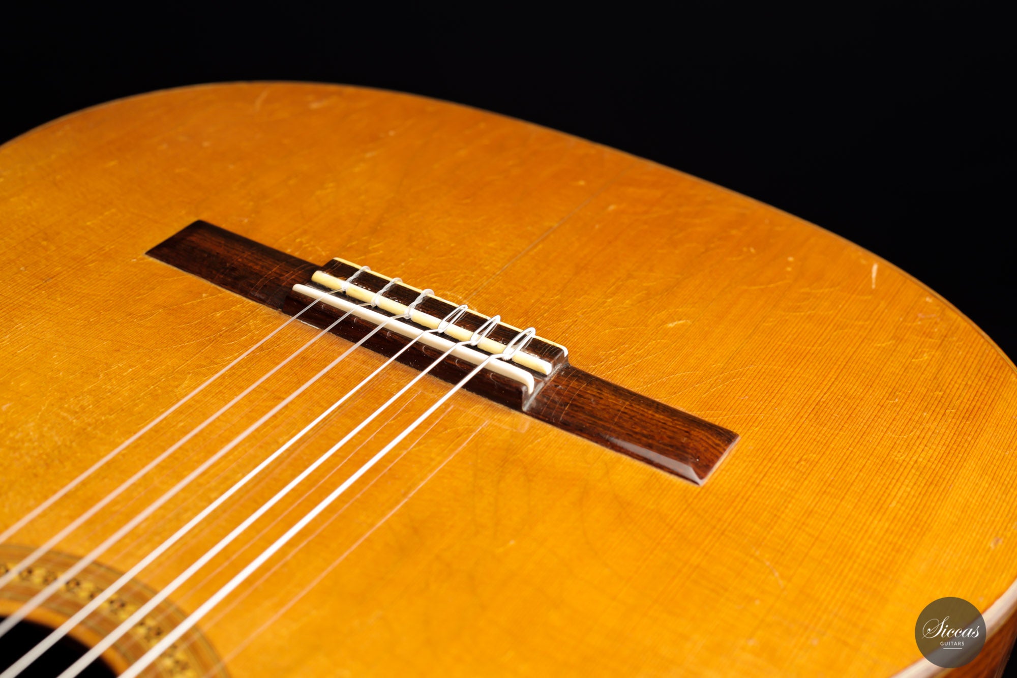 This very interesting guitar was built during the last phase of Edgar Mönch's life when he returned from Canada to settle in Freiburg. Built just a few years before his passing, it impressively reflects Monk's attention to detail and the continual evolution of his construction methods. This cedar top guitar has an incredibly thin, highly resonant back. The top has a traditional fan bracing, but it is highly customized and features an amazingly modern concept for the time. A look inside the guitar reveals the perfection of Edgar Mönch's work. The latter even lightly varnished the inside of the top, back and sides to prevent moisture changes in the wood. The overall condition of this guitar is impressive, there are no cracks, only playing marks, and a stunning craquelé of the nitro lacquer. This is also crackled along the top joint, though the joint is completely closed and structurally intact.