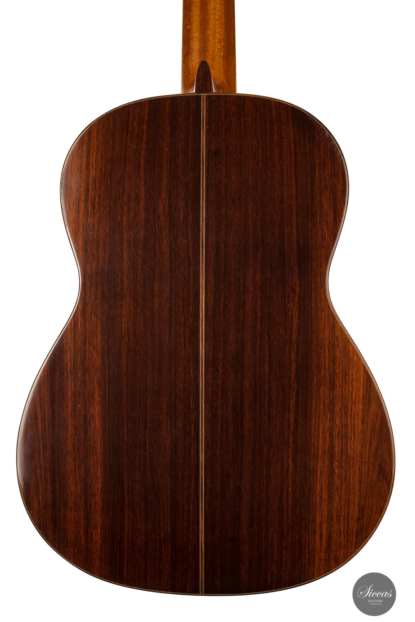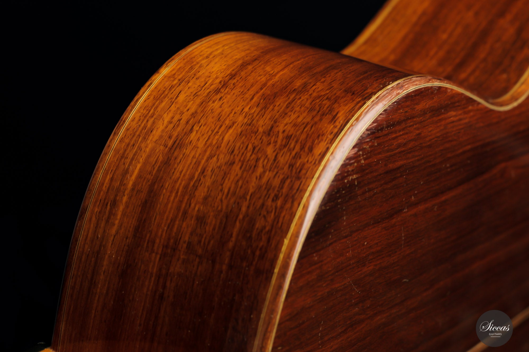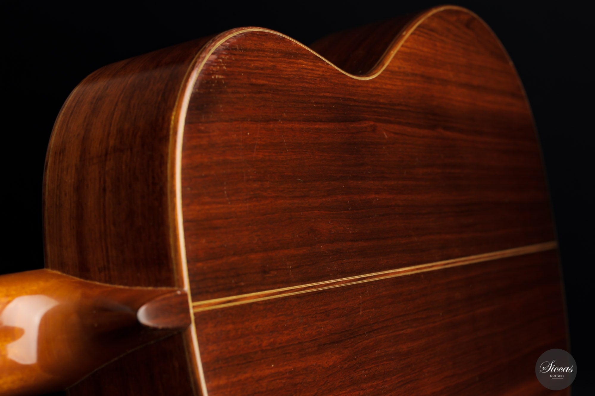 This very interesting guitar was built during the last phase of Edgar Mönch's life when he returned from Canada to settle in Freiburg. Built just a few years before his passing, it impressively reflects Monk's attention to detail and the continual evolution of his construction methods. This cedar top guitar has an incredibly thin, highly resonant back. The top has a traditional fan bracing, but it is highly customized and features an amazingly modern concept for the time. A look inside the guitar reveals the perfection of Edgar Mönch's work. The latter even lightly varnished the inside of the top, back and sides to prevent moisture changes in the wood. The overall condition of this guitar is impressive, there are no cracks, only playing marks, and a stunning craquelé of the nitro lacquer. This is also crackled along the top joint, though the joint is completely closed and structurally intact.
