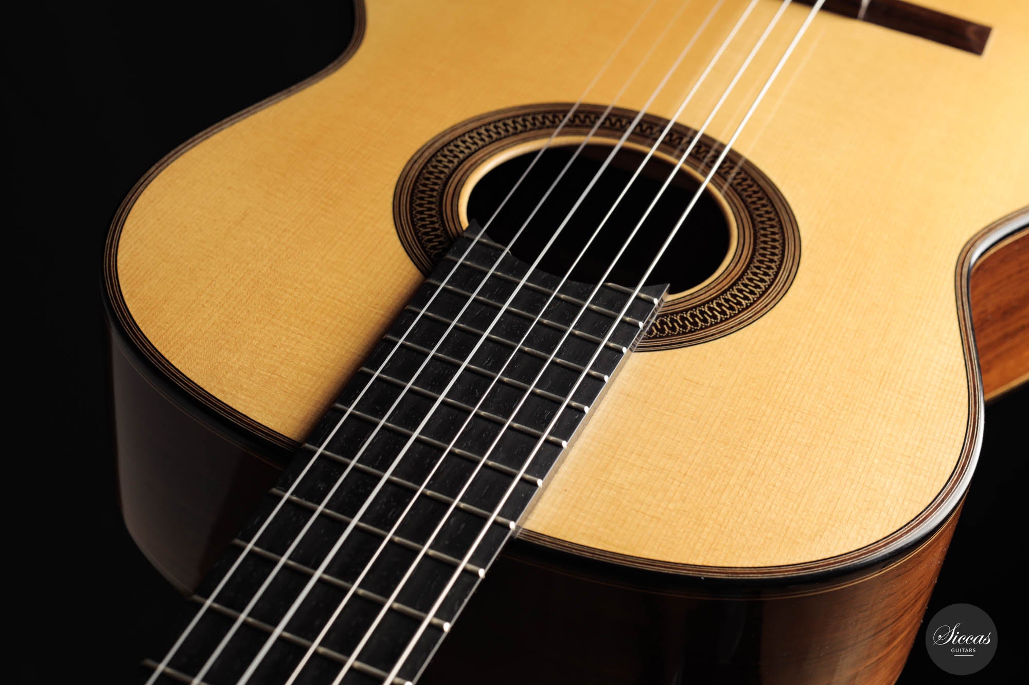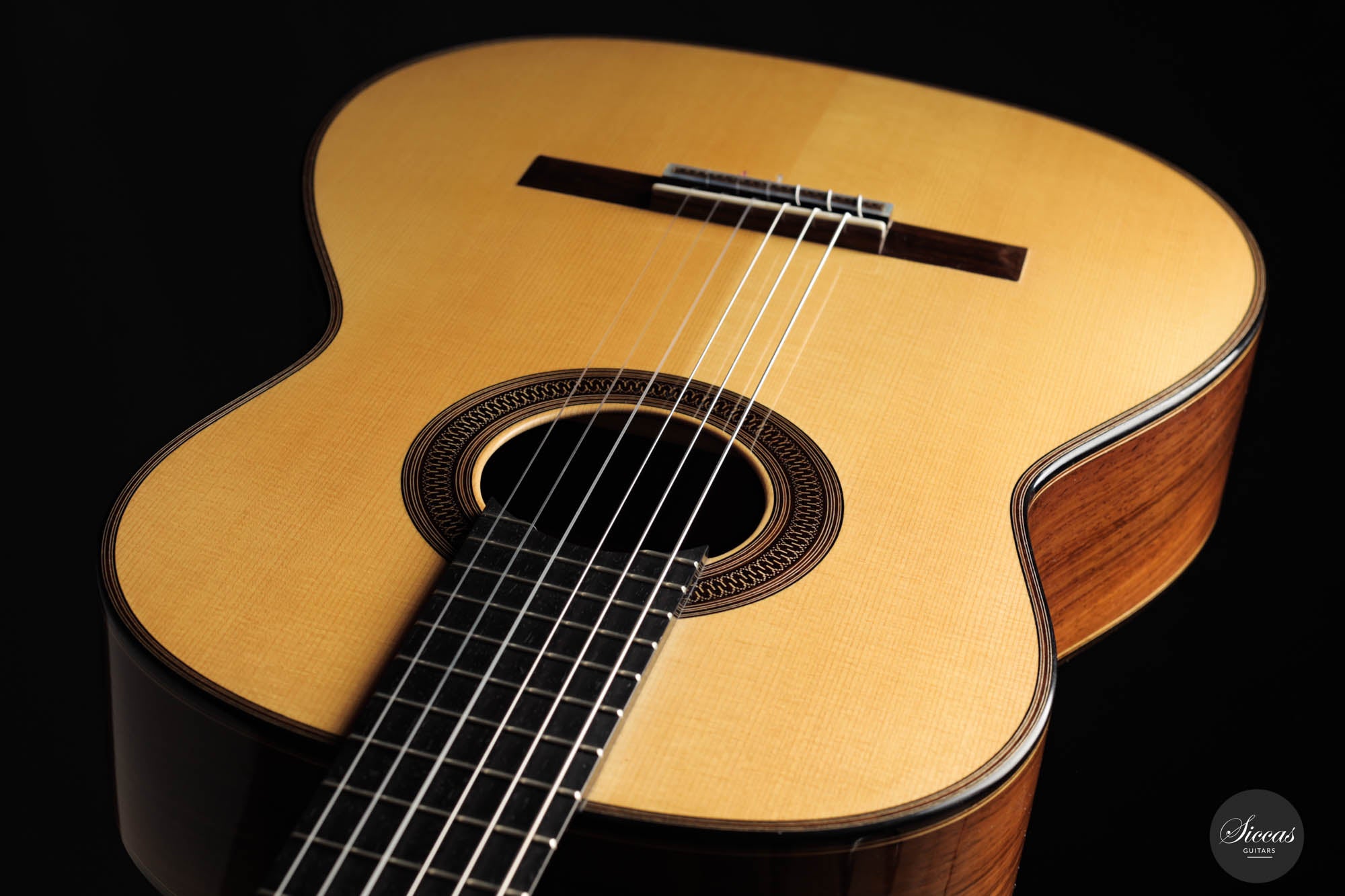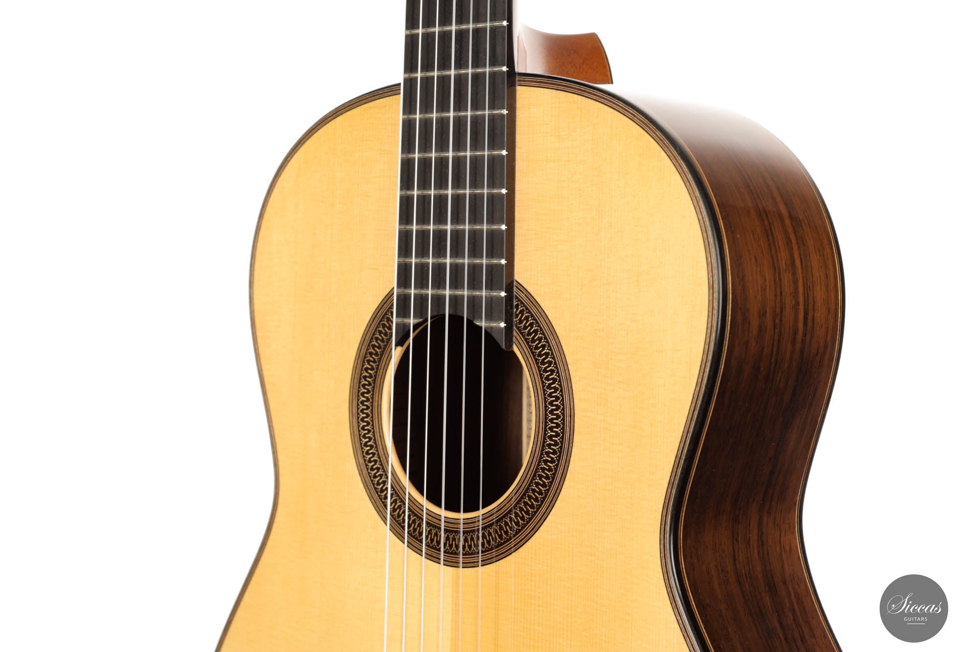 Mit Präzision und Leidenschaft gefertigt, besticht diese Konzertmodell Gitarre durch die perfekte Synergie aus ausgewählten Tonhölzern und sorgfältigen Bauweisen. Die Decke, sorgfältig ausgewählt für ihre Resonanz und Ansprechbarkeit, besteht aus gealterter Fichte und trägt zur reichen klanglichen Palette und dynamischen Bandbreite der Gitarre bei. Die Rückseite und die Seiten, aus edlem Palisander gefertigt, verstärken nicht nur den ästhetischen Reiz des Instruments, sondern tragen auch zur ausgewogenen klanglichen Projektion bei.