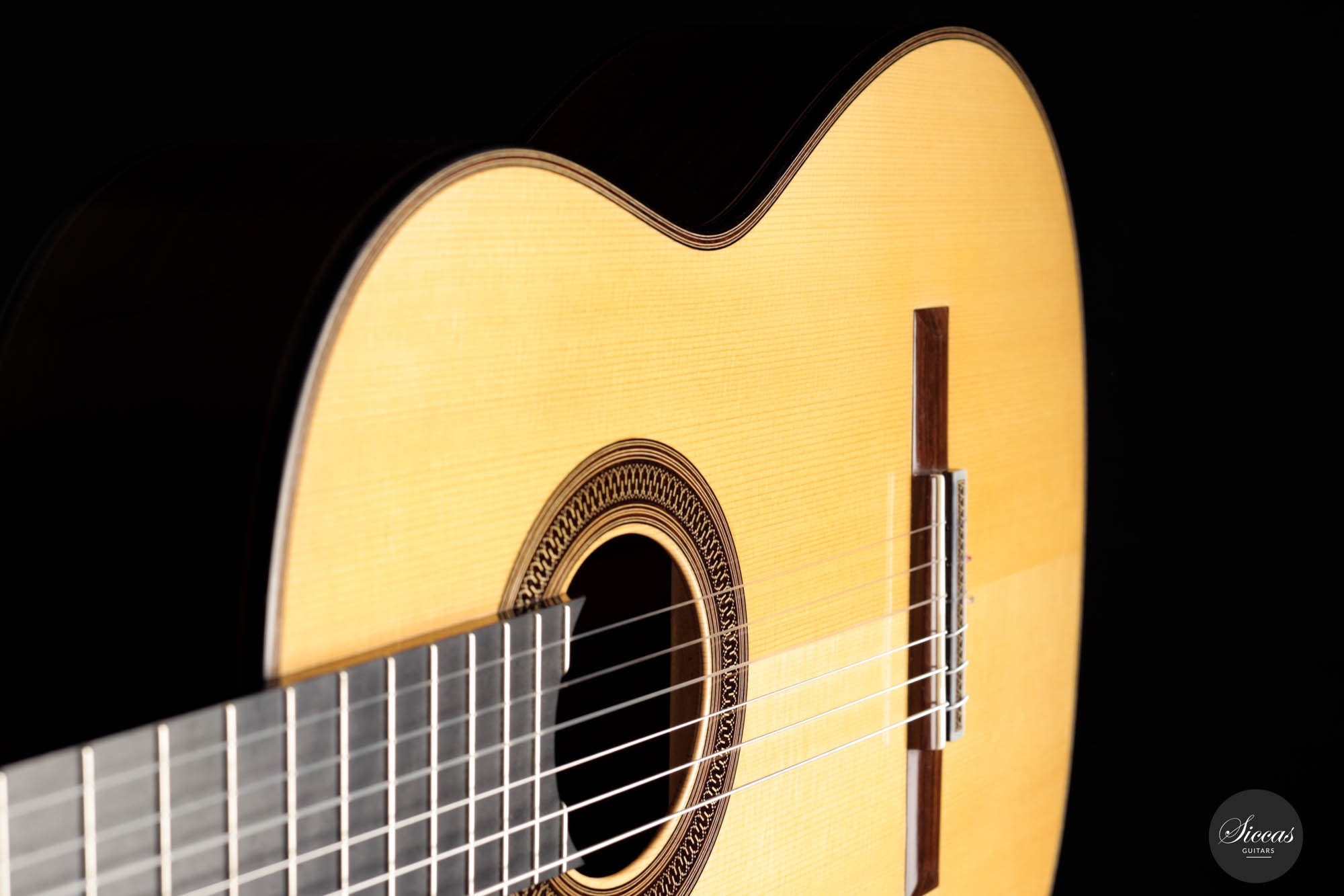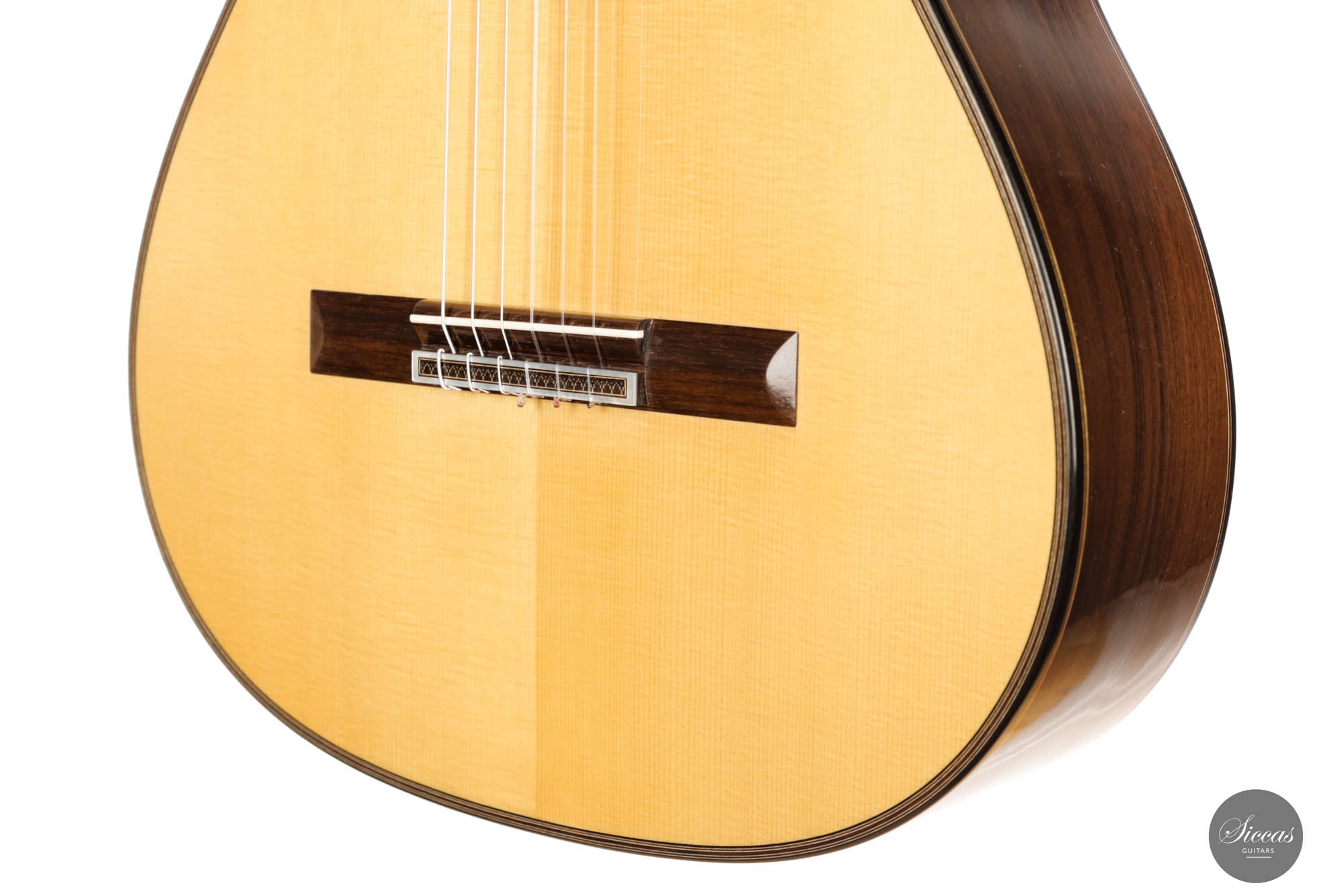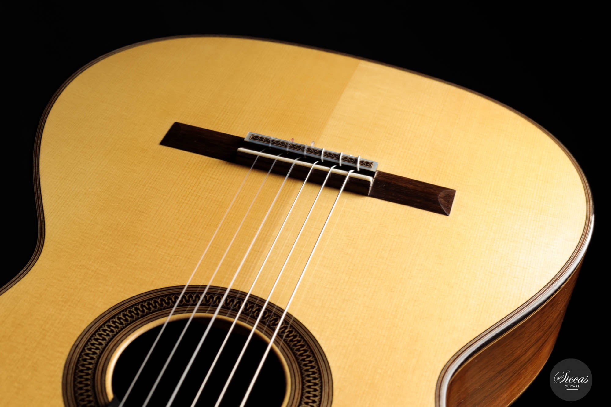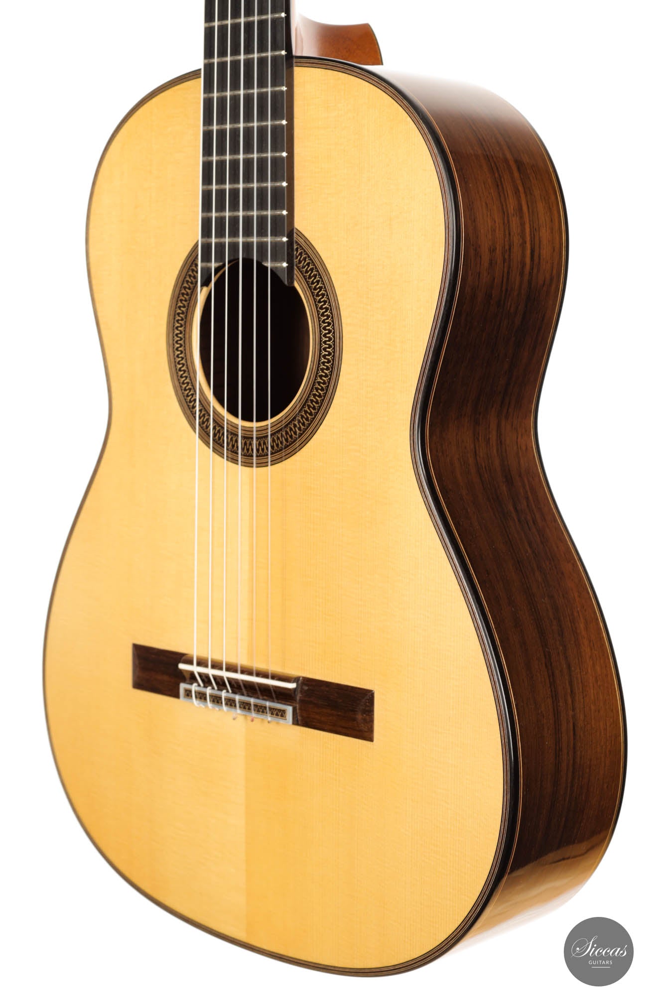 Mit Präzision und Leidenschaft gefertigt, besticht diese Konzertmodell Gitarre durch die perfekte Synergie aus ausgewählten Tonhölzern und sorgfältigen Bauweisen. Die Decke, sorgfältig ausgewählt für ihre Resonanz und Ansprechbarkeit, besteht aus gealterter Fichte und trägt zur reichen klanglichen Palette und dynamischen Bandbreite der Gitarre bei. Die Rückseite und die Seiten, aus edlem Palisander gefertigt, verstärken nicht nur den ästhetischen Reiz des Instruments, sondern tragen auch zur ausgewogenen klanglichen Projektion bei.