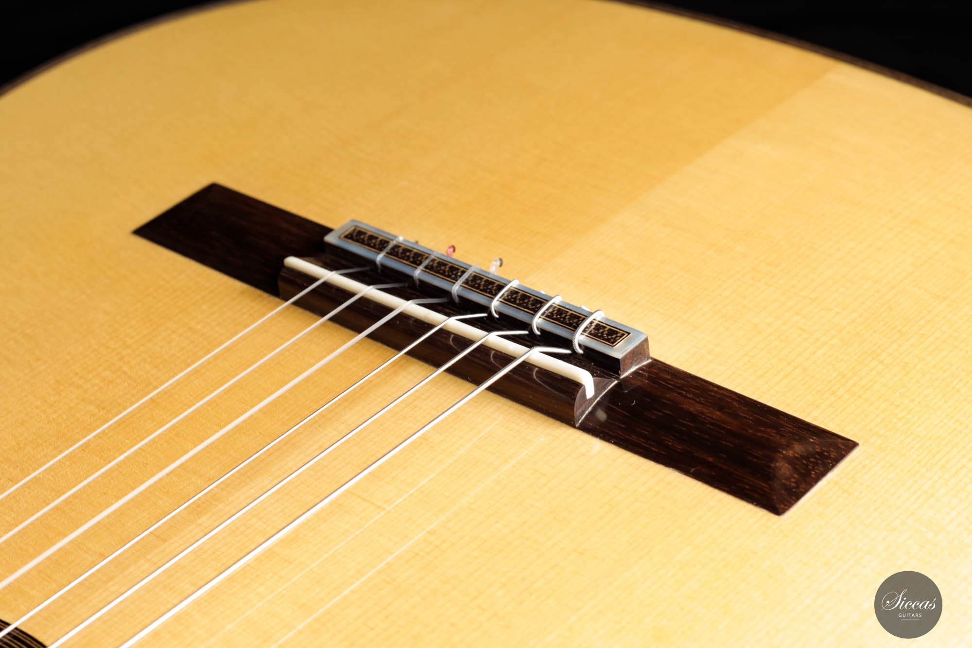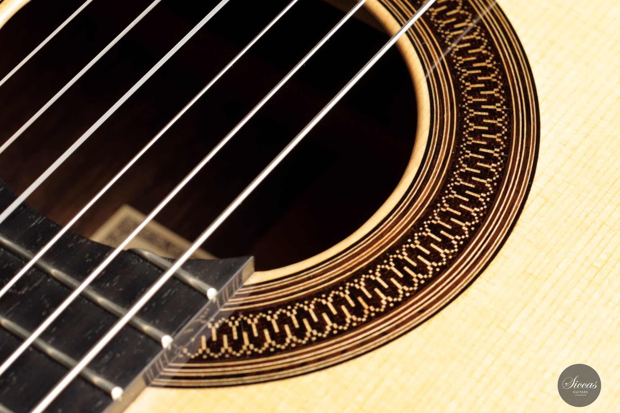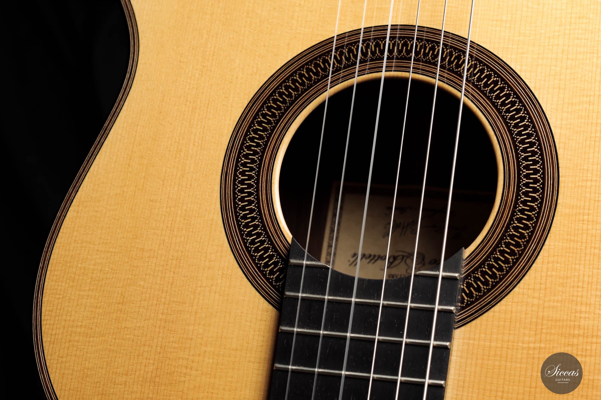 Die Enrico Bottelli Konzertmodell Gitarre aus dem Jahr 2011 verkörpert klangliche Exzellenz und visuellen Glanz. Ihre exquisite Rosette, geschmackvolle Verzierungen und präzise Einlegearbeiten sind eine Hommage an die Kunst des Gitarrenbaus. Das Griffbrett mit seiner geschmeidigen Haptik und die tadellose Bundarbeit gewährleisten eine mühelose Bespielbarkeit und ermöglichen es Musikern, ihre musikalische Reise mühelos zu erkunden.