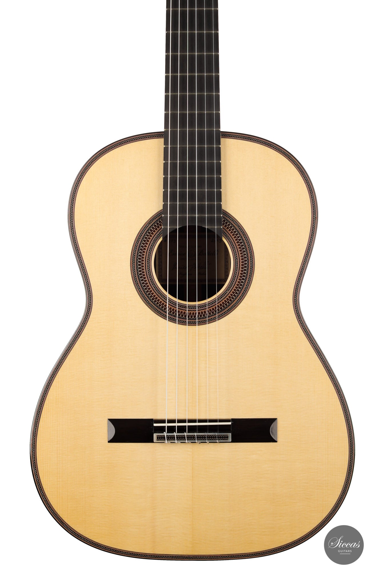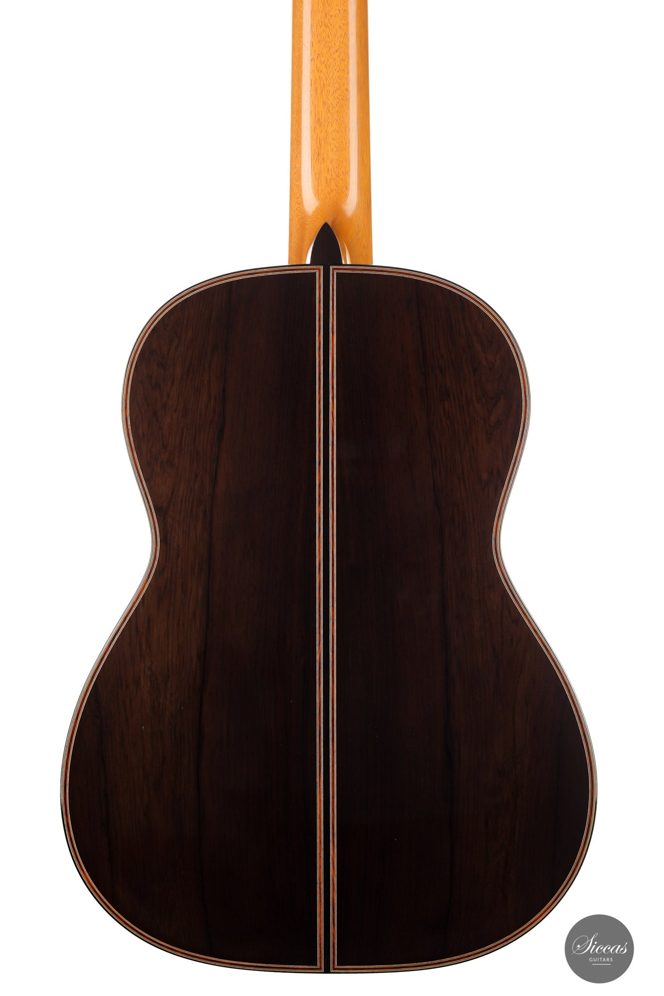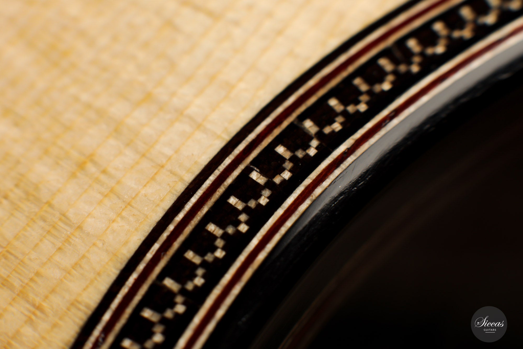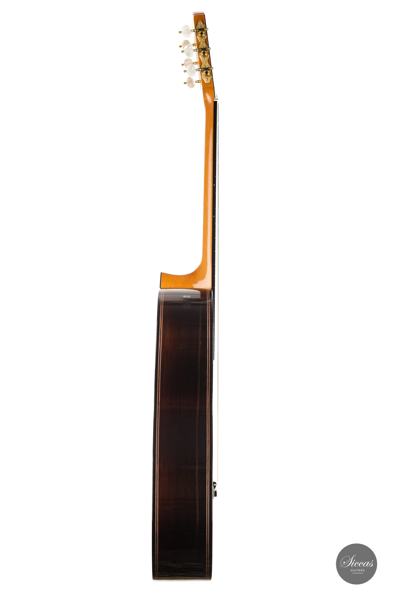 This beautiful 2019 Special model is one of Enrico Bottelli's most elaborate models. The inlay work is fine and elegant, and the choice of woods is simply gorgeous. The back and sides are made of extremely rare, old Brazilian rosewood (CITES certified), which presents splendid colors. The soundboard is made of premium Italian spruce, which is both lightweight and responsive. A particularly eye-catching detail is the flamed mahogany neck, which adds a beautiful touch to the entire instrument. The Rodgers tuners are also of the highest quality and perfectly complement this unique guitar.