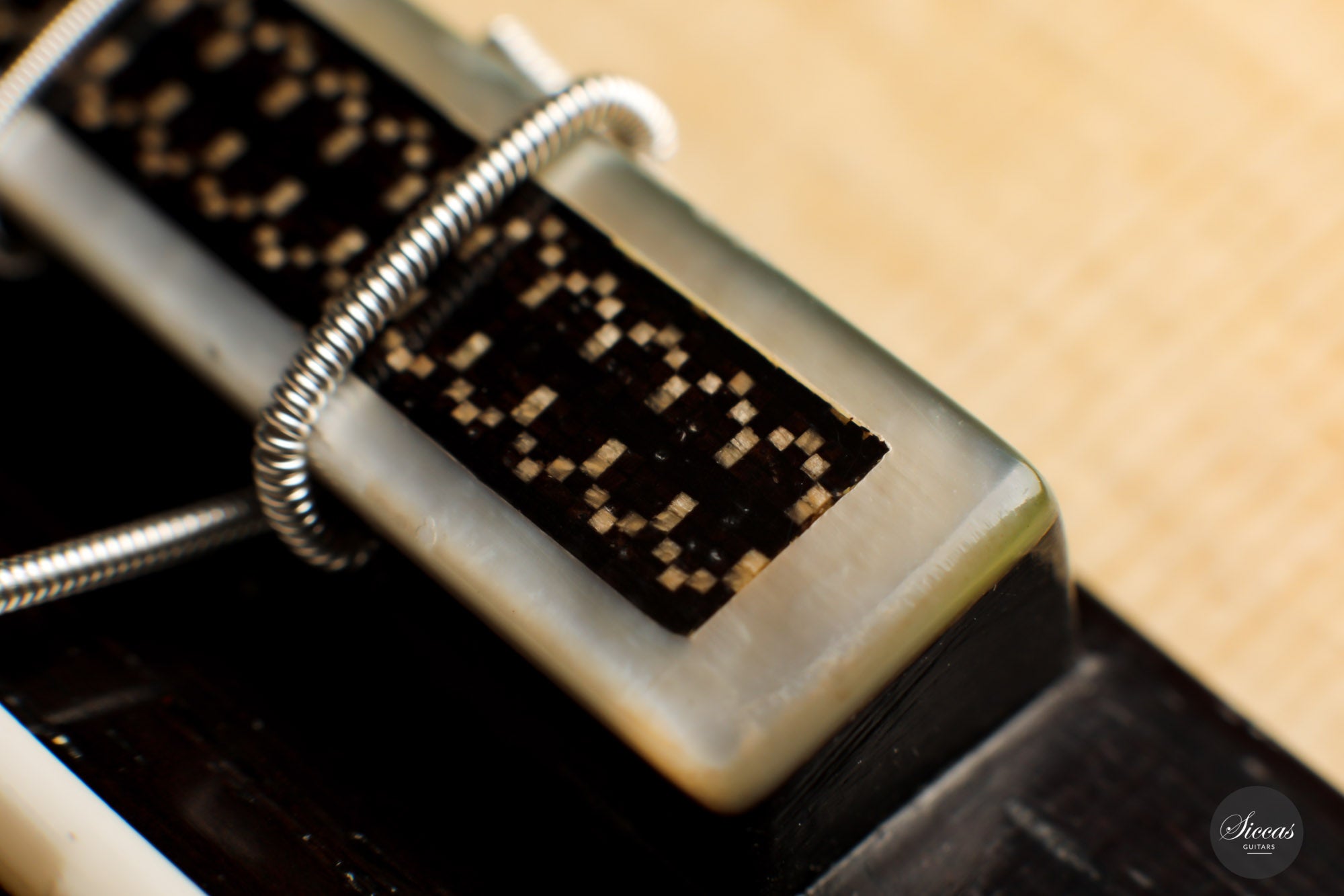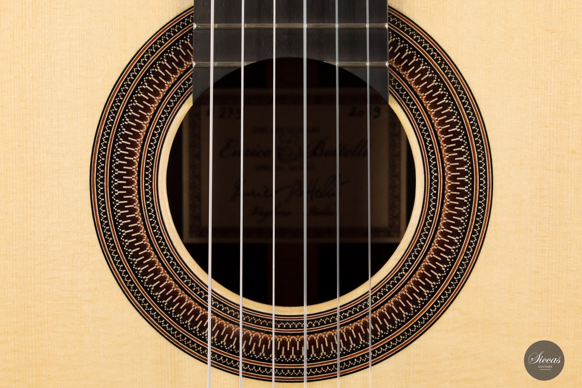What an elegant, noble and classy guitar. Everything from the marquetry to the shellac polish and especially the sound is absolutely perfect and refined. Bell-like treble strings and cello-like basses combine to create a balanced and controlled guitar with endless possibilities of timbre and dynamics. This wonderful and rare Bottelli guitar is a true gem in terms of aesthetics and acoustics.