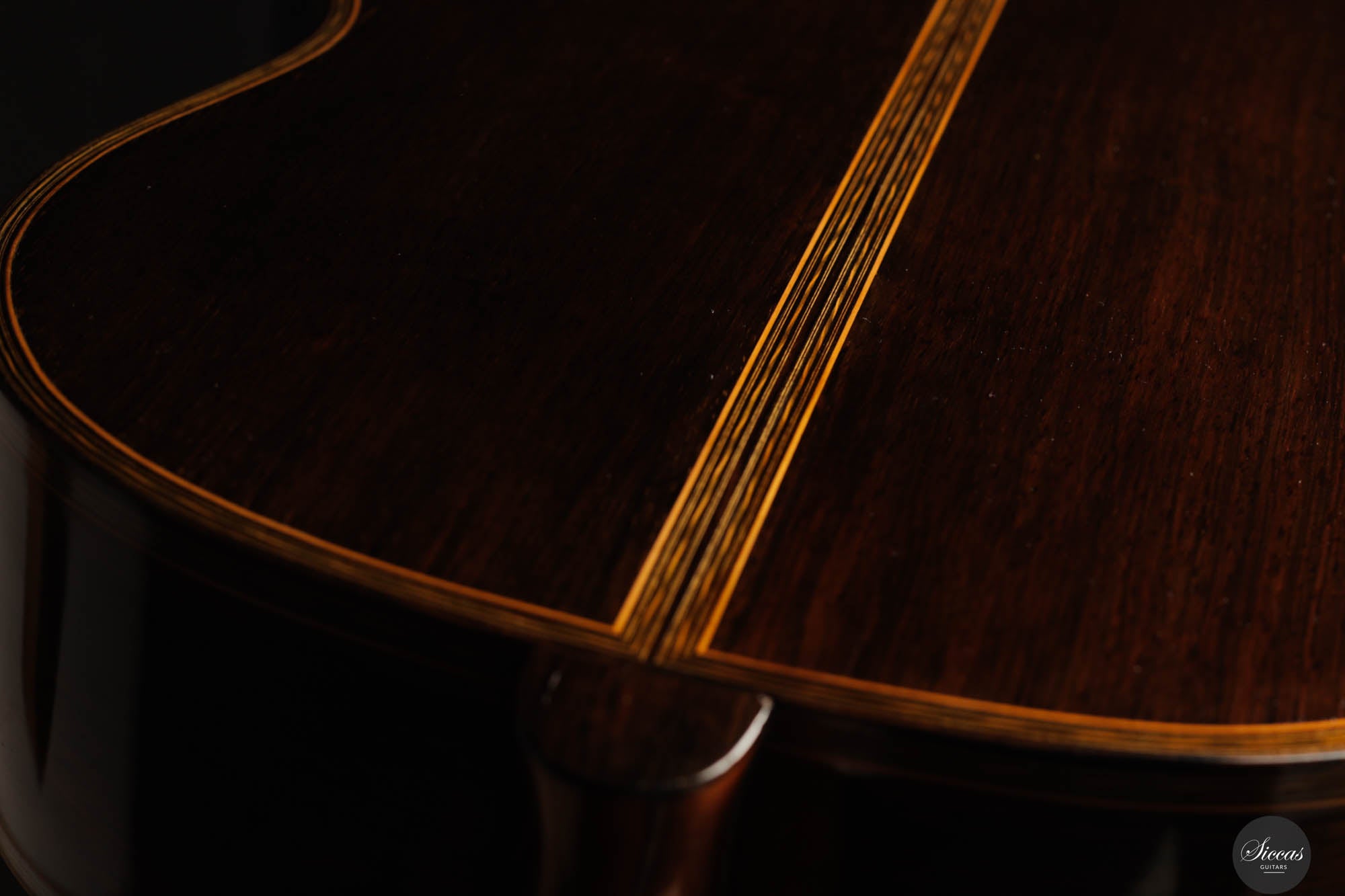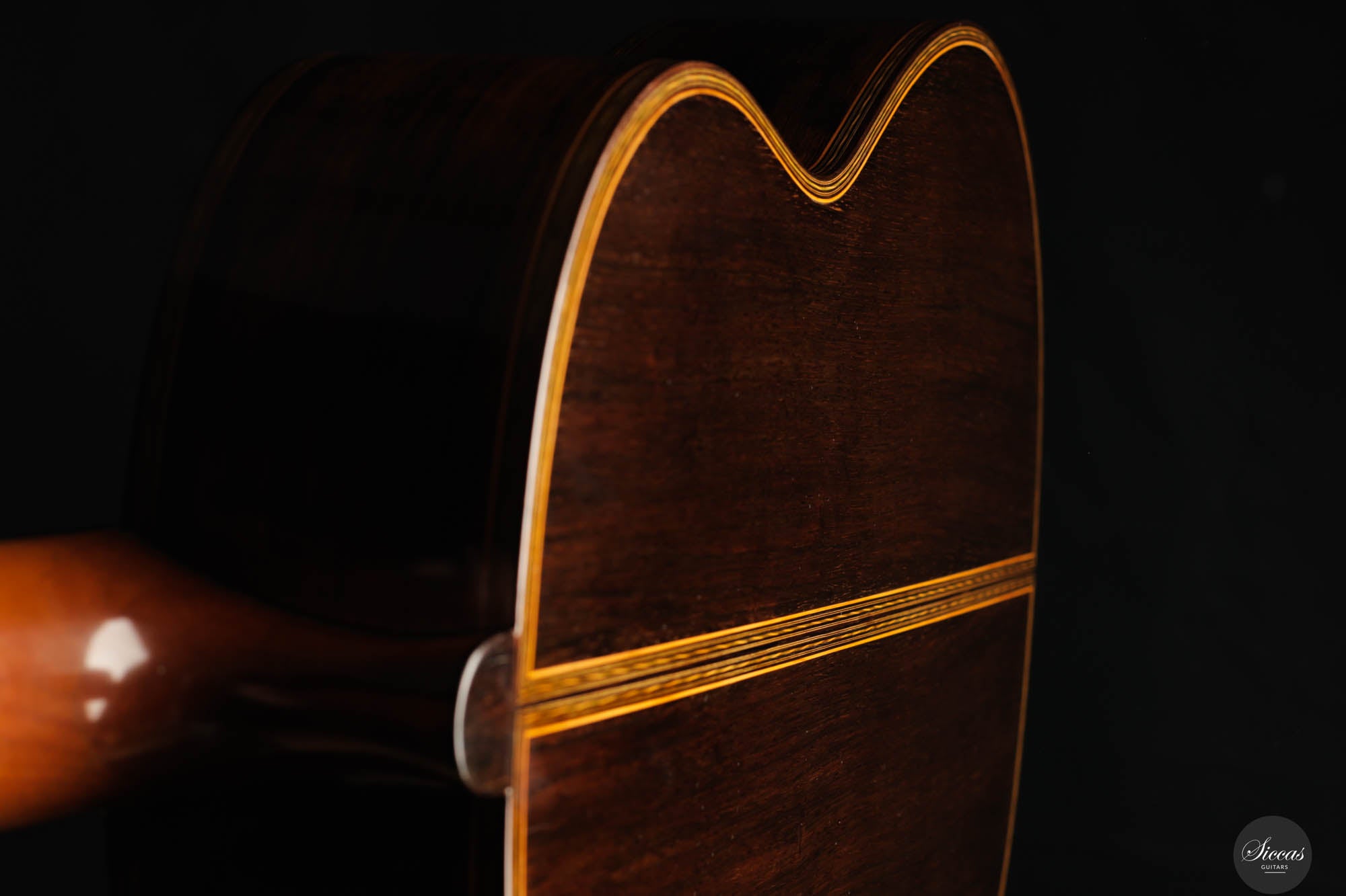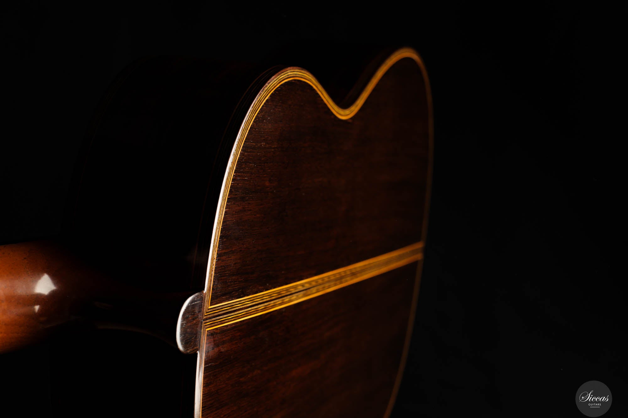 The condition of this instrument is admirably good, despite its age and having crossed the Atlantic back and forth, is in perfect playing conditions. The guitar has been re-polished at some point and the spruce top shows three cracks in the region of the bridge, one on the left-lower bout, and one on the right-upper bout. All of them have been professionally repaired and are considered stable. The Brazilian rosewood on the back and sides is free of cracks or noteworthy blemishes.
