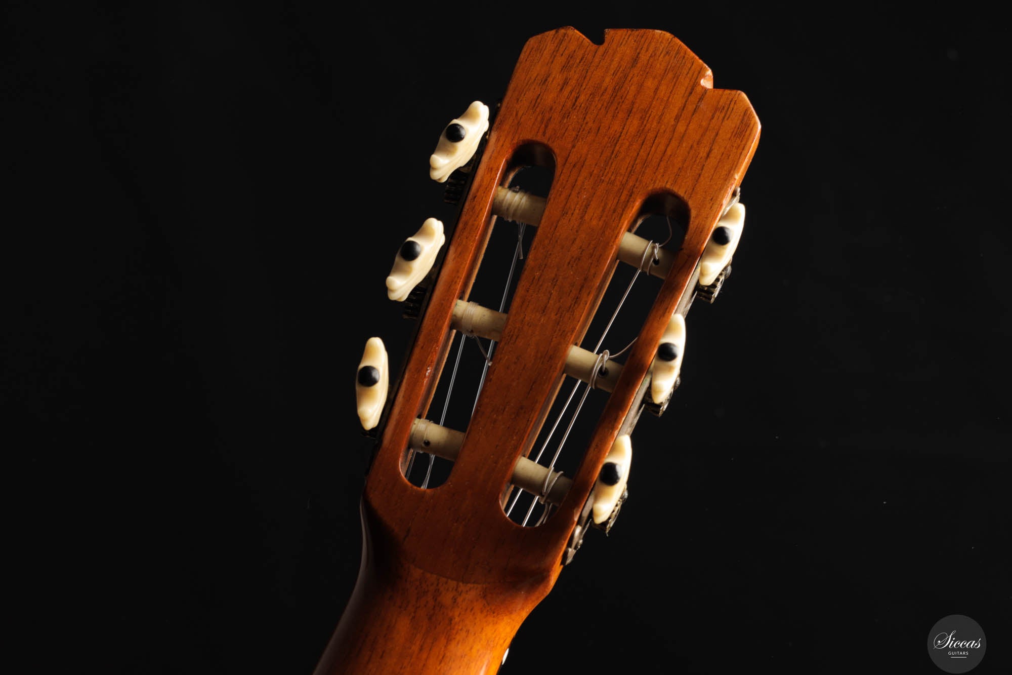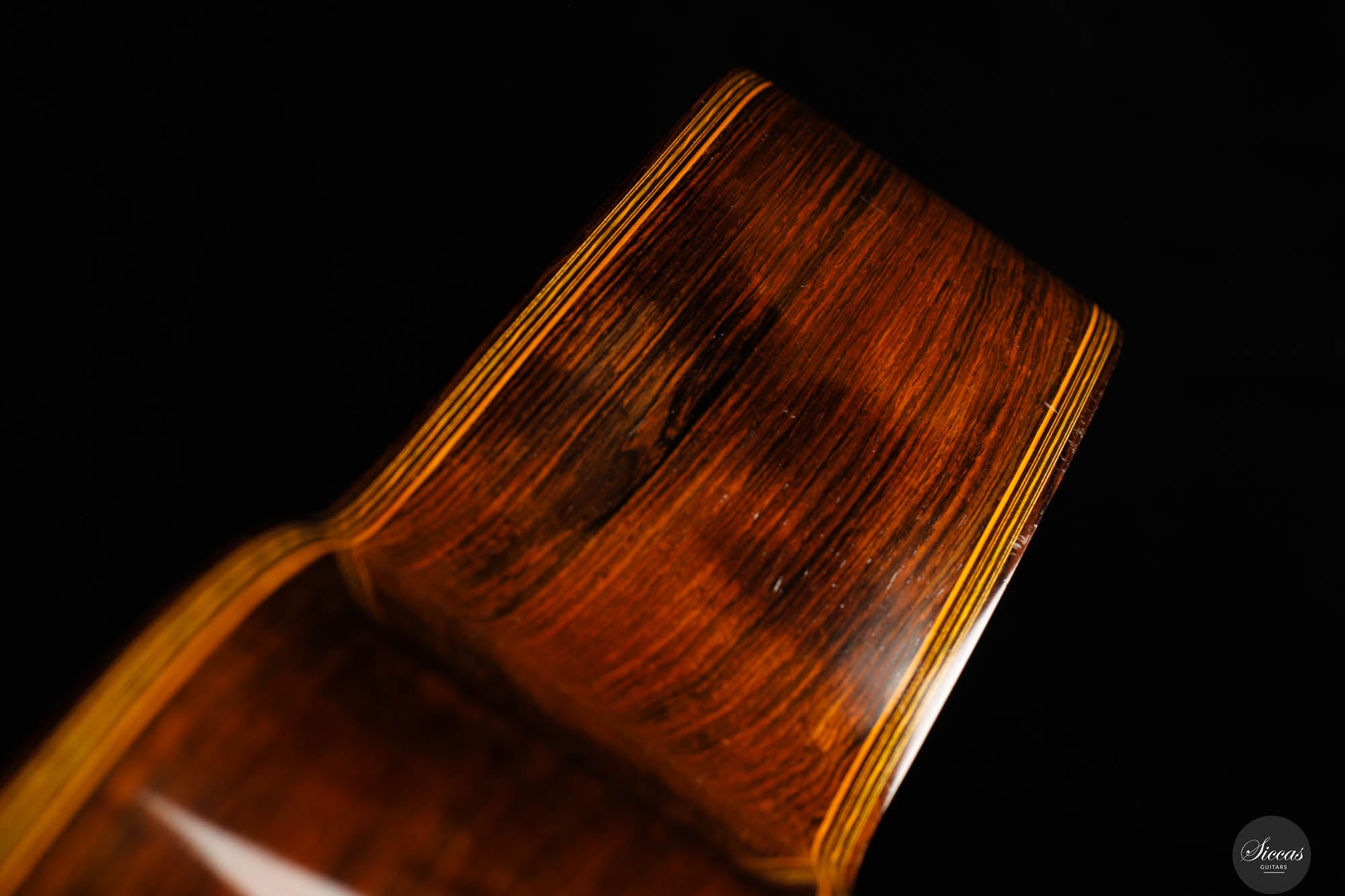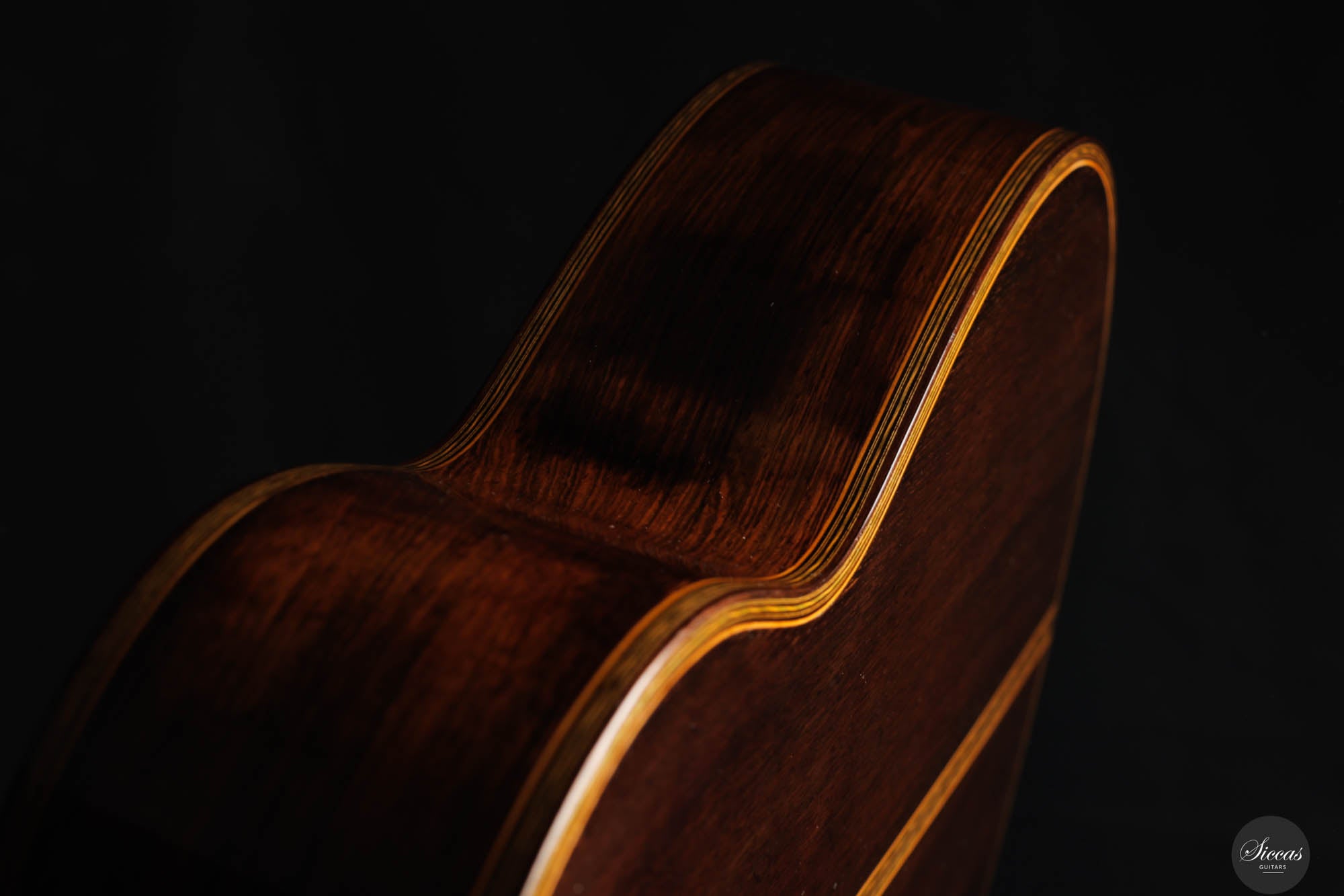 The condition of this instrument is admirably good, despite its age and having crossed the Atlantic back and forth, is in perfect playing conditions. The guitar has been re-polished at some point and the spruce top shows three cracks in the region of the bridge, one on the left-lower bout, and one on the right-upper bout. All of them have been professionally repaired and are considered stable. The Brazilian rosewood on the back and sides is free of cracks or noteworthy blemishes.