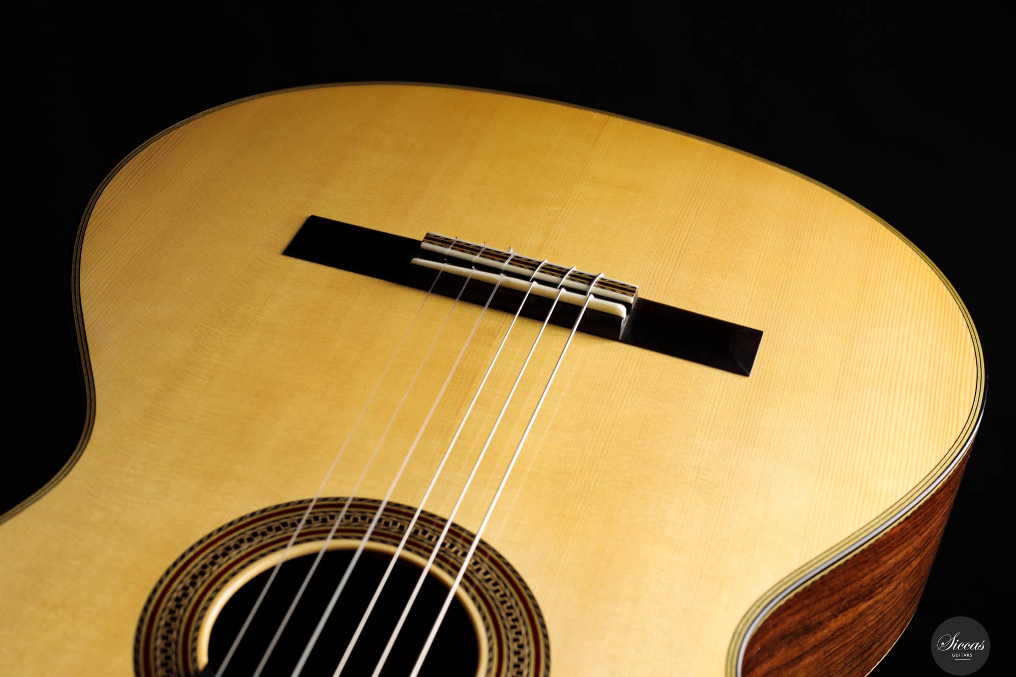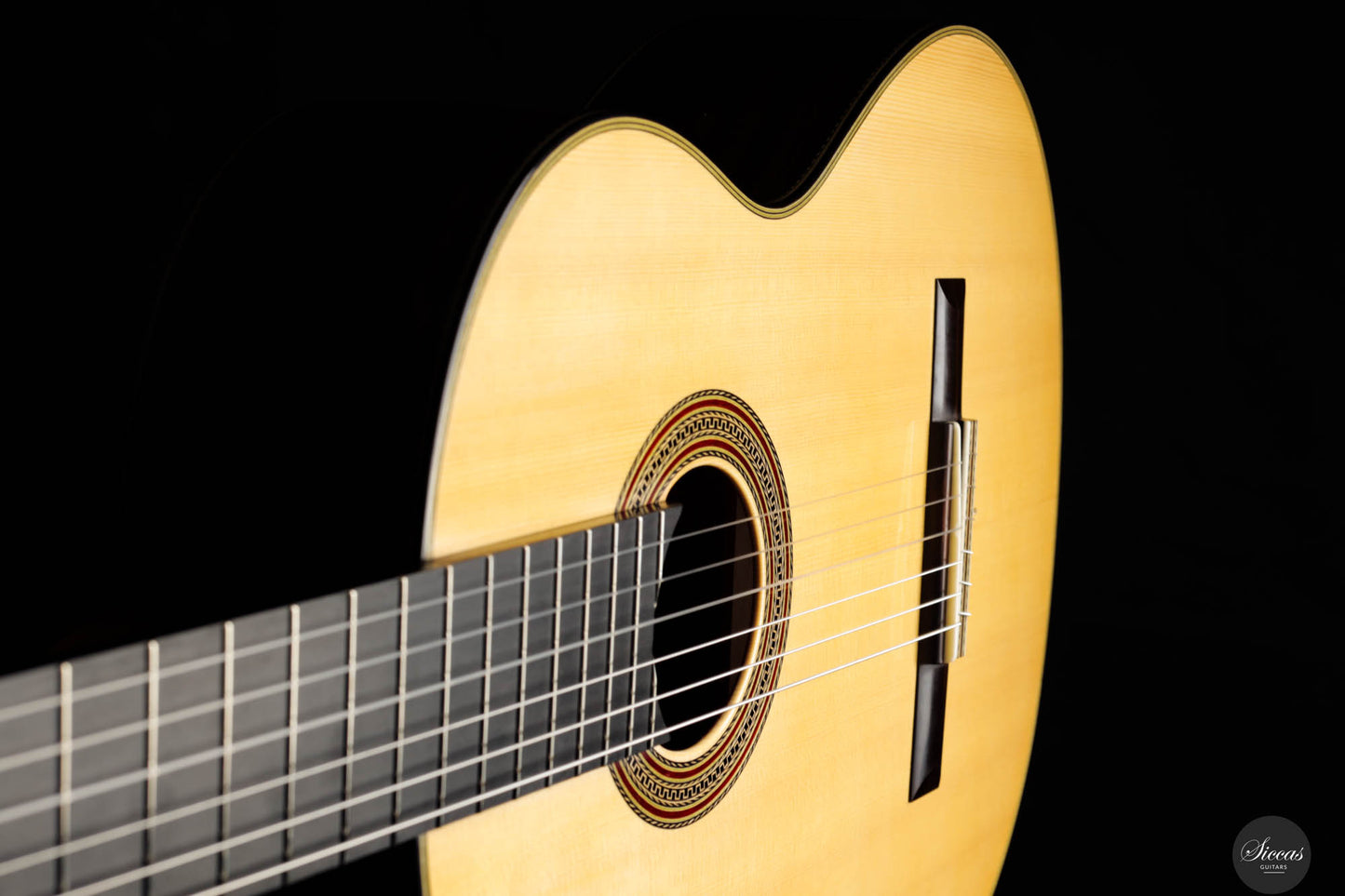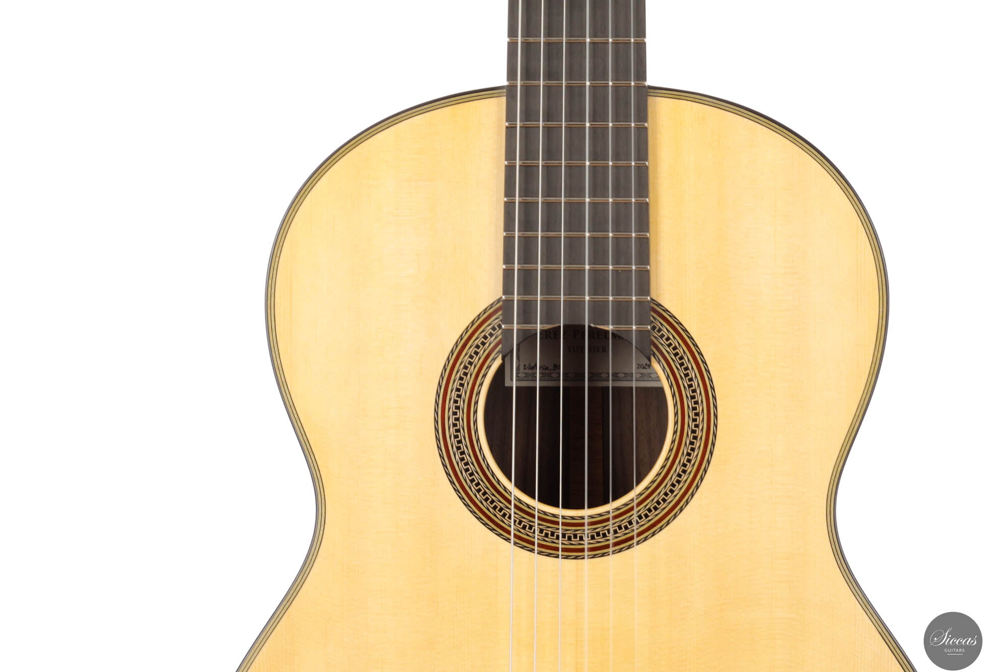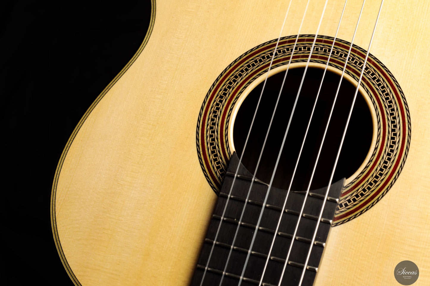 Diese brandneue Konzertgitarre von Erez Perelman vereint traditionelle Handwerkskunst mit modernem Feingefühl und ist auf die Bedürfnisse zeitgenössischer Gitarristen zugeschnitten. Erez' akribische Liebe zum Detail zeigt sich in den kunstvollen dekorativen Elementen, die das Instrument zieren und sein außergewöhnliches Talent im Holzhandwerk demonstrieren. Tief gestimmt erzeugt die Gitarre einen warmen, runden Ton, mit einer Bass-E-Saite, die mit dichtem, komplexem Sustain resoniert, während die Diskant-E-Saite eine elegante und markante Stimme bietet. Das Spielen dieser Gitarre ist ein fesselndes Erlebnis, da sie reichlich gegen die linke Hand und die Brust vibriert und Perelmans Hingabe zu ästhetischer und akustischer Exzellenz widerspiegelt.