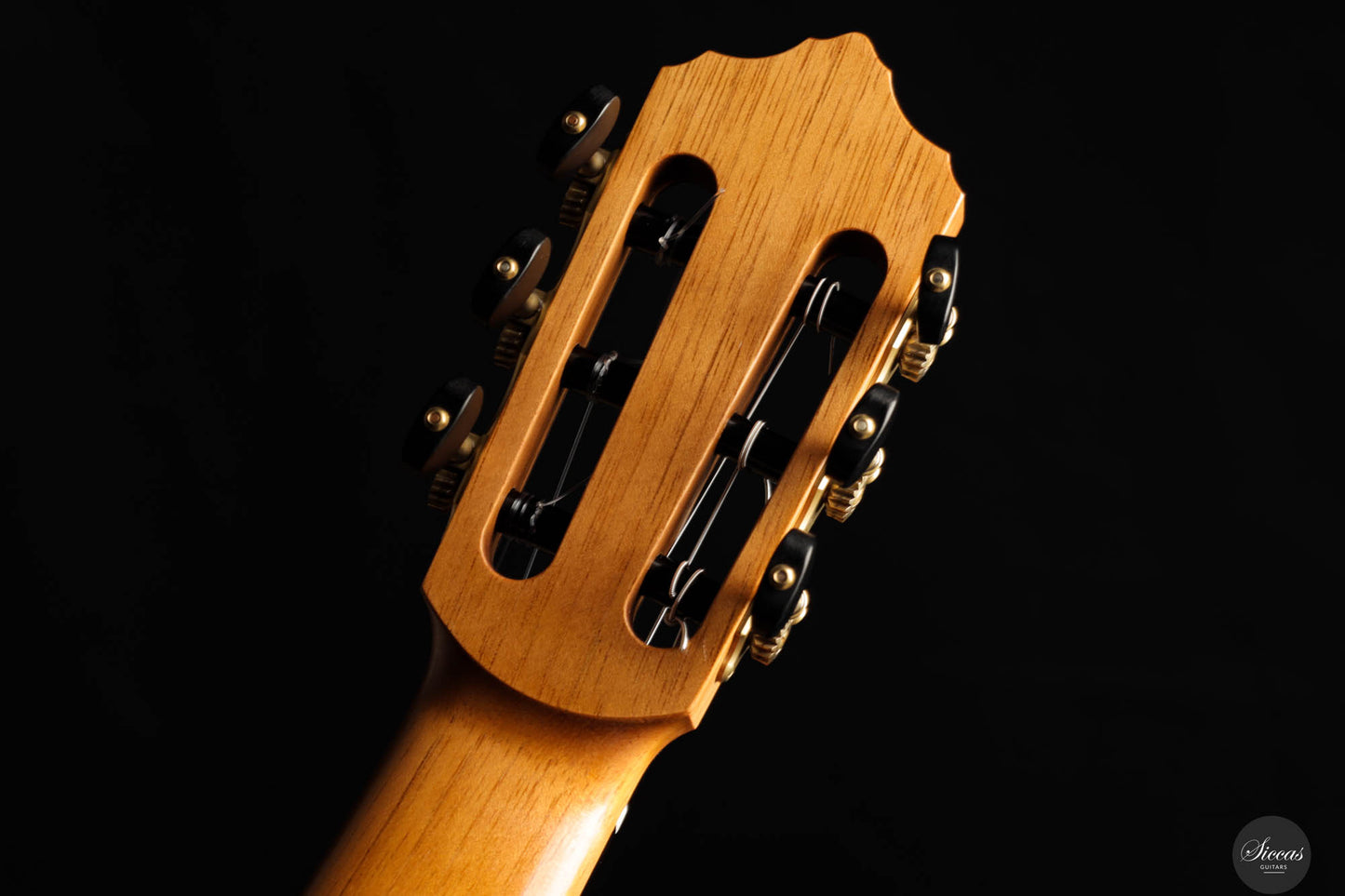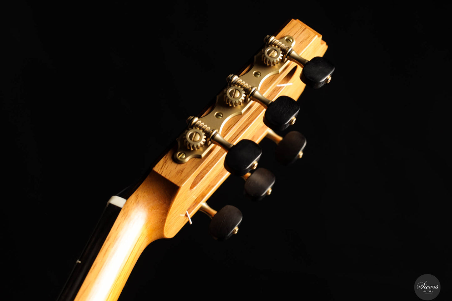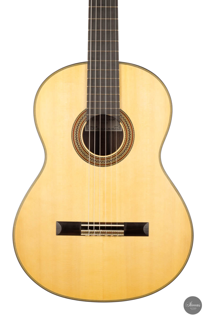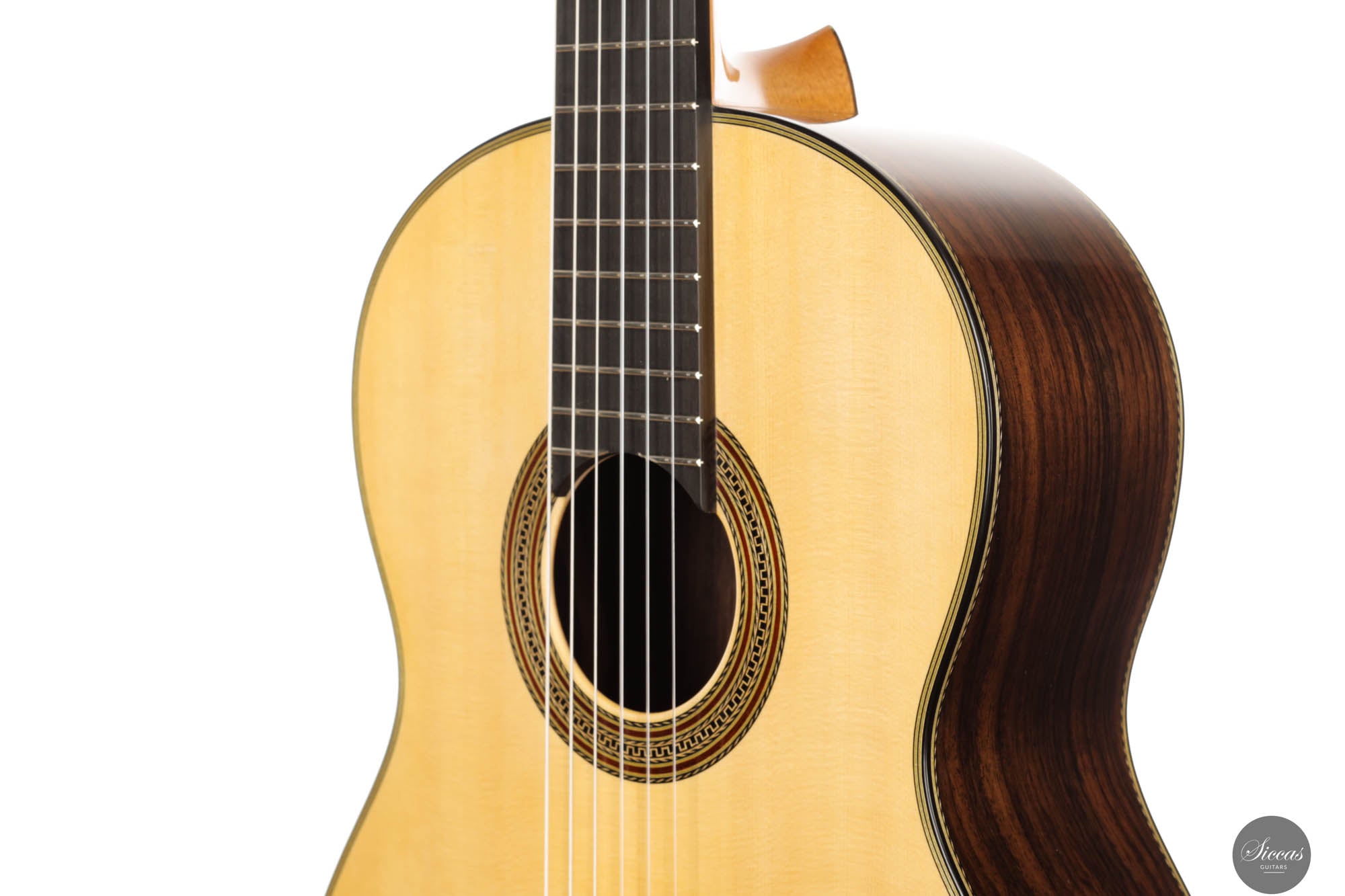 Diese brandneue Konzertgitarre von Erez Perelman vereint traditionelle Handwerkskunst mit modernem Feingefühl und ist auf die Bedürfnisse zeitgenössischer Gitarristen zugeschnitten. Erez' akribische Liebe zum Detail zeigt sich in den kunstvollen dekorativen Elementen, die das Instrument zieren und sein außergewöhnliches Talent im Holzhandwerk demonstrieren. Tief gestimmt erzeugt die Gitarre einen warmen, runden Ton, mit einer Bass-E-Saite, die mit dichtem, komplexem Sustain resoniert, während die Diskant-E-Saite eine elegante und markante Stimme bietet. Das Spielen dieser Gitarre ist ein fesselndes Erlebnis, da sie reichlich gegen die linke Hand und die Brust vibriert und Perelmans Hingabe zu ästhetischer und akustischer Exzellenz widerspiegelt.