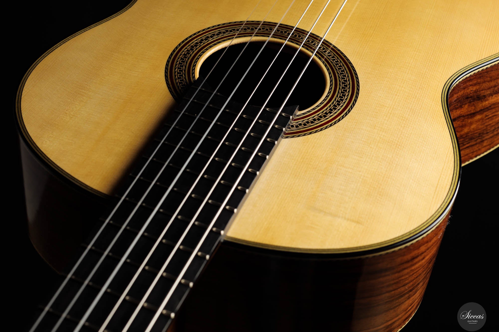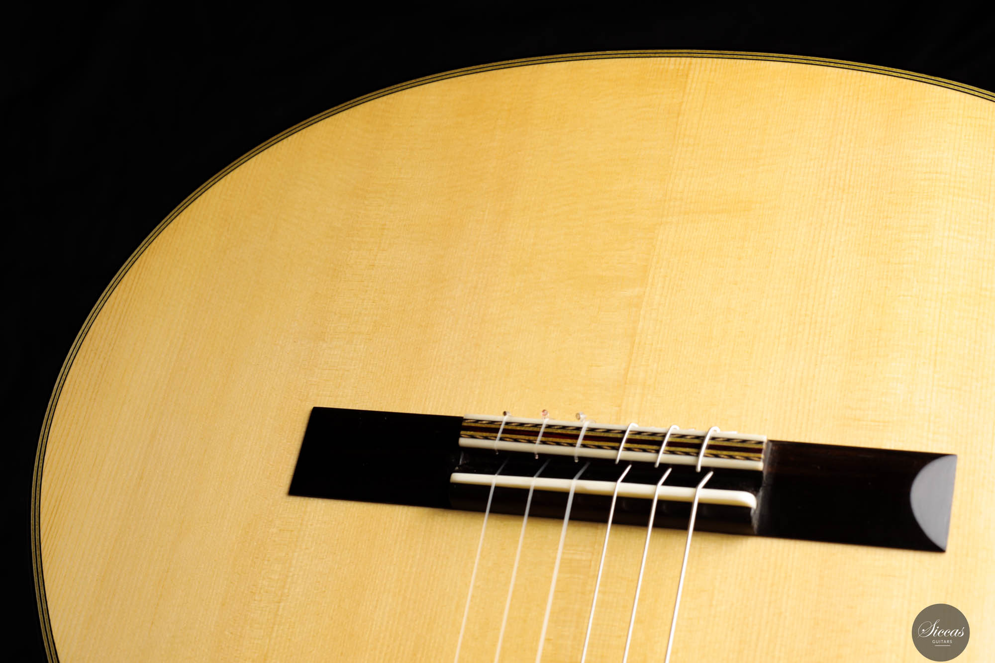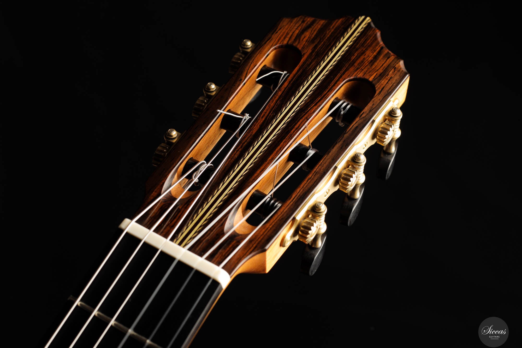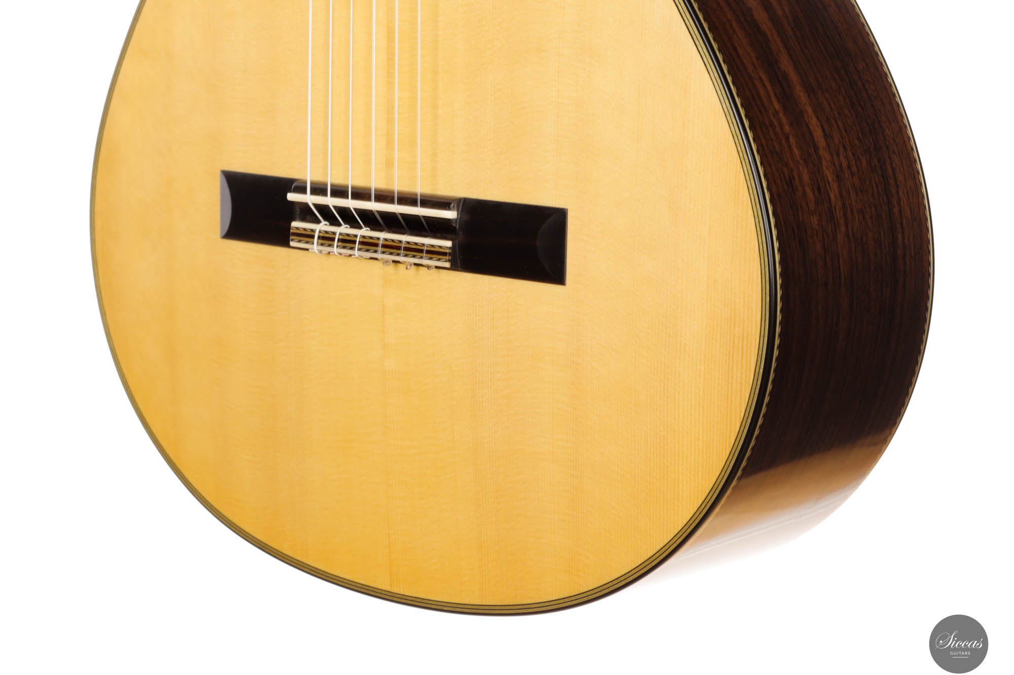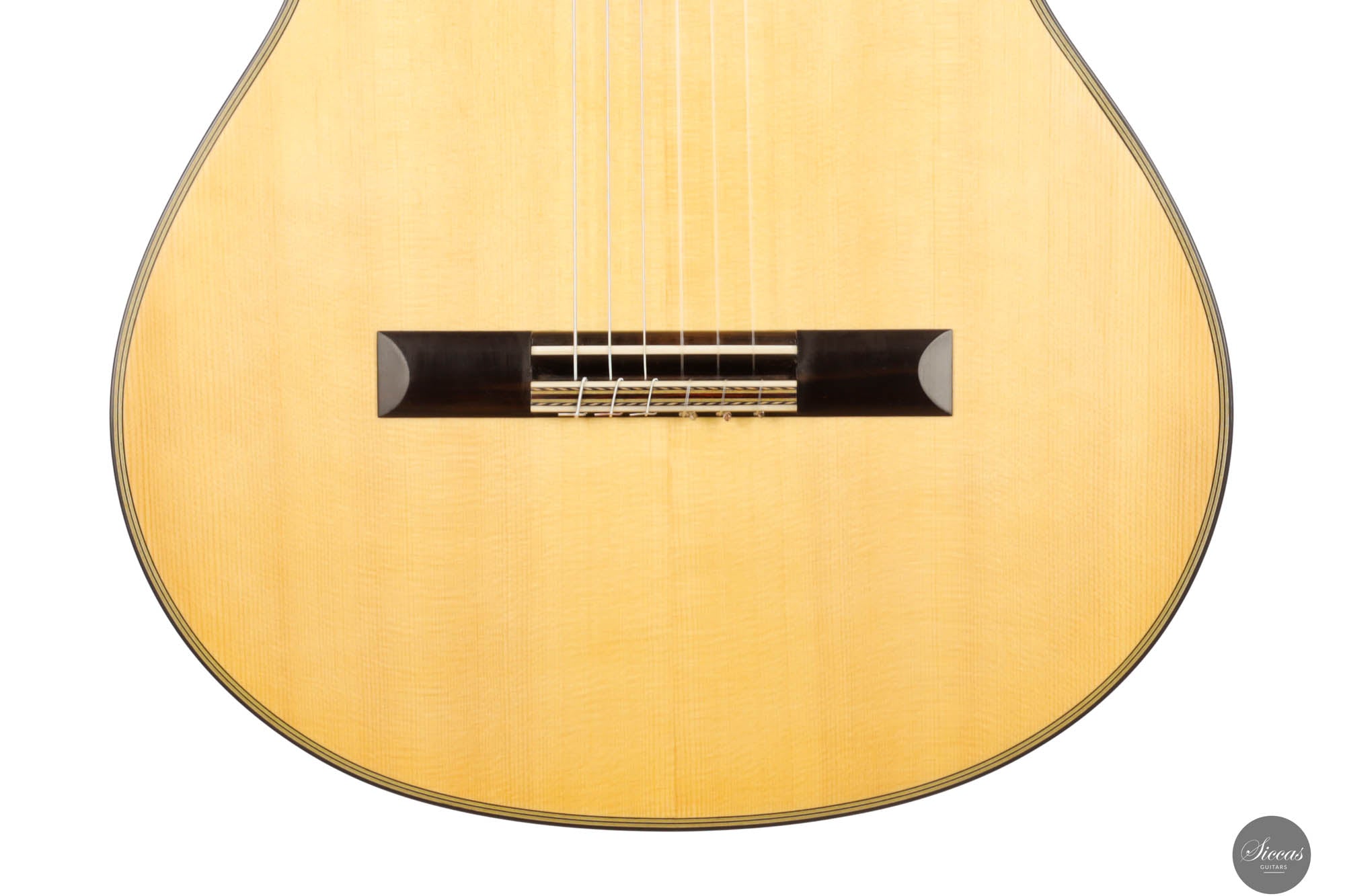 Diese brandneue Konzertgitarre von Erez Perelman vereint traditionelle Handwerkskunst mit modernem Feingefühl und ist auf die Bedürfnisse zeitgenössischer Gitarristen zugeschnitten. Erez' akribische Liebe zum Detail zeigt sich in den kunstvollen dekorativen Elementen, die das Instrument zieren und sein außergewöhnliches Talent im Holzhandwerk demonstrieren. Tief gestimmt erzeugt die Gitarre einen warmen, runden Ton, mit einer Bass-E-Saite, die mit dichtem, komplexem Sustain resoniert, während die Diskant-E-Saite eine elegante und markante Stimme bietet. Das Spielen dieser Gitarre ist ein fesselndes Erlebnis, da sie reichlich gegen die linke Hand und die Brust vibriert und Perelmans Hingabe zu ästhetischer und akustischer Exzellenz widerspiegelt.