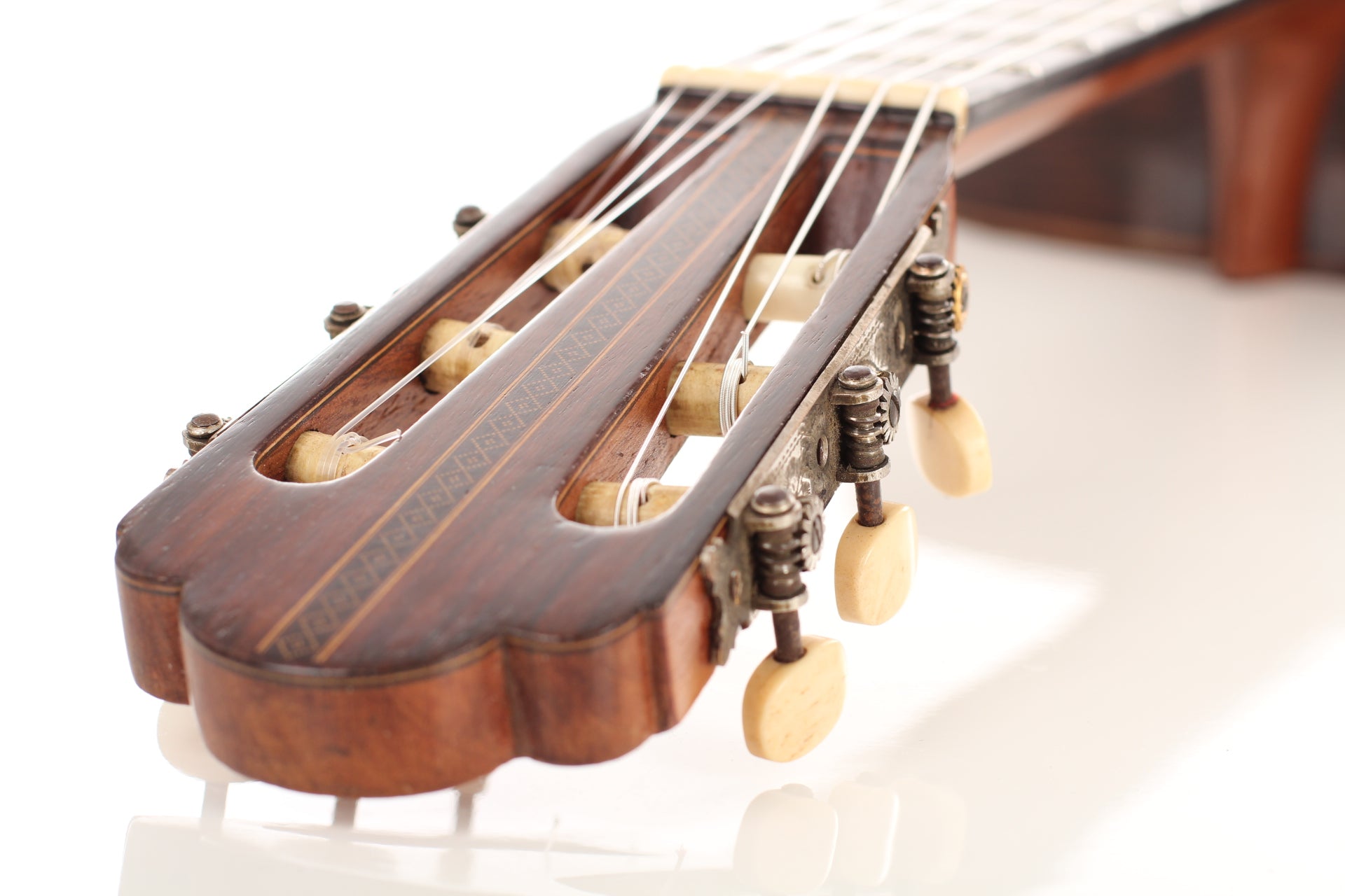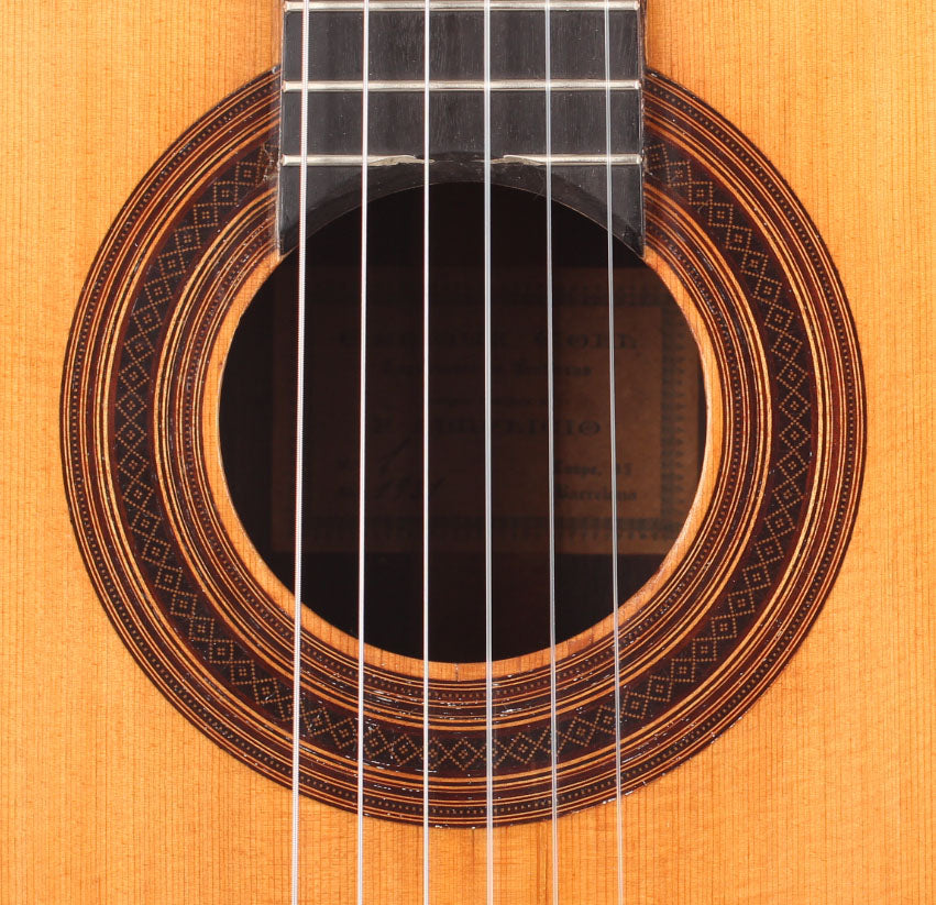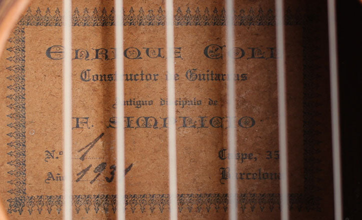 Enrique Coll (1894-1978) was luthier from Barcelona and was trained by Francisco Simplicio and had his own workshop in Calle Caspe 35. This guitar was made in 1931, one year before Francisco Simplicio died. It’s a very fine, refined instrument with a beautiful spruce top and a beautiful dark rosette. The workmanship, the details and the beautiful design are all of extremely high level. Enrique Coll sold many of his instruments to Argentina, where also this guitar comes from. Back and sides are made of rosewood. The tuning machines, the same Francisco Simplicio used for his guitars, are original. The trebles are very brilliant and have a lot of sustain. The quality of volume and tone is very rounded and flexible. Condition is very good, there is one very well repaired crack on the top.