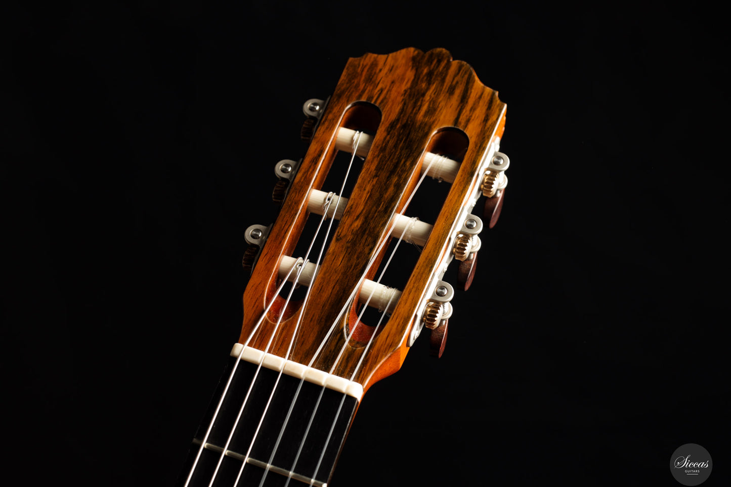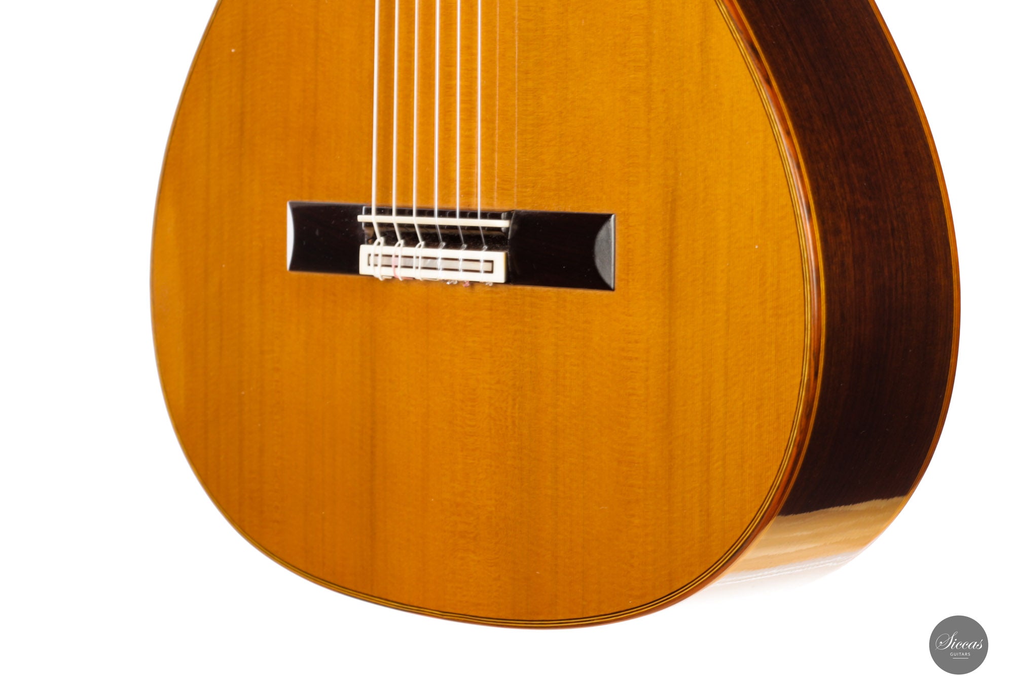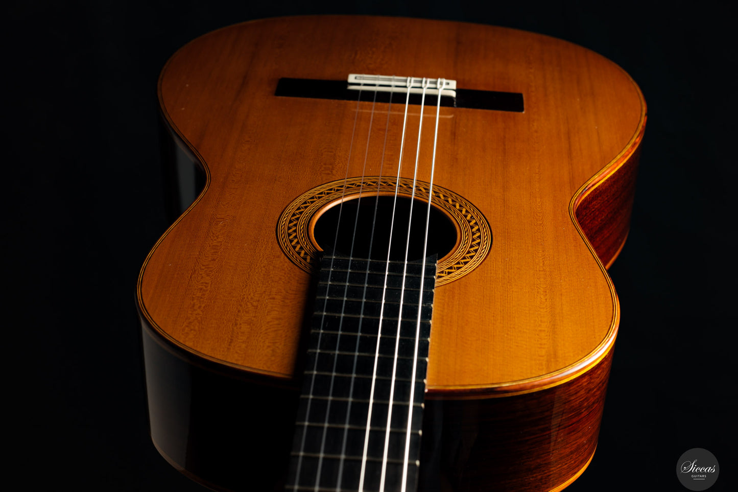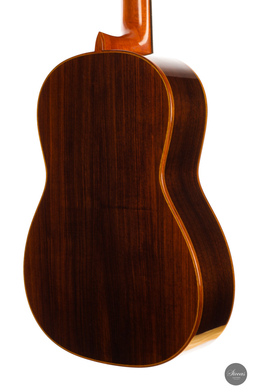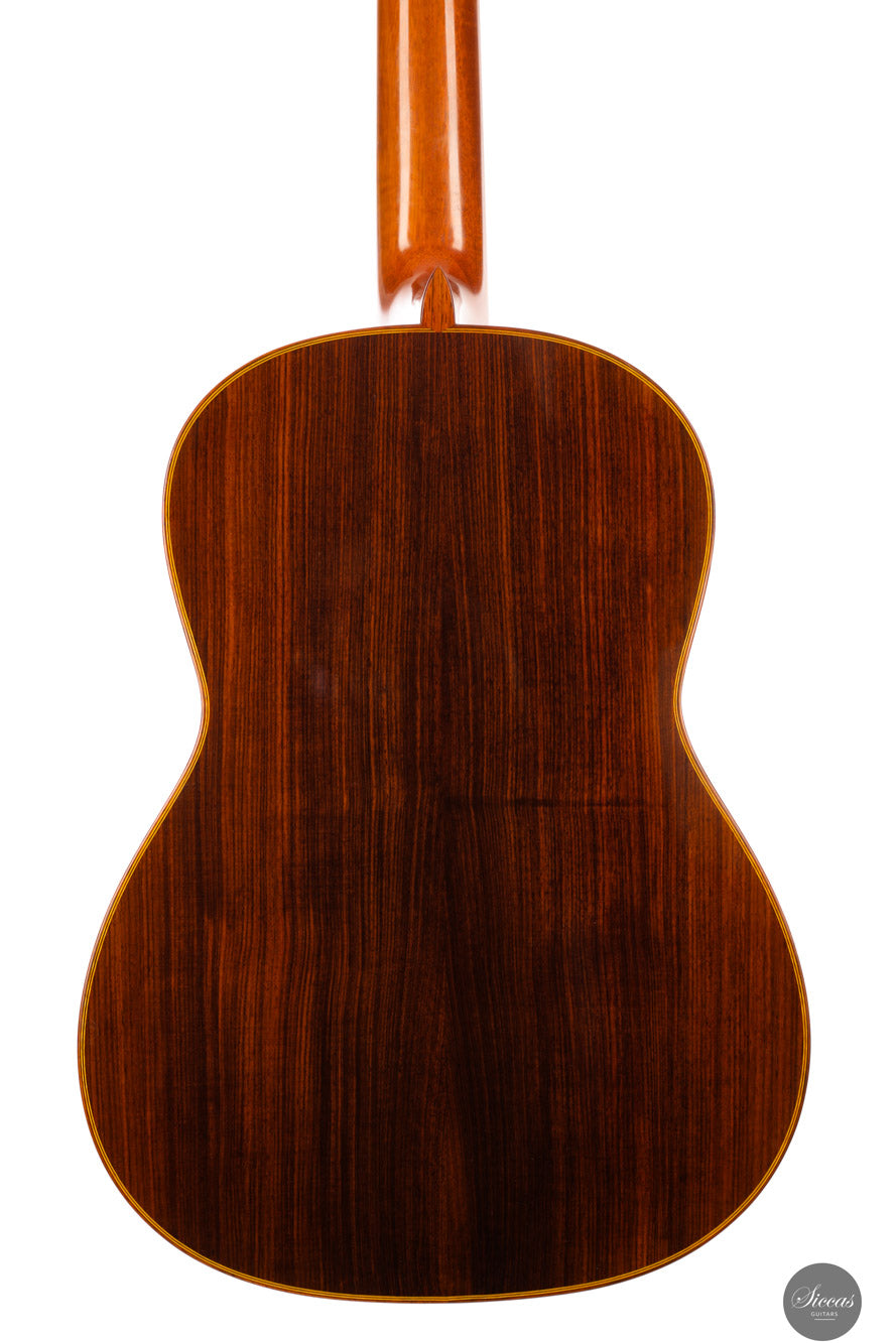 Die Falko Römmich Gitarre 2025 vereint traditionelle Baukunst mit moderner Präzision und verkörpert die Weiterführung einer renommierten Familienlinie im Gitarrenbau. Mit einer Decke aus kanadischem Zedernholz und Boden sowie Zargen aus edlem indischem Palisander bietet sie ein Klangbild von großer Wärme, Tiefe und Tragfähigkeit. Die Ansprache ist unmittelbar und differenziert, mit kräftiger Projektion und ausgewogener Balance über alle Register hinweg. Optisch besticht das Instrument durch die dunkle Eleganz des Holzes, ergänzt durch eine makellose handwerkliche Ausführung. Falko Römmichs Hintergrund als Uhrmacher zeigt sich in der hohen Präzision und Detailtreue, die jedes Element der Gitarre auszeichnet. Das Resultat ist ein Konzertinstrument, das höchsten professionellen Ansprüchen gerecht wird und sich durch Spielkomfort, Ausdrucksstärke und klangliche Präsenz gleichermaßen auszeichnet.