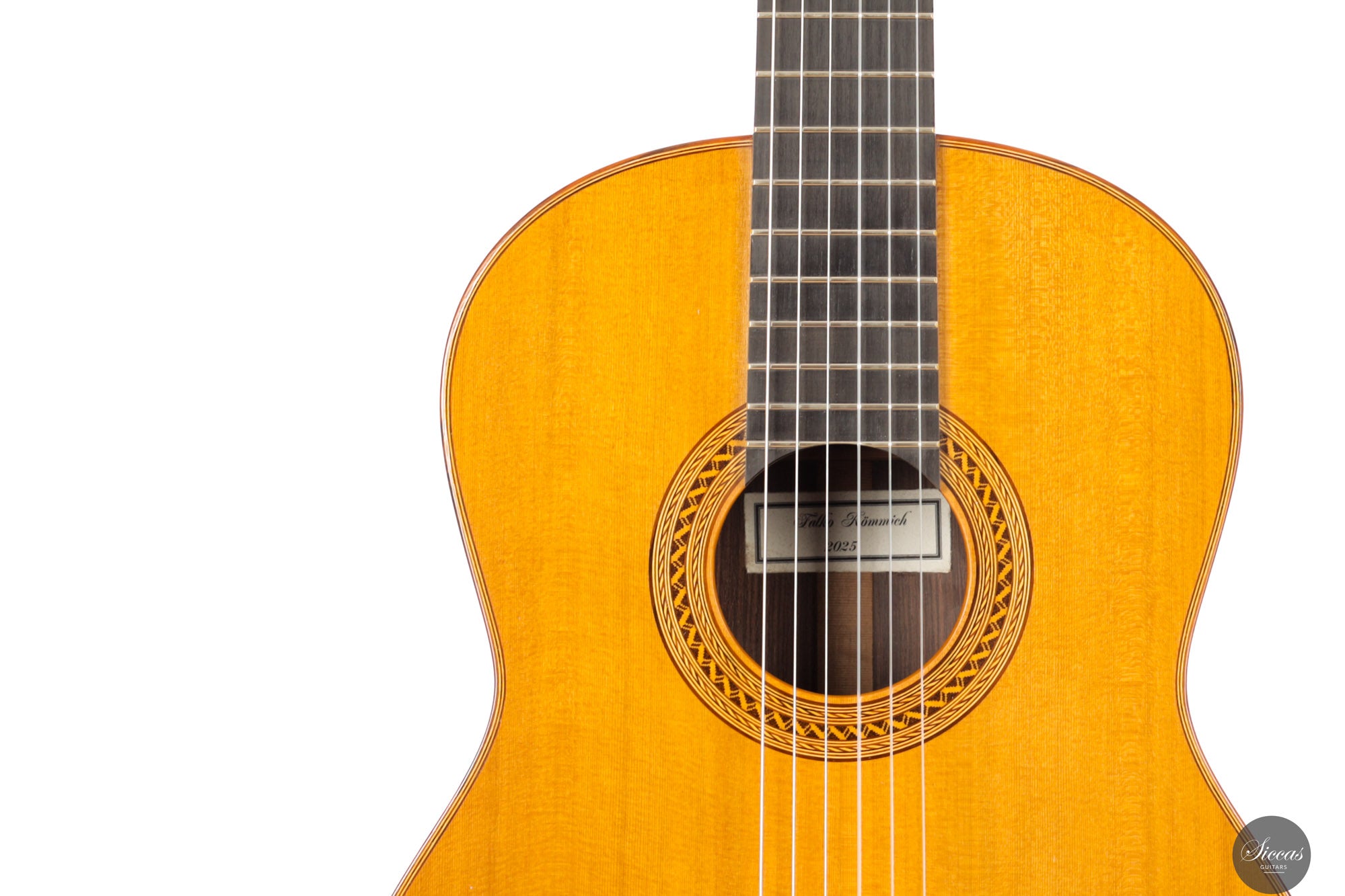 Die Falko Römmich Gitarre 2025 ist ein herausragendes Beispiel moderner Gitarrenbaukunst, die fest in einer traditionellen Familienlinie verwurzelt ist. Diese Gitarre stammt direkt aus der renommierten Werkstatt Römmich und verkörpert die gelungene Fortführung und Weiterentwicklung des handwerklichen Erbes seines Vaters. Falko Römmich bleibt dabei den Bauprinzipien und der Klangphilosophie seines Vaters treu und schafft ein Instrument, das sowohl klanglich als auch ästhetisch auf höchstem Niveau überzeugt. Die Decke besteht aus kanadischem Zedernholz und bietet eine warme Klangfarbe, außergewöhnliche Ansprache und große Ausdruckskraft. Die Zargen und der Boden aus indischem Palisander in dunkler Schokoladenfarbe verleihen dem Instrument nicht nur eine edle Optik, sondern unterstützen auch seine klangliche Tiefe. Falkos Werdegang als ehemaliger Uhrmacher zeigt sich deutlich in der präzisen Verarbeitung und der Liebe zum Detail. Jedes Element dieser Gitarre – von der Beleistung bis zum Finish – ist mit höchster Sorgfalt ausgeführt und macht sie zu weit mehr als nur einem Musikinstrument – sie ist ein Kunstwerk. Klanglich überzeugt die Gitarre durch außergewöhnliche Leichtigkeit im Spiel, enorme Lautstärke und Projektion, was sie zur idealen Wahl für Konzertgitarristen, Wettbewerbsteilnehmer und professionelle Musiker macht, die ein ausdrucksstarkes und verlässliches Instrument suchen.