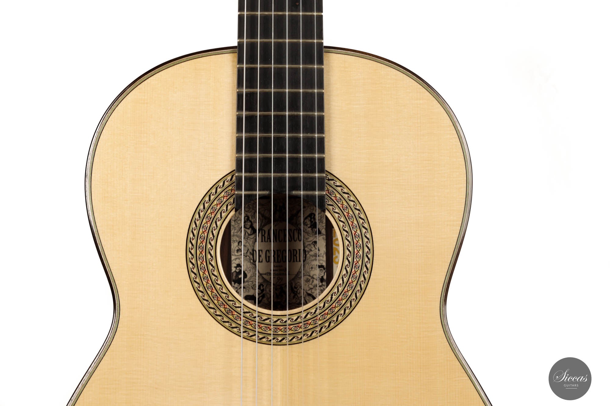 Handwerkliches Geschick gehört seit seiner Kindheit zu den angeborenen Neigungen von Francesco de Gregorio. Sein Großvater konnte praktisch alles mit seinen Händen machen, und Francesco sah ihm gerne dabei zu, wie er Stühle oder Gusseisen baute, weil er wusste, wie er mit seiner Kunst des "Machens" nützliche Dinge für den Alltag schaffen konnte. Im Alter von fünfzehn Jahren begann er, Gitarre zu spielen und brachte es sich selbst bei. Im Alter von achtzehn Jahren wandte er sich mit der gleichen Leidenschaft dem Gitarrenbau zu. Francescos Vorstellung von einem großen Instrument folgt dem ursprünglichen Weg der großen Meister der modernen Gitarre. Er strebt einen reinen, niemals erzwungenen Klang an: den Klang, der schnell durch eine leichte Konstruktion erzeugt wird, mit Respekt für das Holz und seine natürliche Zerbrechlichkeit. Beim Bau seiner Instrumente sucht er nach ästhetischer Schönheit und angemessenem Geschmack in verschiedenen Kombinationen.
