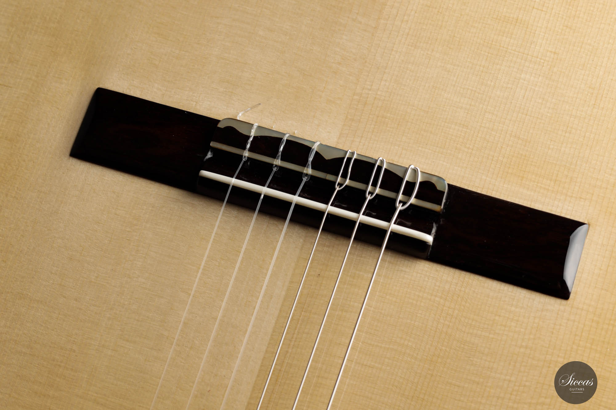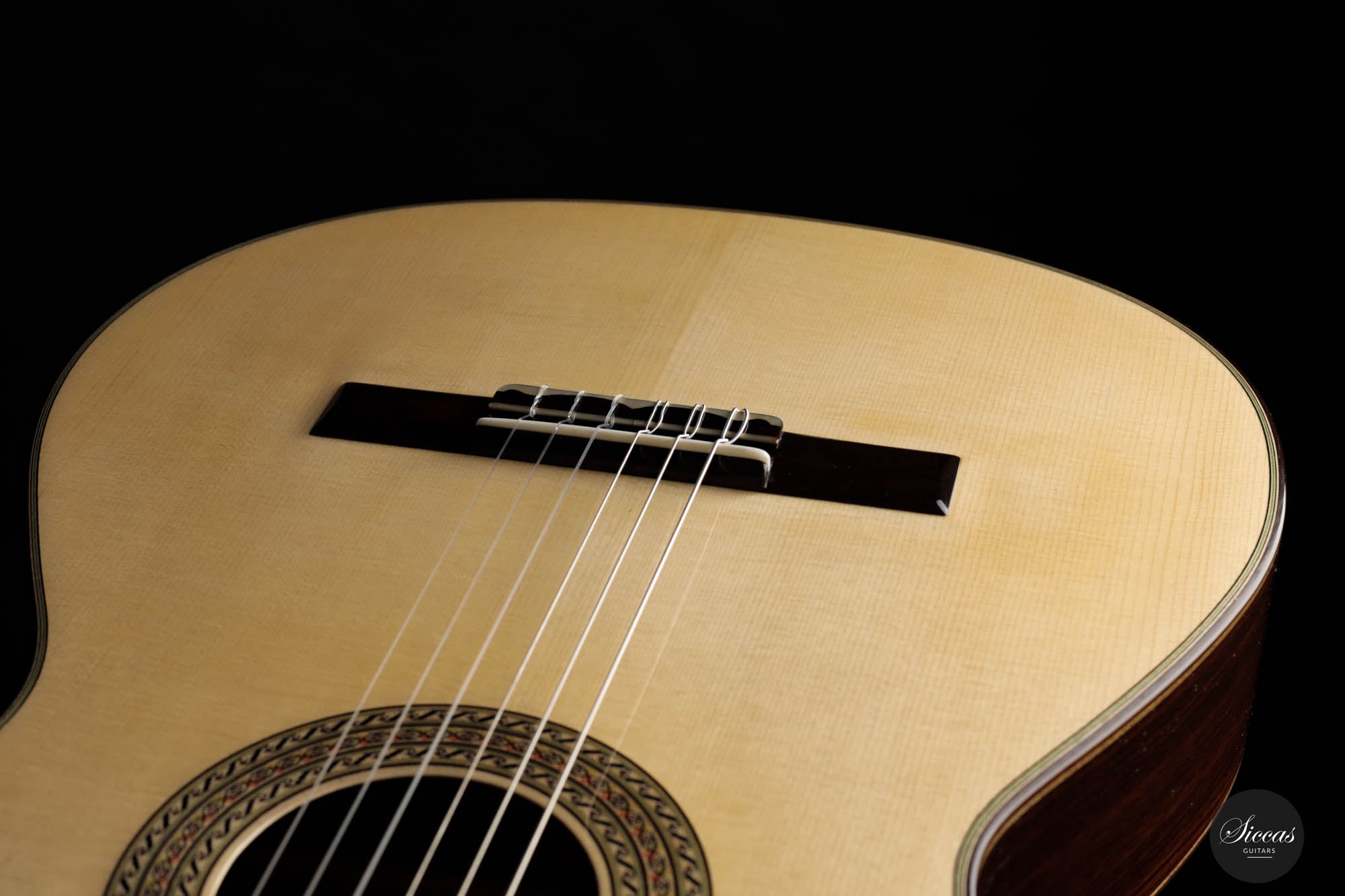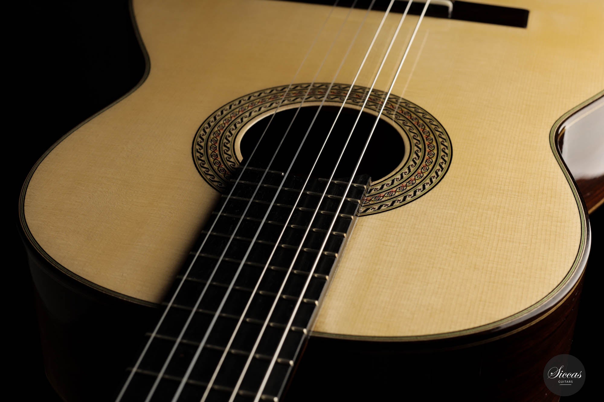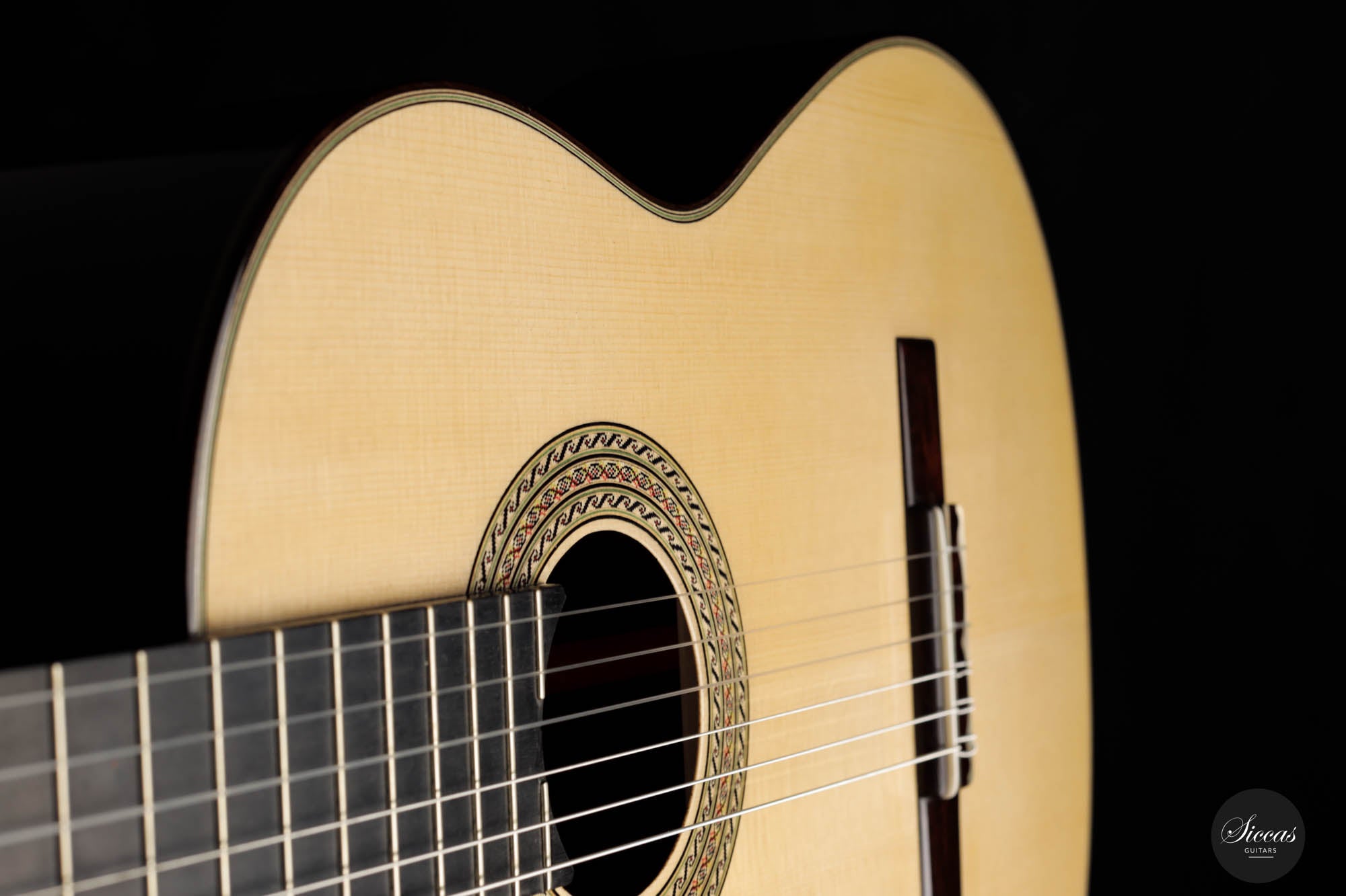 Die Francesco de Gregorio-Gitarre für die Roma Expo 2023 ist ein leuchtendes Beispiel für hochwertige Gitarrenbaukunst. Francesco hat sich mit diesem Instrument wirklich hervorgetan und sein großes Engagement und beeindruckendes Können unter Beweis gestellt. Eines der herausragenden Merkmale dieser Gitarre ist die geschnitzte Kopfplatte. Dieses Detail zeigt Francescos künstlerisches Gespür und seine Leidenschaft für seine Arbeit und macht diese Gitarre von einem einfachen Instrument zu einem Kunstwerk. Die Gitarre ist aus einer Fichtendecke und indischem Palisander für Boden und Zargen gefertigt. Diese Materialien wurden sorgfältig nach ihrer Qualität ausgewählt, und die Rosette und die Einfassungen verleihen der Gitarre einen geschmackvollen dekorativen Touch. Die Wahl der Materialien und der Verzierungen trägt zur Schönheit der Gitarre bei. Aber die Gitarre ist nicht nur schön. Sie hat auch einen fantastischen Klang. Die F-Hauptresonanz verleiht der Gitarre einen tiefen und dunklen Bass-Sound, während die Höhen klar und gesanglich sind. Dieses Gleichgewicht zwischen Bass und Diskant verleiht der Gitarre einen schönen und harmonischen Klang. Zusammenfassend lässt sich sagen, dass die Francesco de Gregorio-Gitarre, die für die Roma Expo 2023 gebaut wurde, den Gipfel dessen darstellt, was im Gitarrenbau möglich ist. Sie vereint Handwerkskunst, Kunstfertigkeit und großartigen Klang in einem attraktiven Paket.