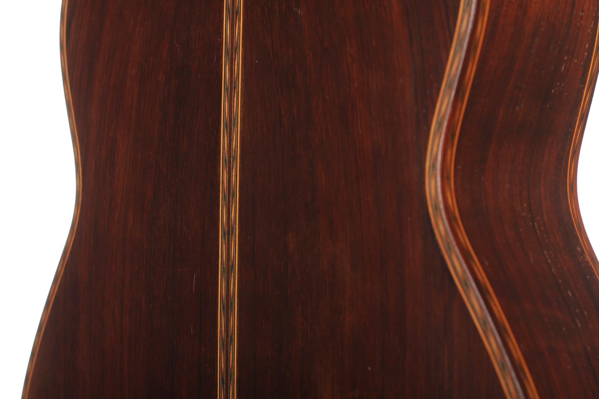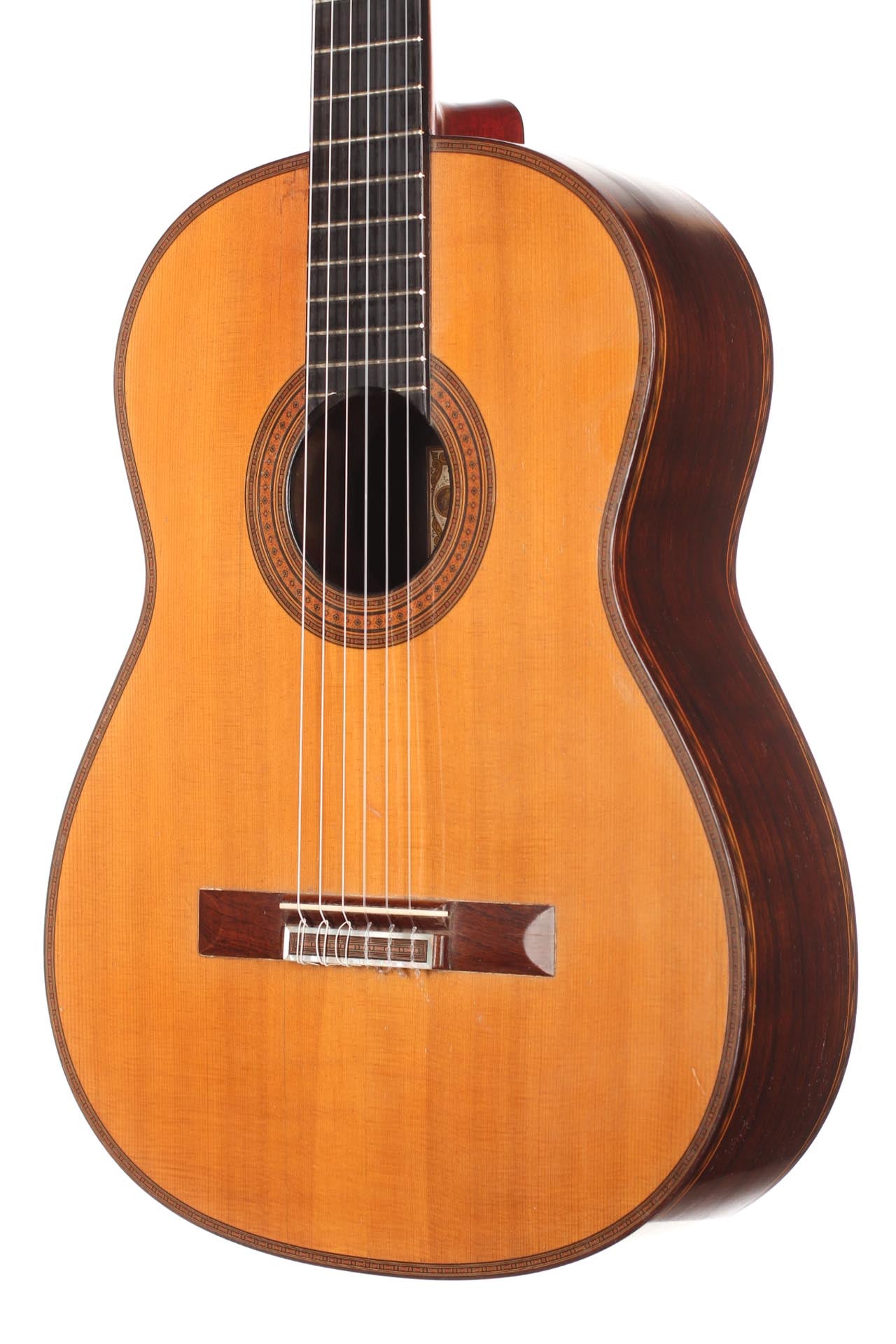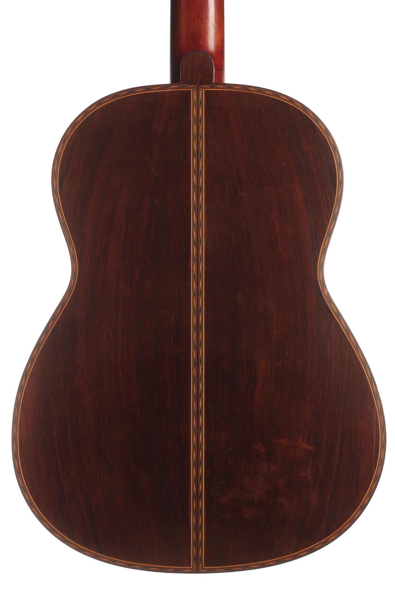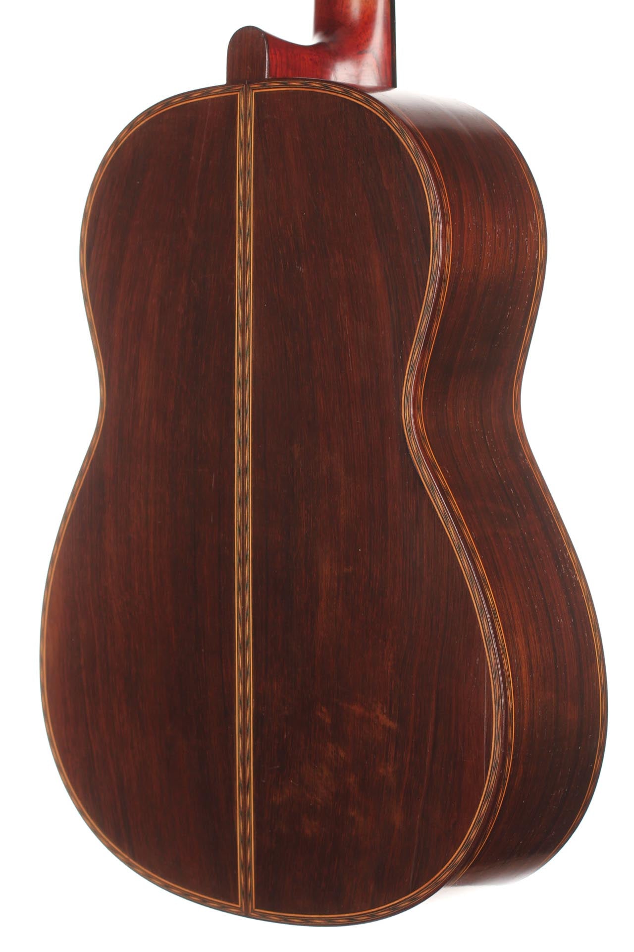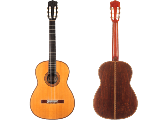 This Guitar was built in 1927 and wears the number 162. It has a beautiful spruce top and Cites pre-convention Brazilian rosewood back and sides. The top and the back have a few repaired cracks. The ebony head-plate is carved and the head wears old Fustero tuners. A very special feature of this guitar is the rosewood tornavoz that goes down to the half of the depth of the sound box. It gives the guitar extraordinary deep and warm basses, projecting easily and giving a smooth stroke-feeling. This guitar is a unique collection instrument and has the very sound one is looking for, when playing some Tarrega, Granados, Albeniz, etc.The original case is included.