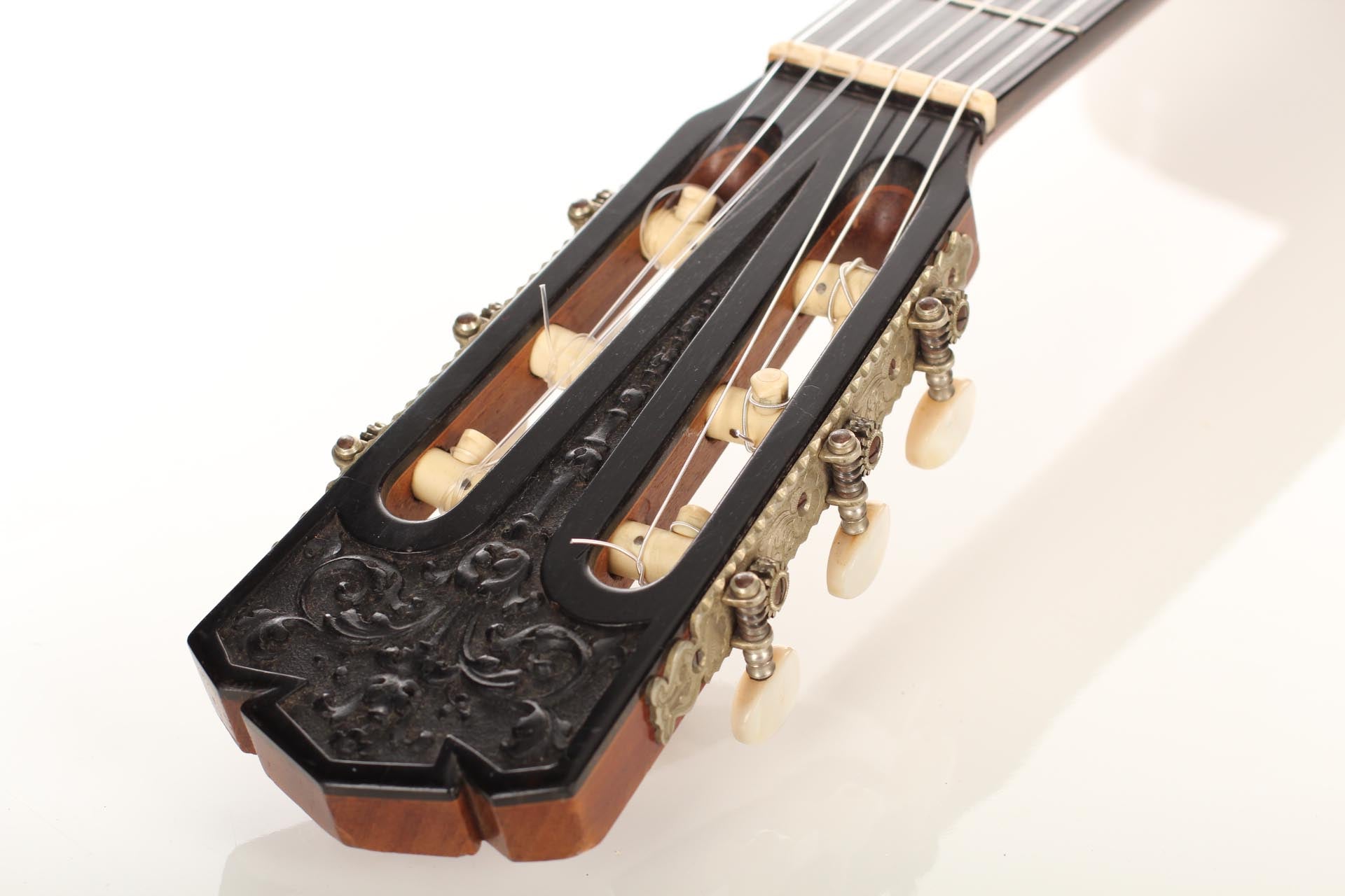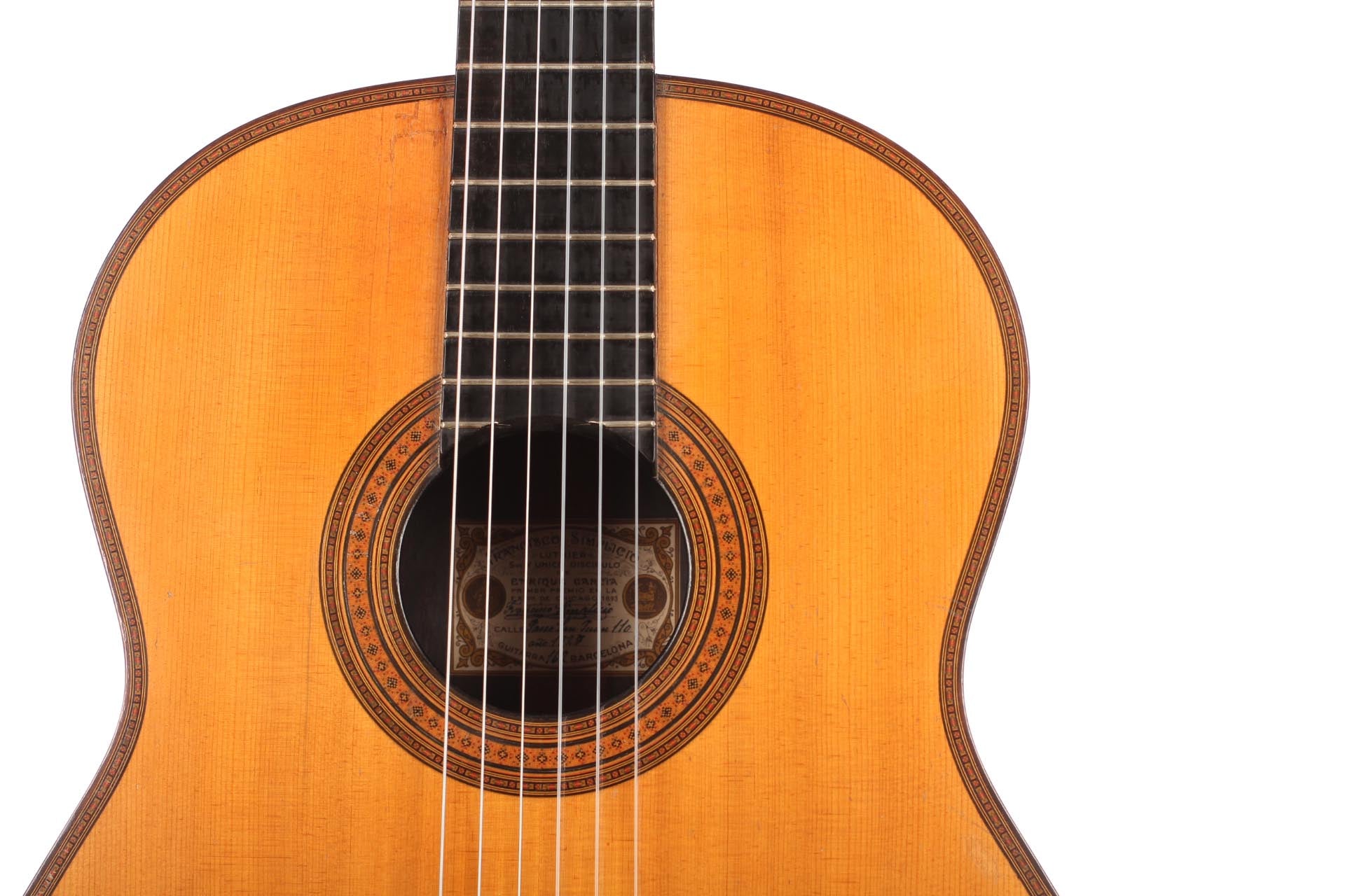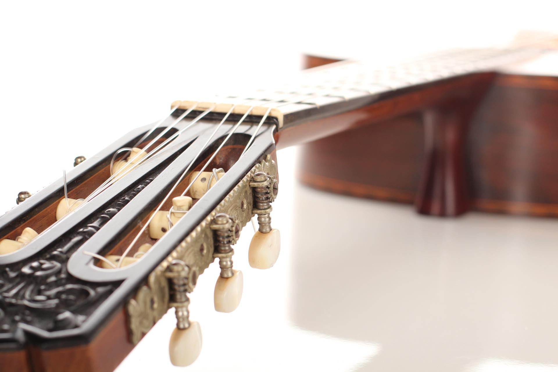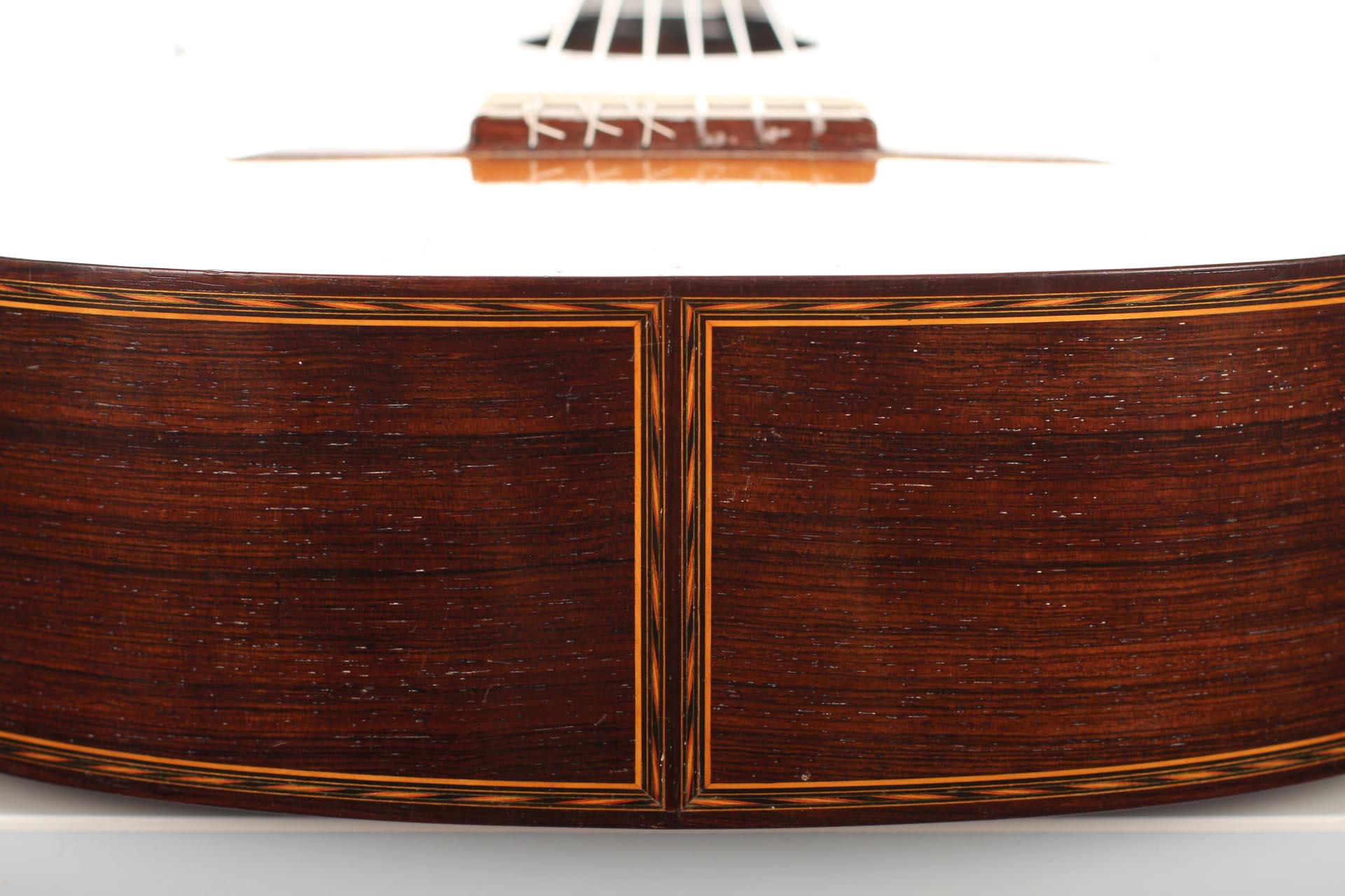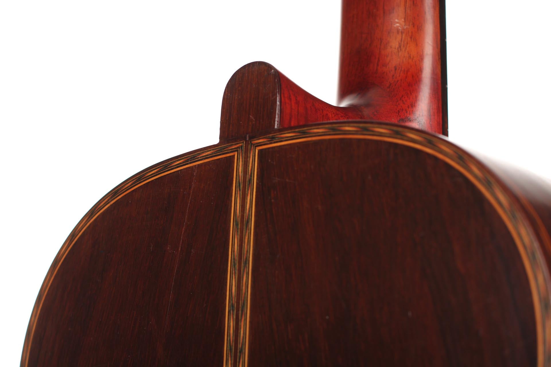 This Guitar was built in 1927 and wears the number 162. It has a beautiful spruce top and Cites pre-convention Brazilian rosewood back and sides. The top and the back have a few repaired cracks. The ebony head-plate is carved and the head wears old Fustero tuners. A very special feature of this guitar is the rosewood tornavoz that goes down to the half of the depth of the sound box. It gives the guitar extraordinary deep and warm basses, projecting easily and giving a smooth stroke-feeling. This guitar is a unique collection instrument and has the very sound one is looking for, when playing some Tarrega, Granados, Albeniz, etc.The original case is included.