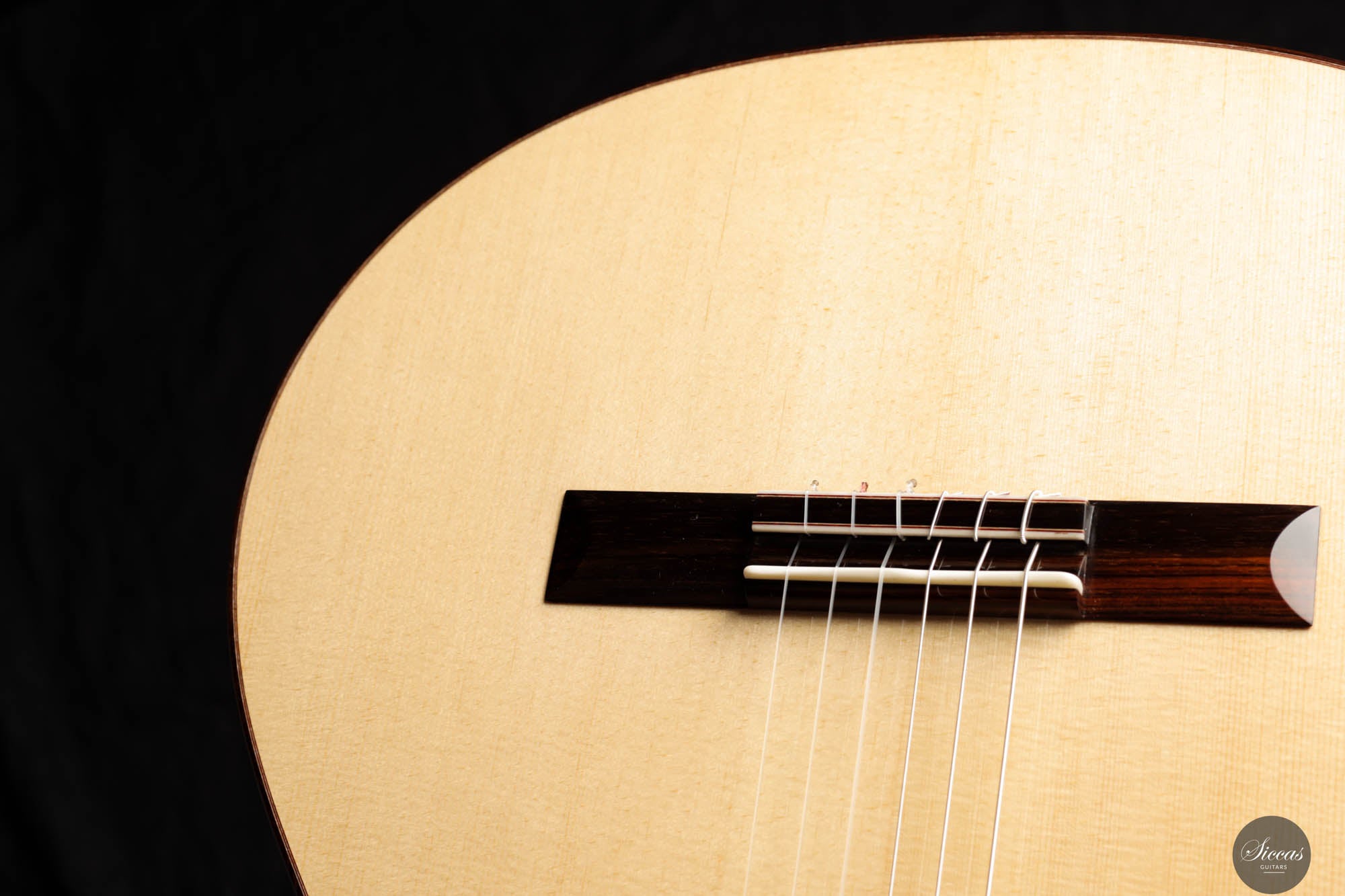 Mit einem markanten Gitter-Bracing-System ist die Decke dieser Gitarre bemerkenswert ansprechbar. Jeder gezupfte Ton erwacht zum Leben und resoniert mit einer fast ätherischen Tiefe und Klarheit. Die Höhen sind reich und kraftvoll, sie resonieren mit einer erfahrenen und harmonischen Klangfarbe, die den Charakter des Instruments definiert.