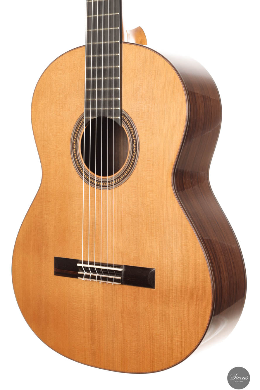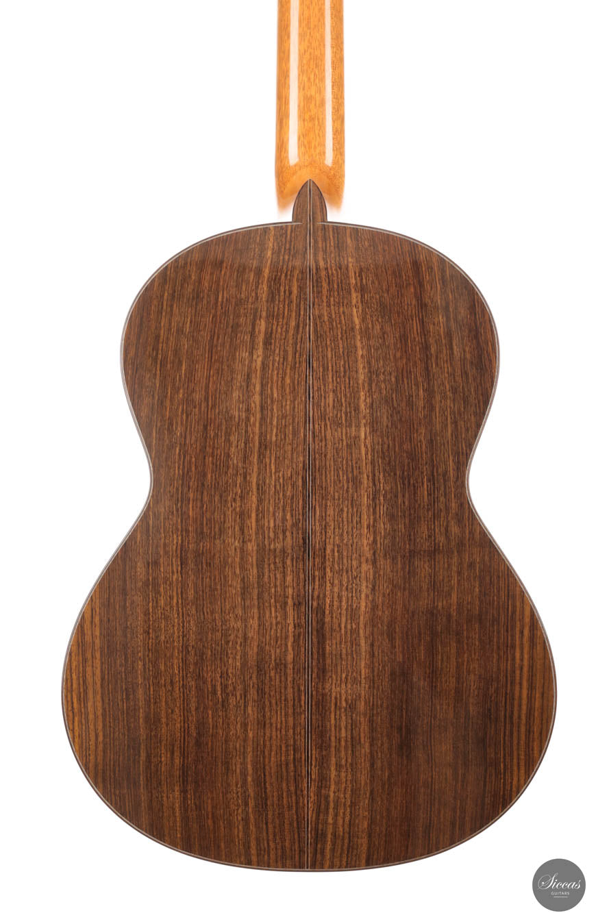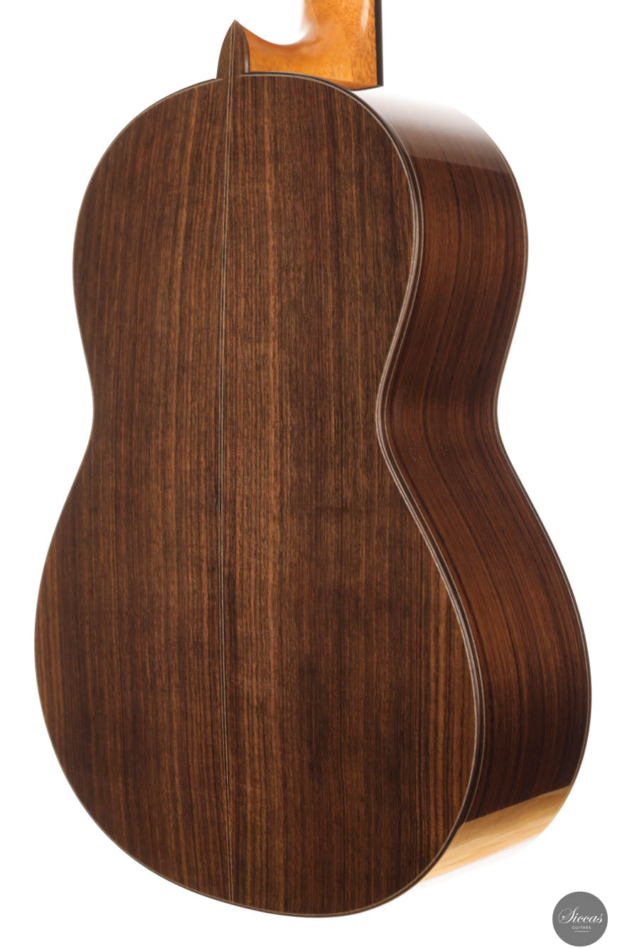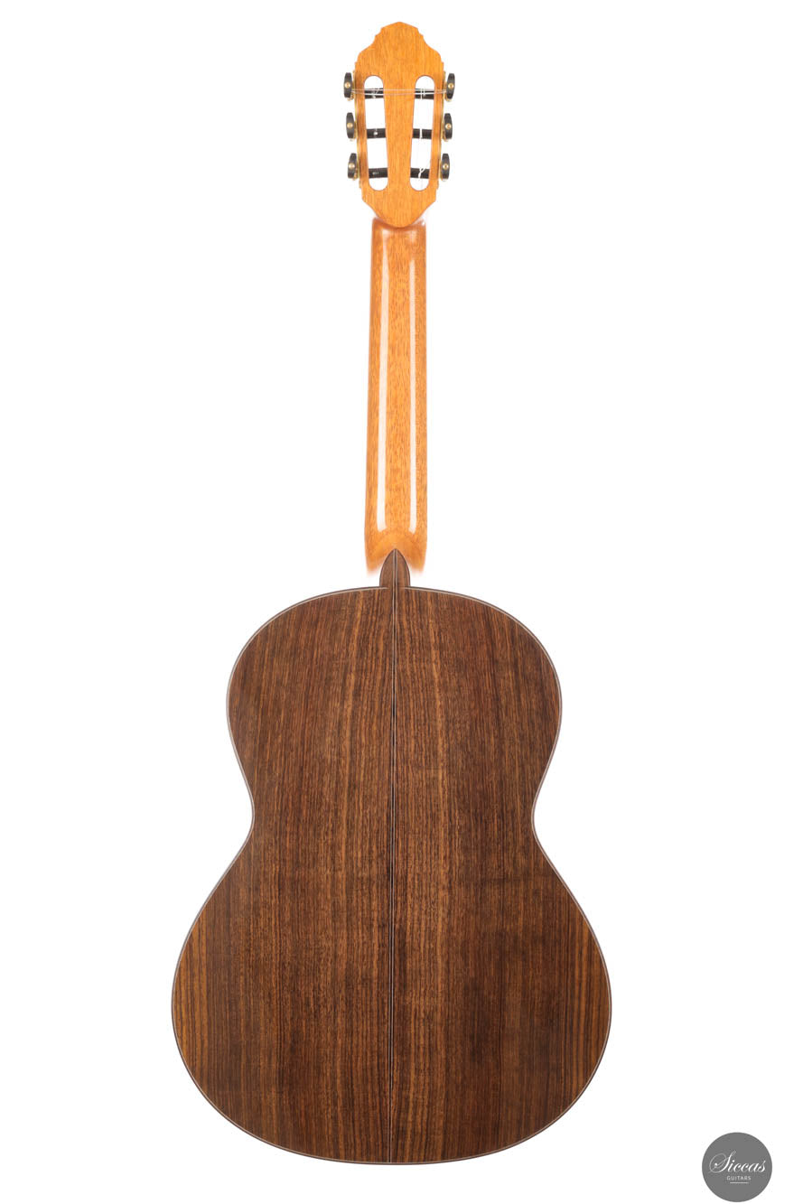 Diese Gitarre, Nummer 96, zeigt Leonards Konstanz in Bezug auf Klang- und Verarbeitungsqualität. Mit einer Zederndecke sowie Rücken und Zargen aus indischem Palisander strahlt dieses Instrument eine Eleganz und klangliche Tiefe aus, die sowohl fesselnd als auch anspruchsvoll ist. Die Gitterbeleistung sorgt für eine besonders reaktionsfähige Decke, die jede Note mit bemerkenswerter Resonanz und einem dynamischen Klangspektrum verstärkt. Mit reich resonanten Höhen und einer breiten Klangpalette lädt die Gitarre zu einer intimen Verbindung mit dem Spieler ein, was präzisen Ausdruck und einen nuancierten Dialog in jeder Aufführung ermöglicht.