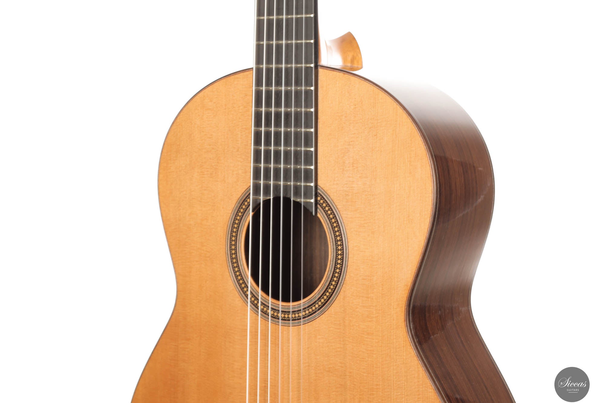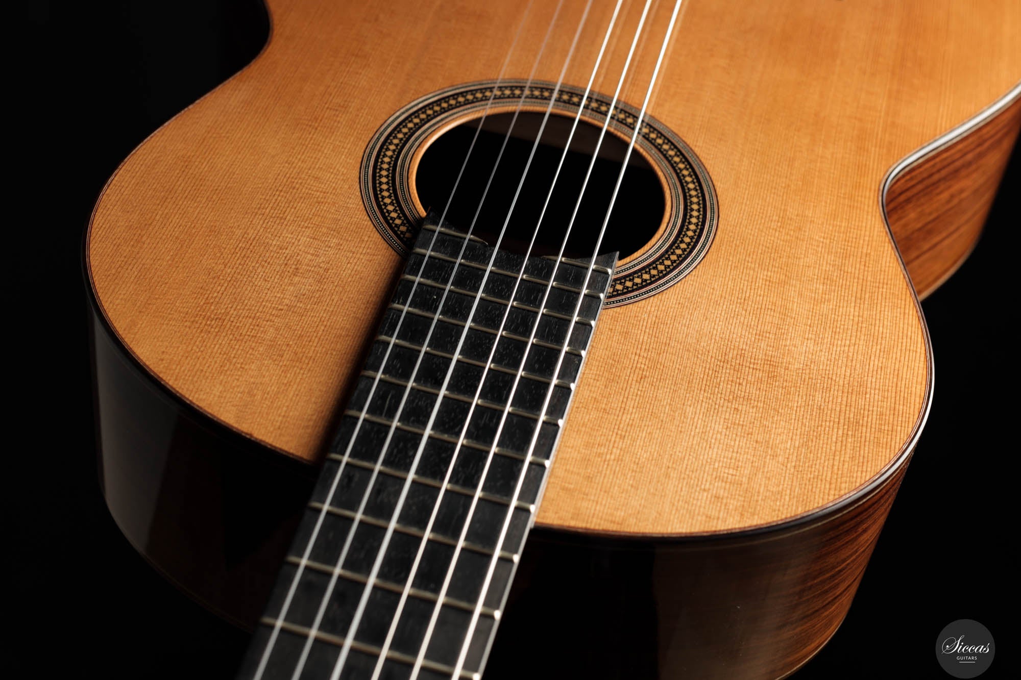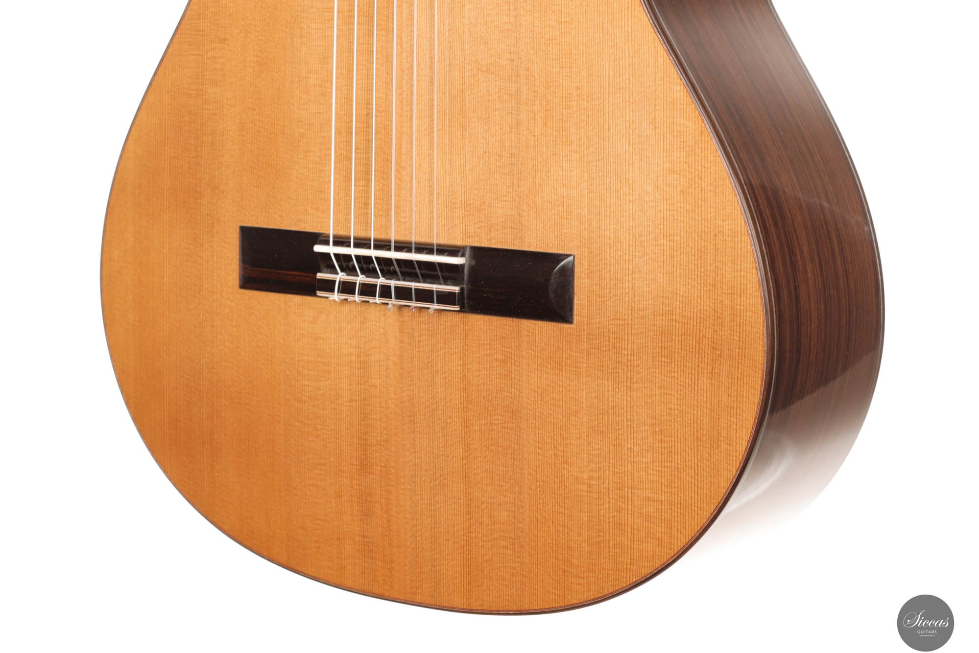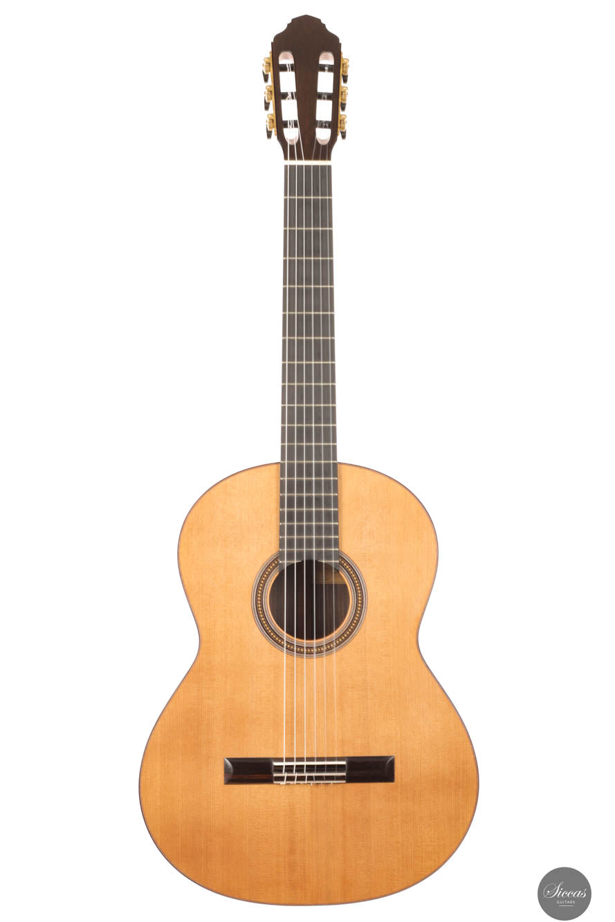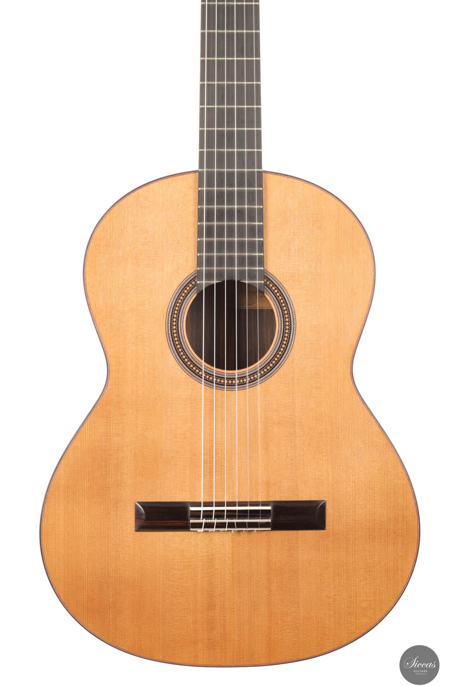 Diese Gitarre, Nummer 96, zeigt Leonards Konstanz in Bezug auf Klang- und Verarbeitungsqualität. Mit einer Zederndecke sowie Rücken und Zargen aus indischem Palisander strahlt dieses Instrument eine Eleganz und klangliche Tiefe aus, die sowohl fesselnd als auch anspruchsvoll ist. Die Gitterbeleistung sorgt für eine besonders reaktionsfähige Decke, die jede Note mit bemerkenswerter Resonanz und einem dynamischen Klangspektrum verstärkt. Mit reich resonanten Höhen und einer breiten Klangpalette lädt die Gitarre zu einer intimen Verbindung mit dem Spieler ein, was präzisen Ausdruck und einen nuancierten Dialog in jeder Aufführung ermöglicht.