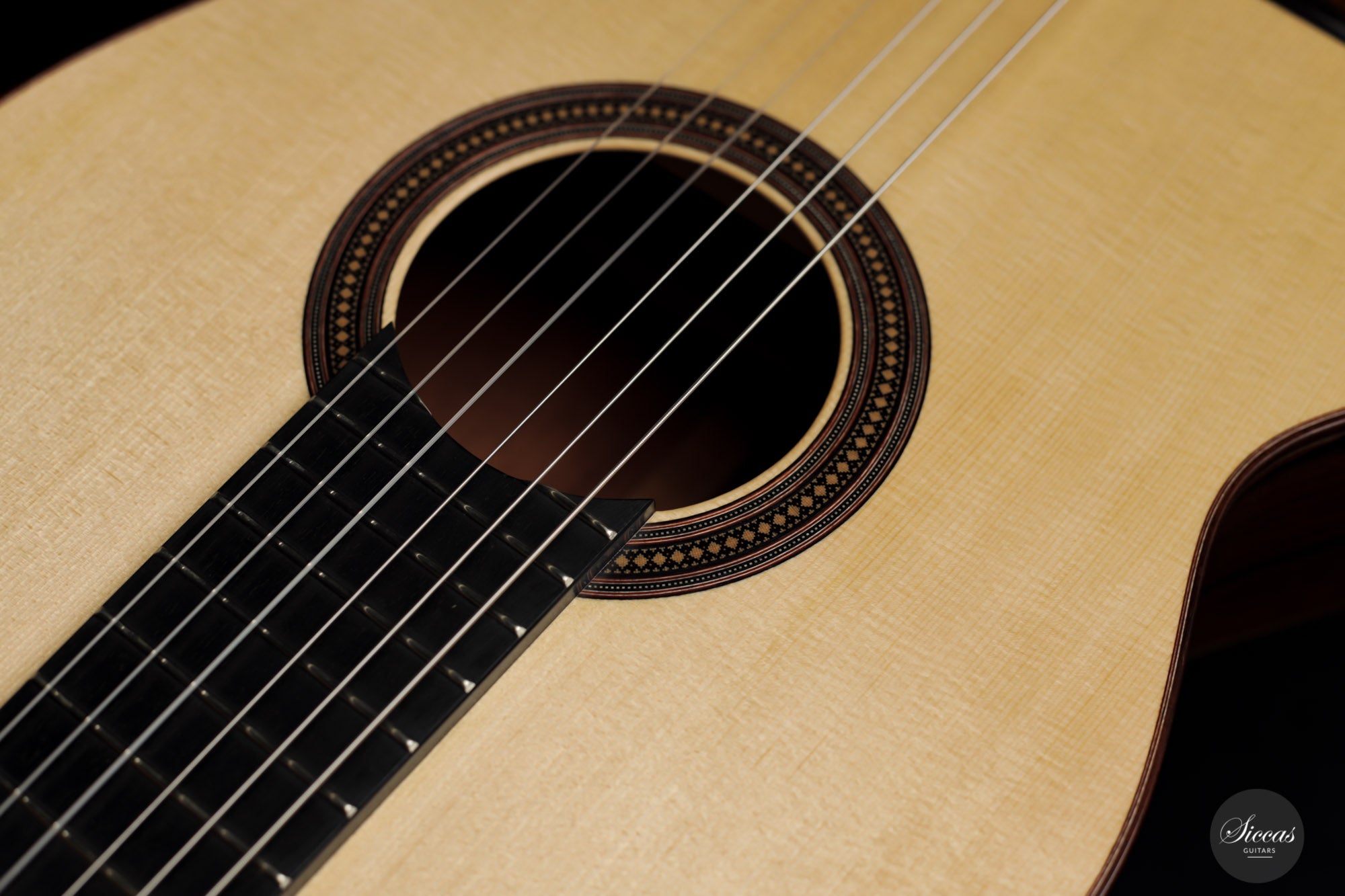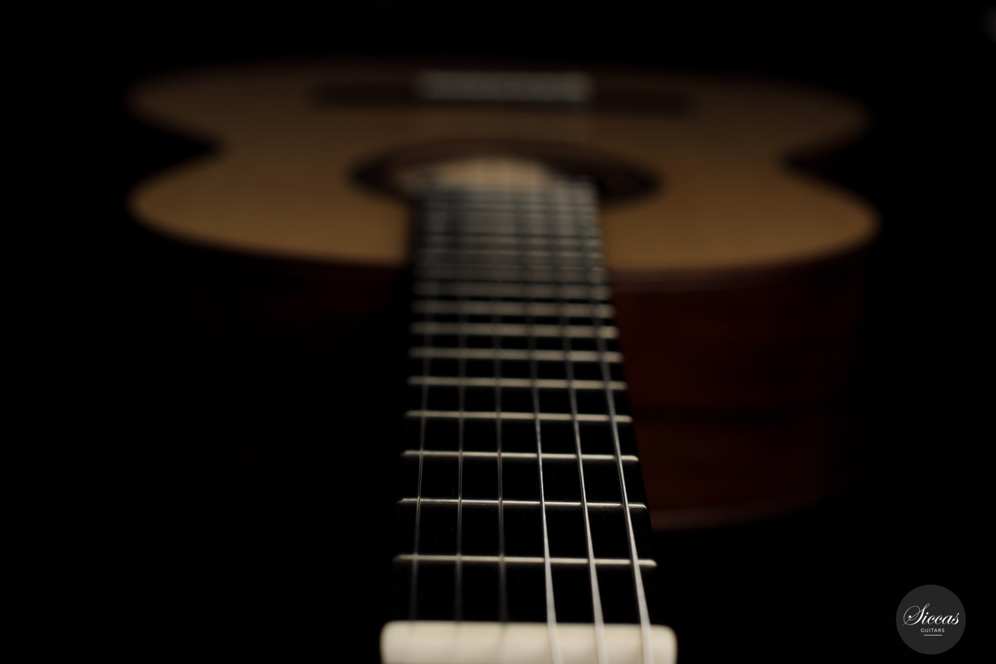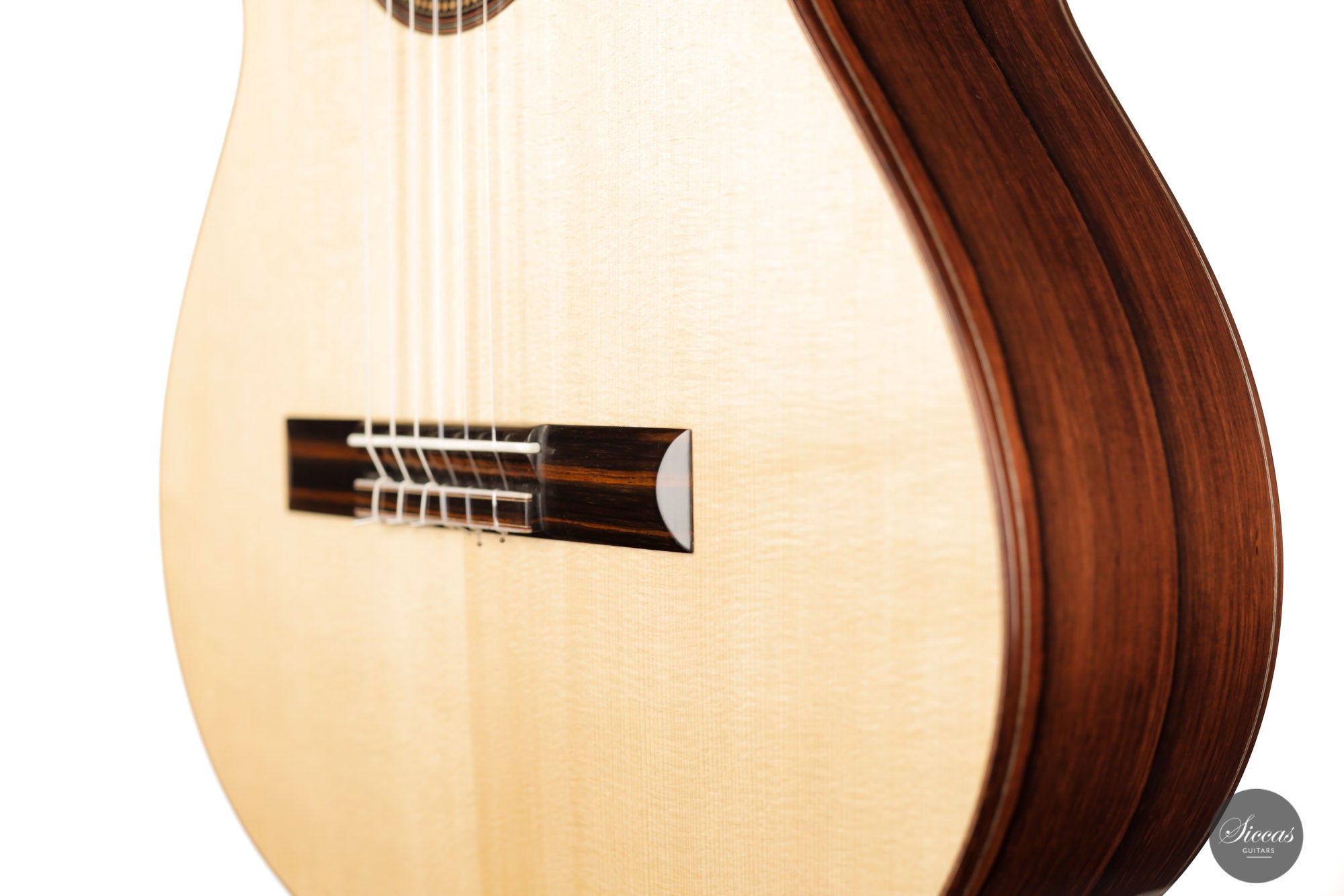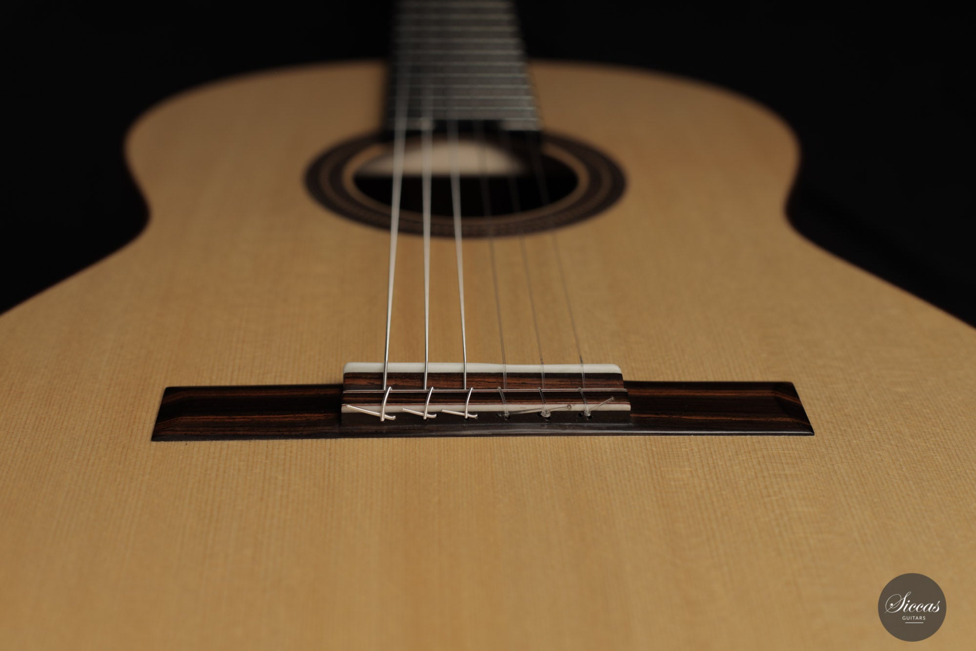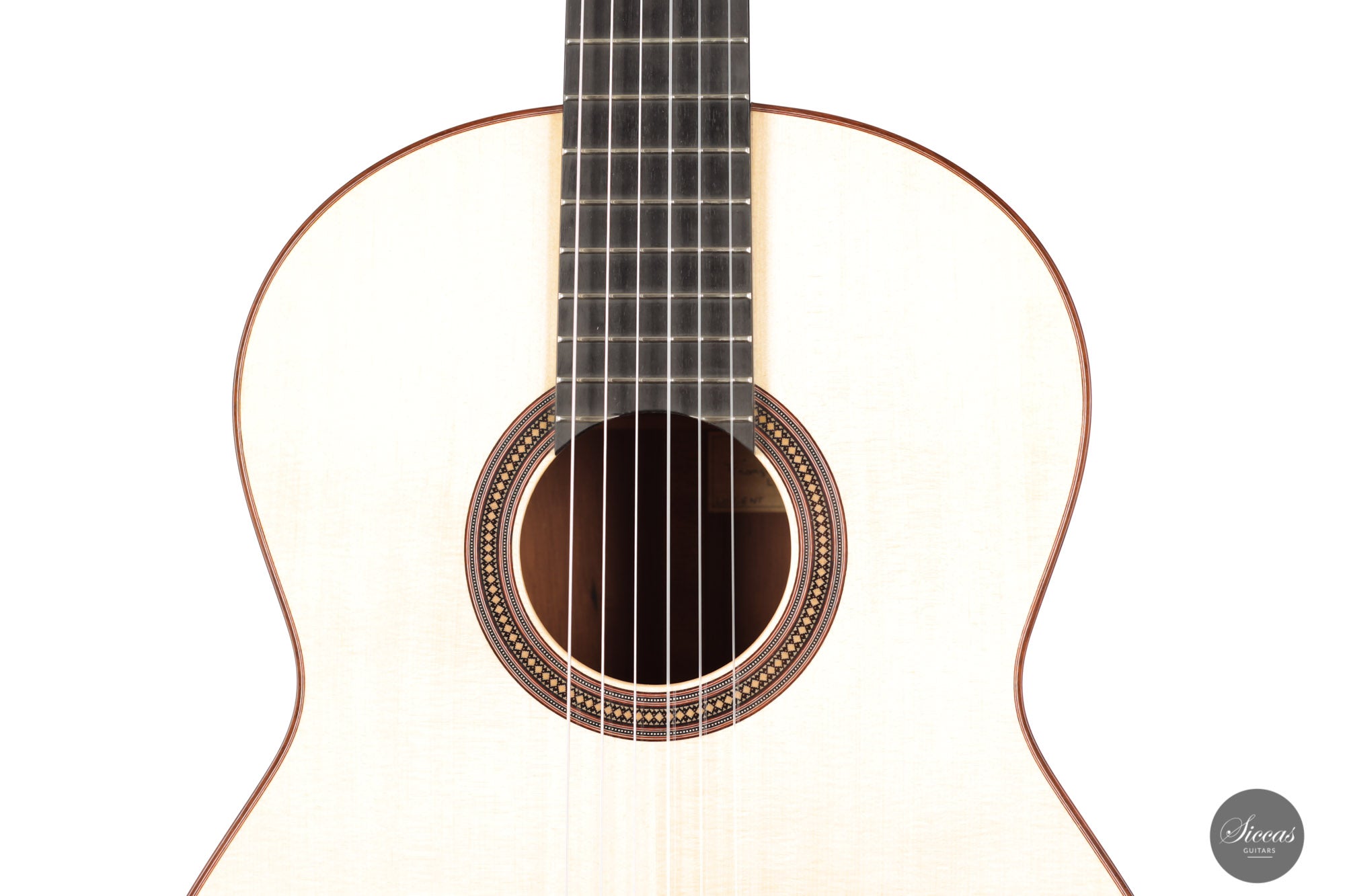 Es ist immer eine Freude, Gitarren von Francois zu erhalten. Dieses Modell ist das erste mit 64cm Mensur, das er für uns gebaut hat und wir sind wieder einmal begeistert. Trotz der etwas kürzeren Mensur büßt dieses Modell nichts von seiner Ausdruckskraft und Präsenz ein, sondern ist noch angenehmer und komfortabler zu spielen. Die Offenheit des Tons und die Reaktionsfähigkeit der Decke sind erstaunlich. Die Höhen besitzen eine beachtliche Präsenz und einen klaren und raffinierten Klangcharakter. Auch die Vielfalt der Klangfarben ist auffällig gut sowie der große Dynamikbereich dieser Gitarre.