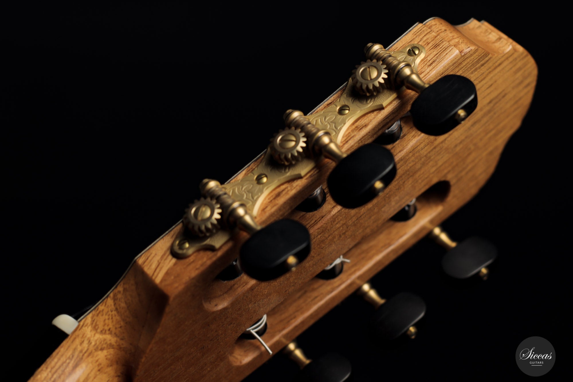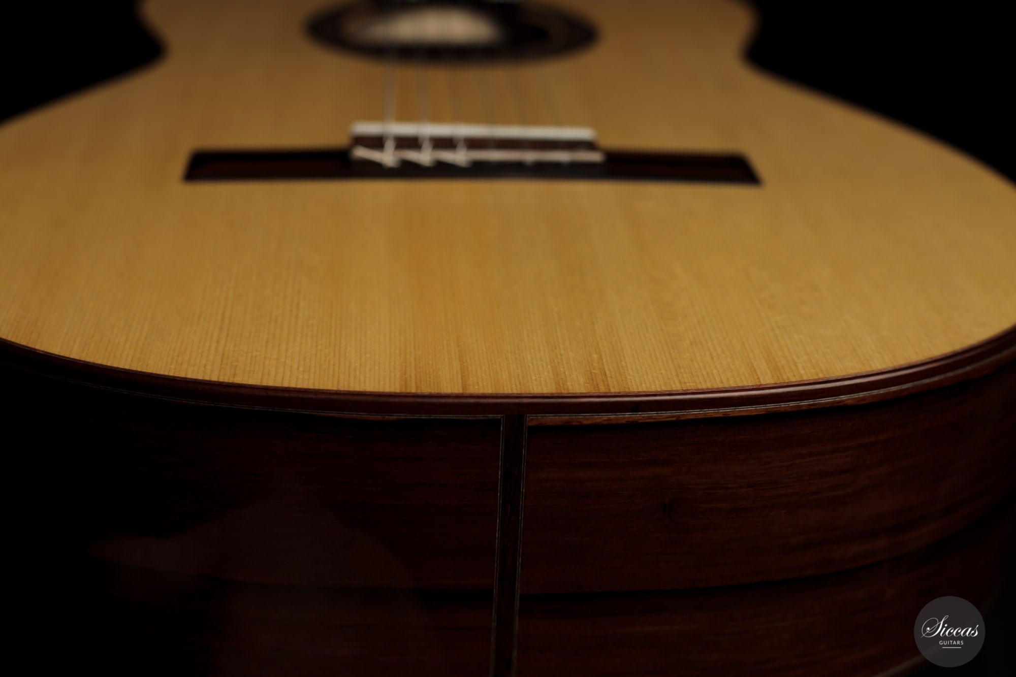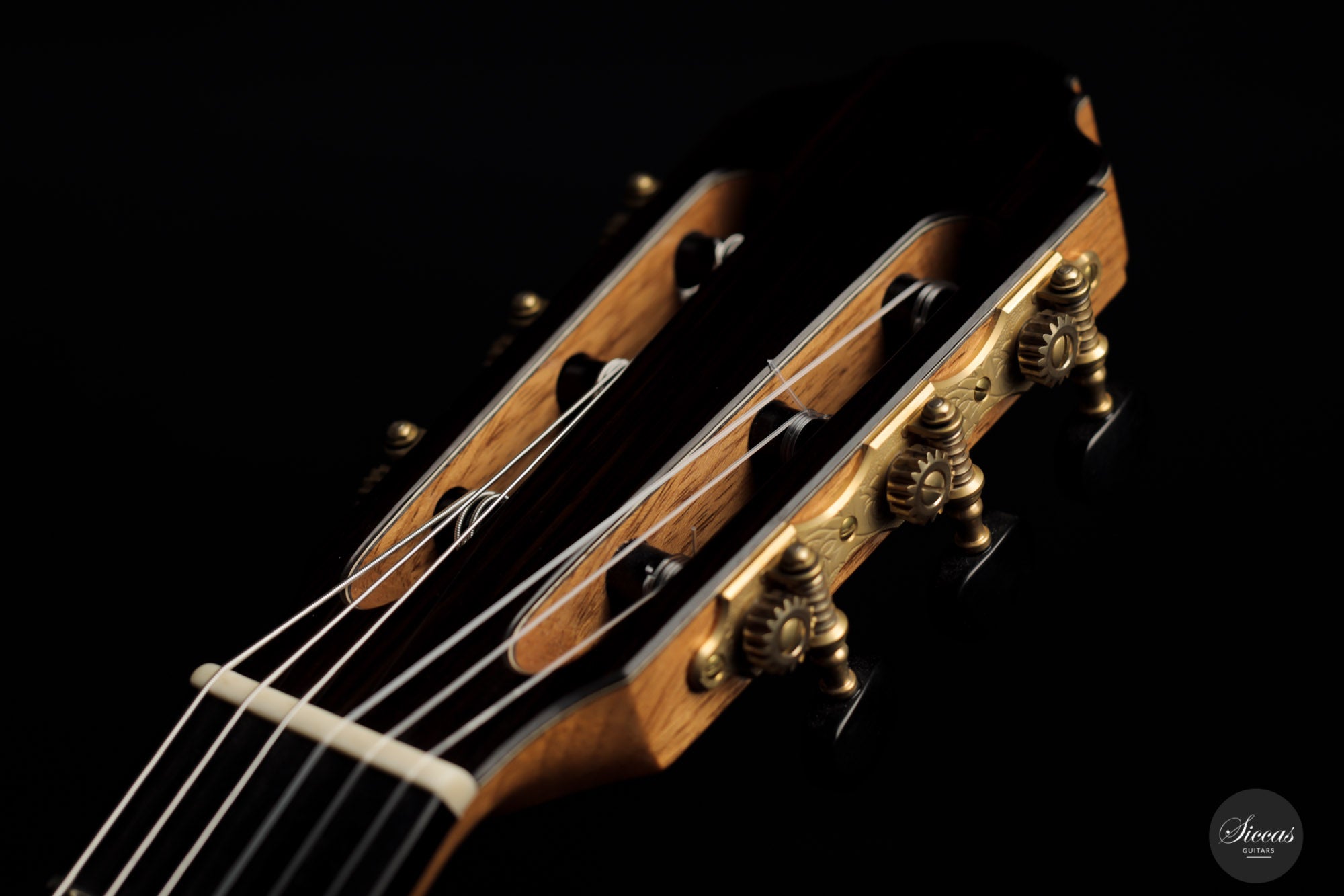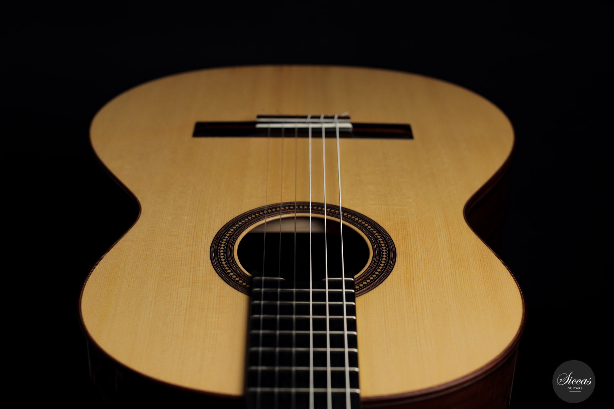 Es ist immer eine Freude, Gitarren von Francois zu erhalten. Dieses Modell ist das erste mit 64cm Mensur, das er für uns gebaut hat und wir sind wieder einmal begeistert. Trotz der etwas kürzeren Mensur büßt dieses Modell nichts von seiner Ausdruckskraft und Präsenz ein, sondern ist noch angenehmer und komfortabler zu spielen. Die Offenheit des Tons und die Reaktionsfähigkeit der Decke sind erstaunlich. Die Höhen besitzen eine beachtliche Präsenz und einen klaren und raffinierten Klangcharakter. Auch die Vielfalt der Klangfarben ist auffällig gut sowie der große Dynamikbereich dieser Gitarre.